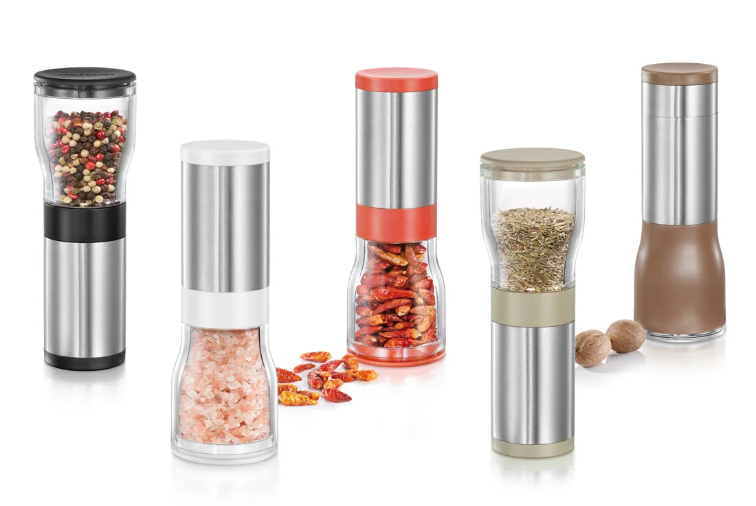 Mills for milling pepper, salt, chili peppers, dried herbs/spices (marjoram, oregano, thyme, rosemary, caraway seeds, etc.) and nutmeg. A special milling mechanism has been developed for each of the mills for best functioning: ceramic for pepper and salt mills and stainless steel for the other mills. The mills can be set aside with any side facing down, have a cap for intercepting spice residues and are identified by colours for ease of reference