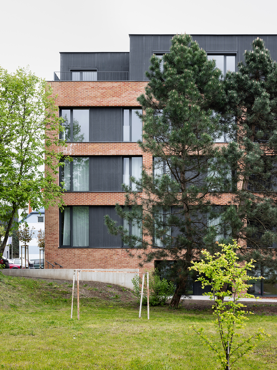 The original, three-story, L-shaped ground plan residential building with an attic was covered with a gable roof. The change in the architectural expression consisted primarily of the removal of the gable roof and its replacement by a superstructure with a flat roof with a high proportion of roof terraces.