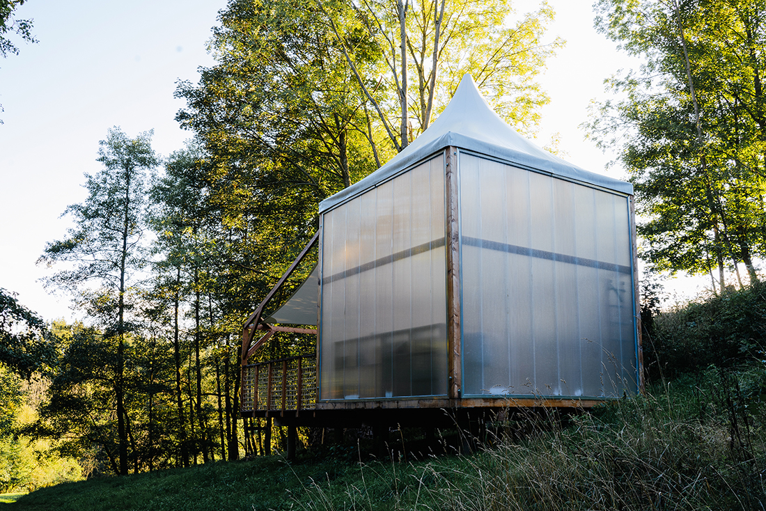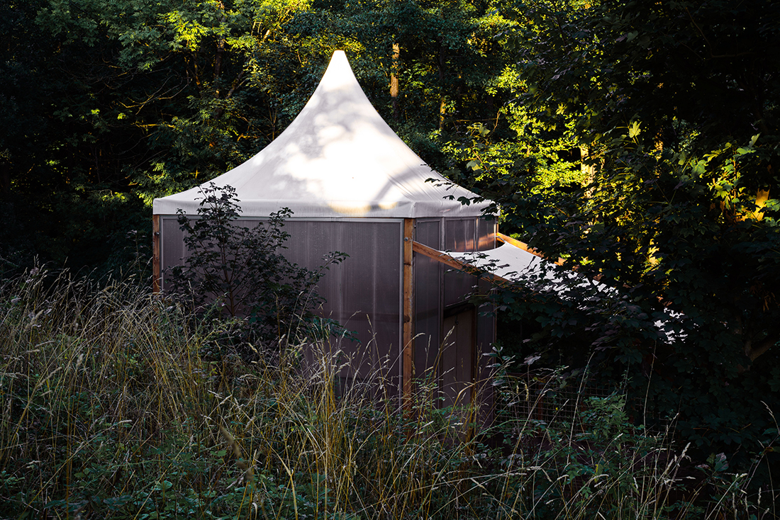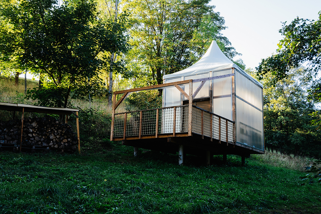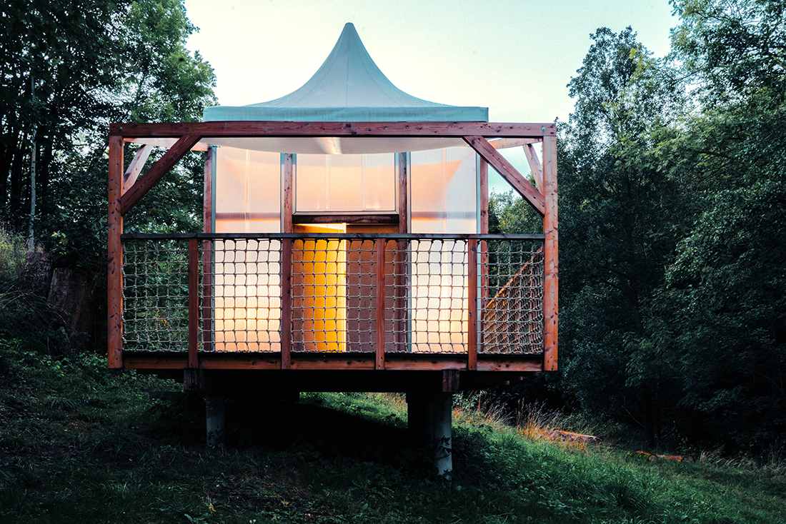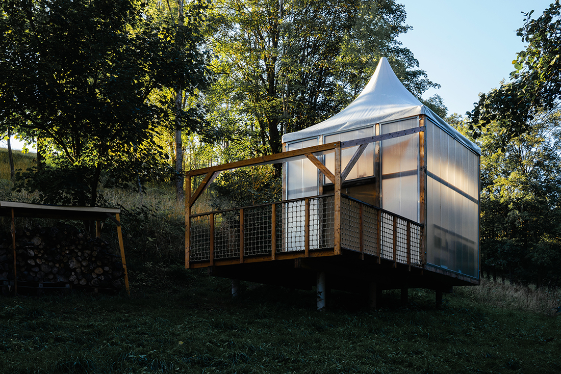 The tent roof, made of tarpaulin, complements the symmetrical composition of the main structure and exaggerates the form of the iconic Ještěd peak. This is an economical self-built structure. The greenhouse measures 8,2 by 4,1 meters, with a height of 4,55 meters. The supporting structure is made of larch wood, while the glazing consists of Rodeca translucent thermal insulation panels with aluminum anchor profiles. The roof is tented and constructed from tarpaulin, which can be temporarily removed using screw spikes. The entrance to the greenhouse is also covered with tarpaulin.