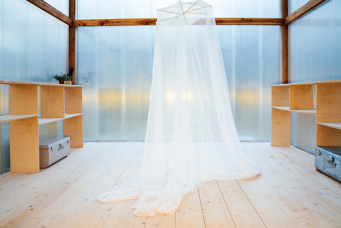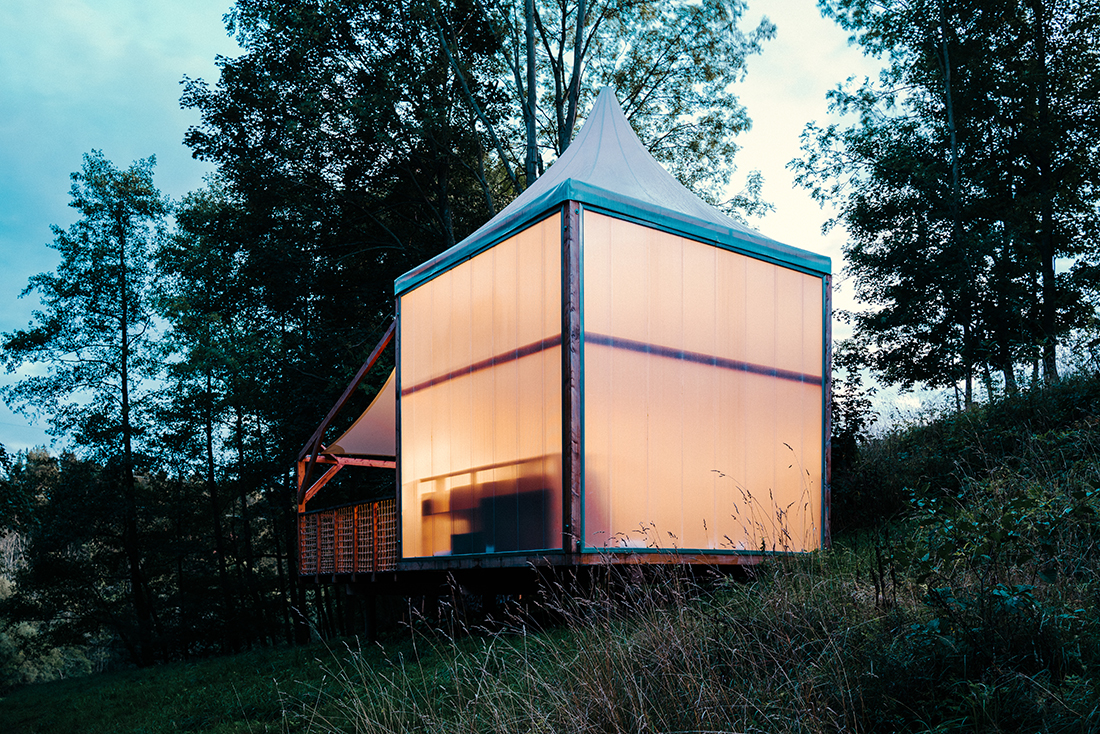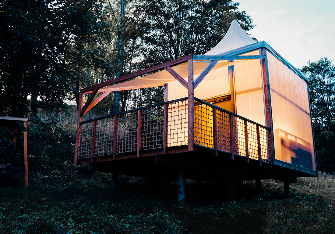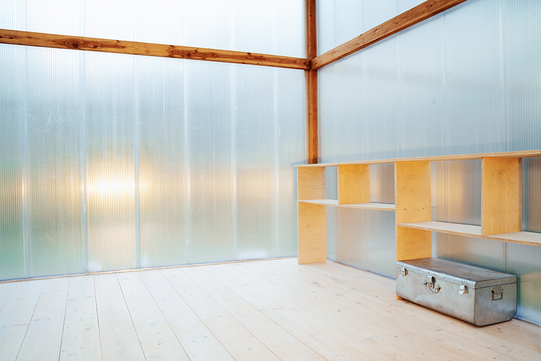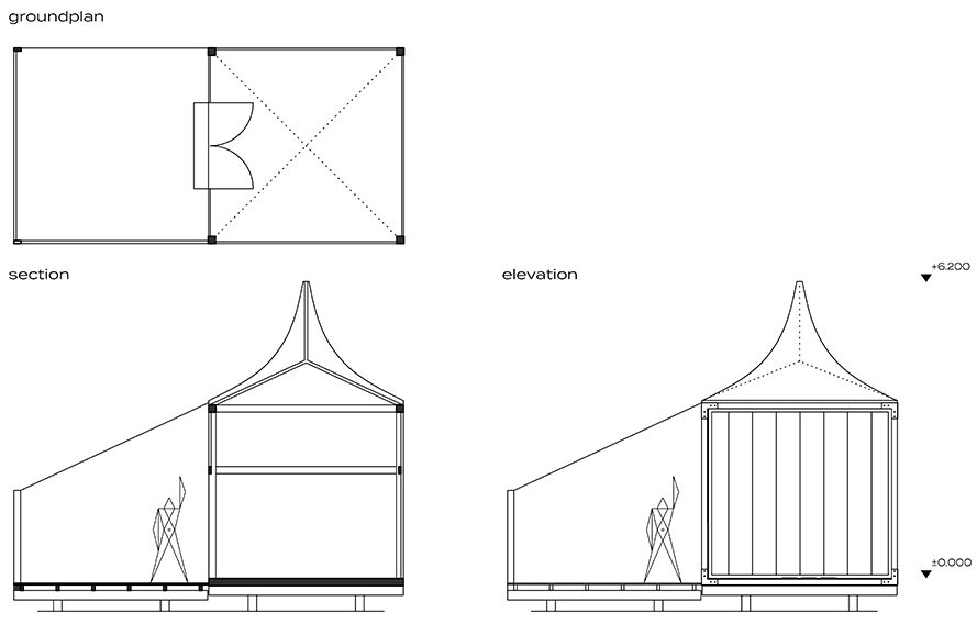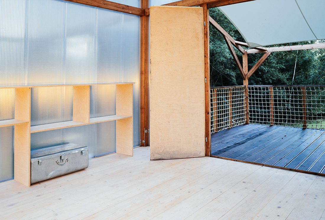 The tent roof, made of tarpaulin, complements the symmetrical composition of the main structure and exaggerates the form of the iconic Ještěd peak. This is an economical self-built structure. The greenhouse measures 8,2 by 4,1 meters, with a height of 4,55 meters. The supporting structure is made of larch wood, while the glazing consists of Rodeca translucent thermal insulation panels with aluminum anchor profiles. The roof is tented and constructed from tarpaulin, which can be temporarily removed using screw spikes. The entrance to the greenhouse is also covered with tarpaulin.