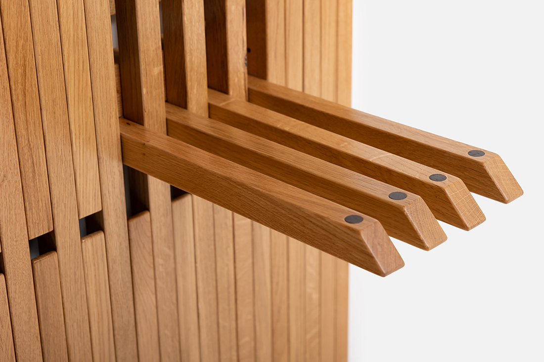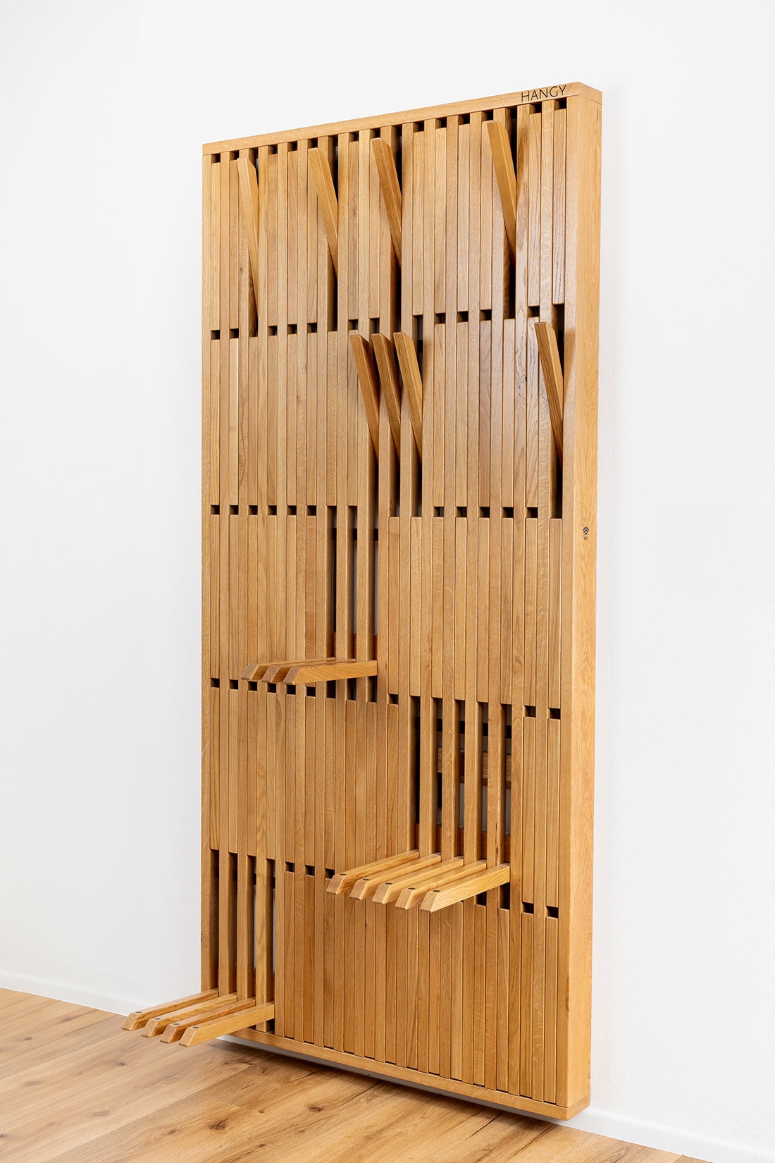 Hangy is a multifunctional furniture system that combines hangers, a seating bench, shelves, shoe storage, and an integrated NFC chip, enabling digital interaction. Its minimalist design, crafted from solid oak, conveys the warmth of natural materials while ensuring exceptional durability. A single stick supports over 80 kg, certified by EU standards (SIST EN).