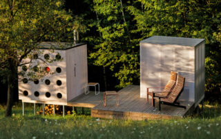 On the upper floor is the living area consisting of several layers or shells; at its core, the staircase which also houses a toilet and storage room. Around this solid core of exposed concrete is the living and dining area, bright and open all all the way up to the ridge. The outermost shell consists of a covered terrace running all around the house, allowing for a smooth transition from the inside of the house to its natural surroundings. A screen façade of vertical and horizontal spruce slats, enclosing the room-high glass or spray plaster surfaces on the inside, gives the building a homogenous look. This way we created a wide spectrum of translucence and transparency which we gradually and individually adapted to each room, its purpose and the level of desired intimacy, preventing unwanted insights while making beautiful outlooks part of everyday life and living.