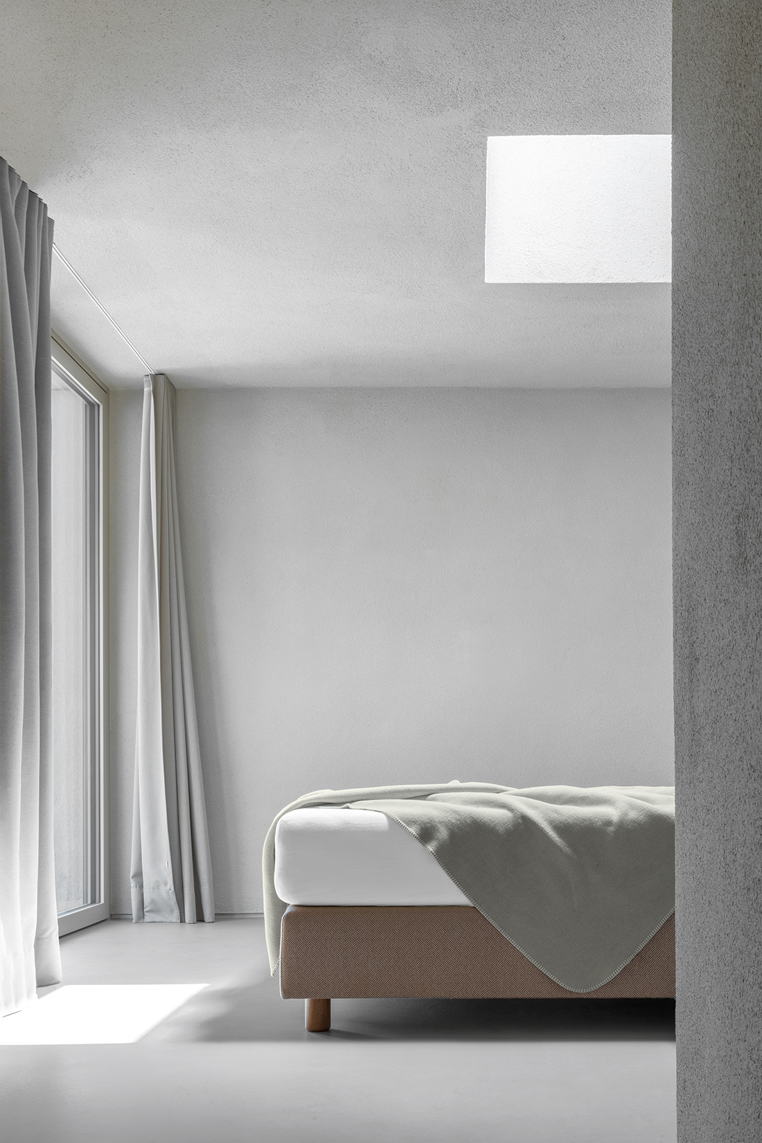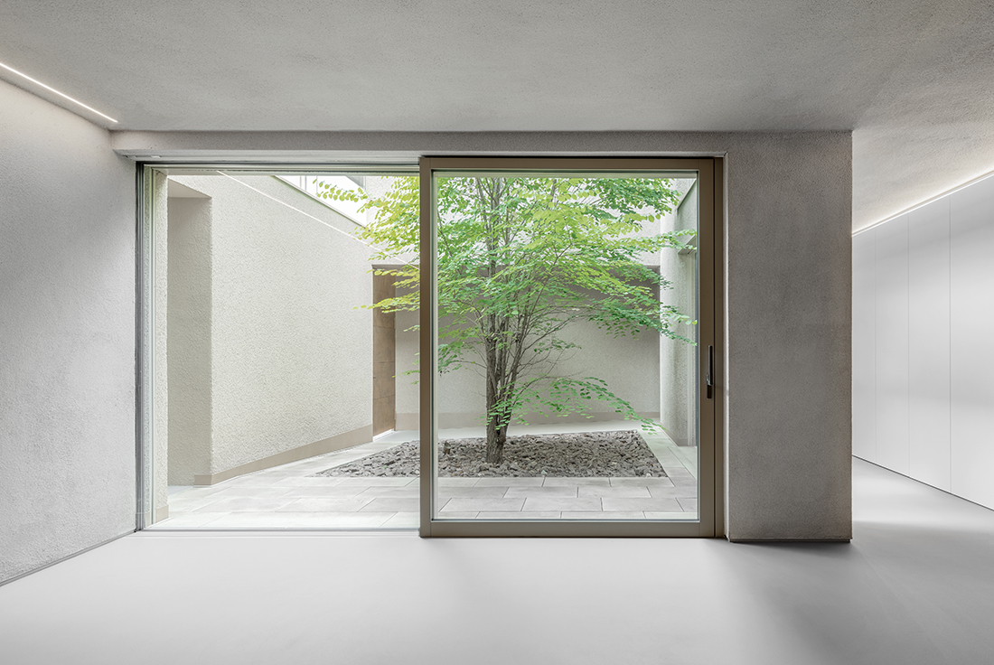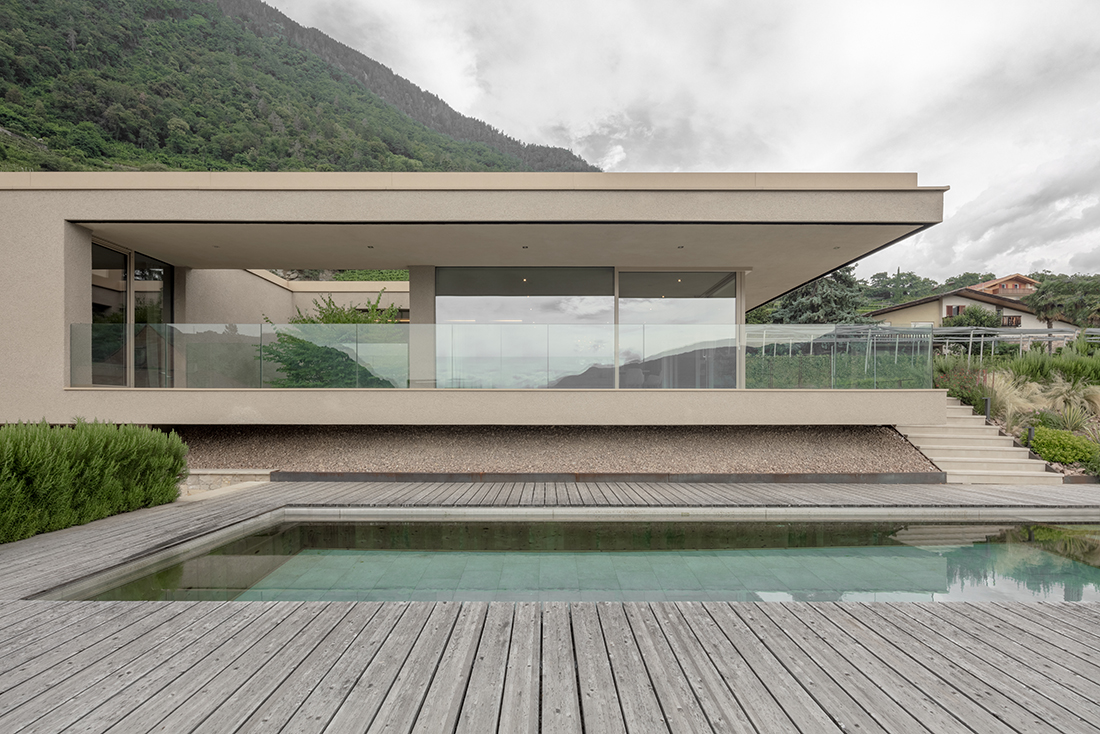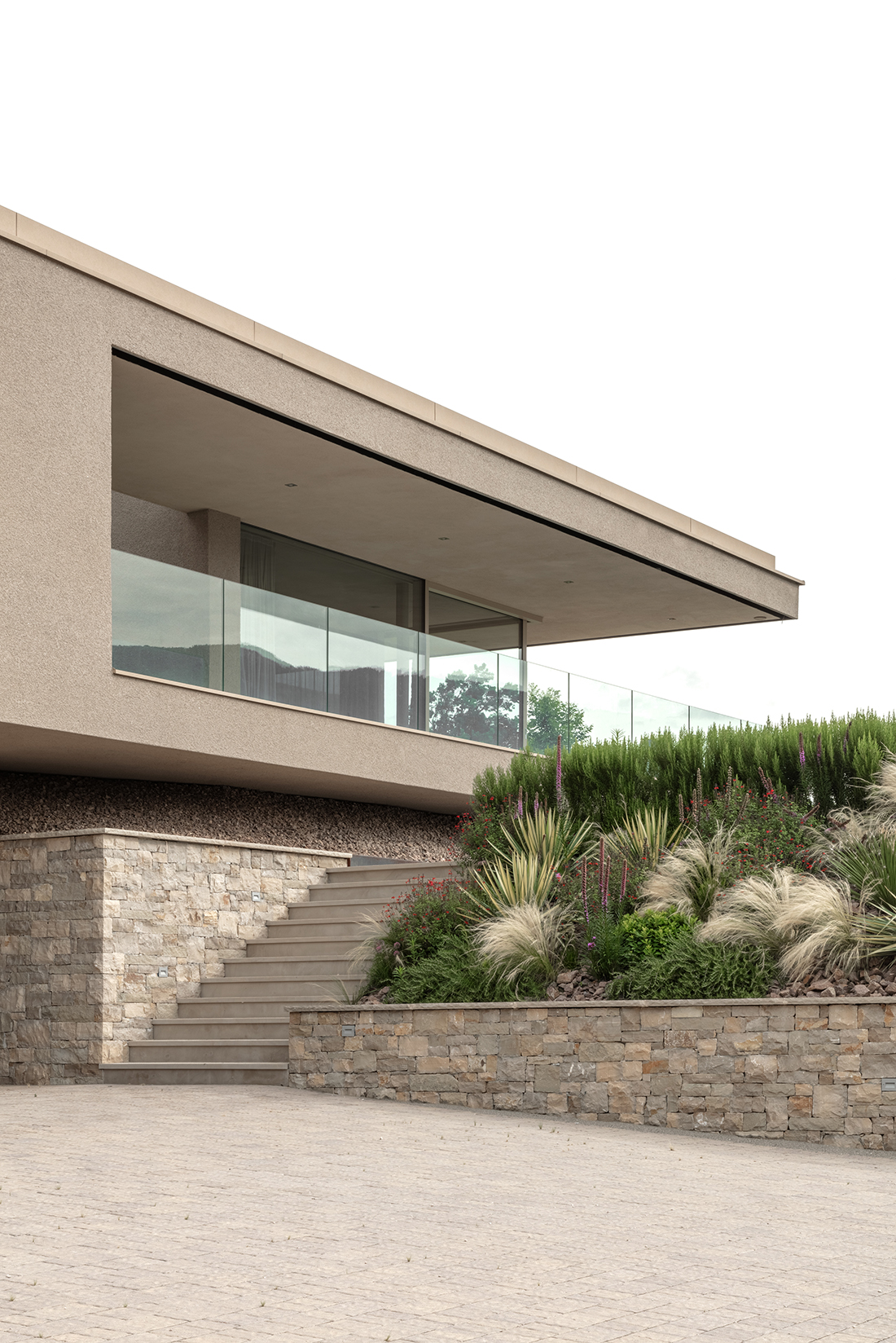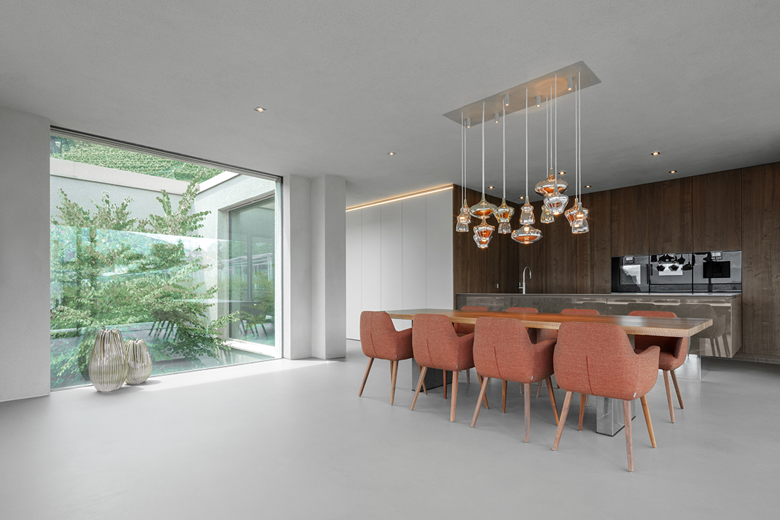 The building sits entirely within the greenery, with only the forecourt to the garage and the paved entrance. In the basement, arranged around the atrium, there is a fitness room to the east, a wellness area with a skylight to the north, and the garage to the west, with the boiler room and cellar behind it. All living and sleeping areas are arranged on a single level on the ground floor. The kitchen is on the east side, the living area to the south, with the dining table between them. A covered balcony wraps around this zone in an L-shape. This covered area protects against overheating in summer, while allowing the low winter sun into the living space. Bedrooms and bathrooms are located on the west and north sides of the building. The entire structure cantilevers freely to the south, giving the building a floating appearance. At the same time, this creates a covered entrance area. The swimming pool is positioned halfway between the basement and the ground floor.