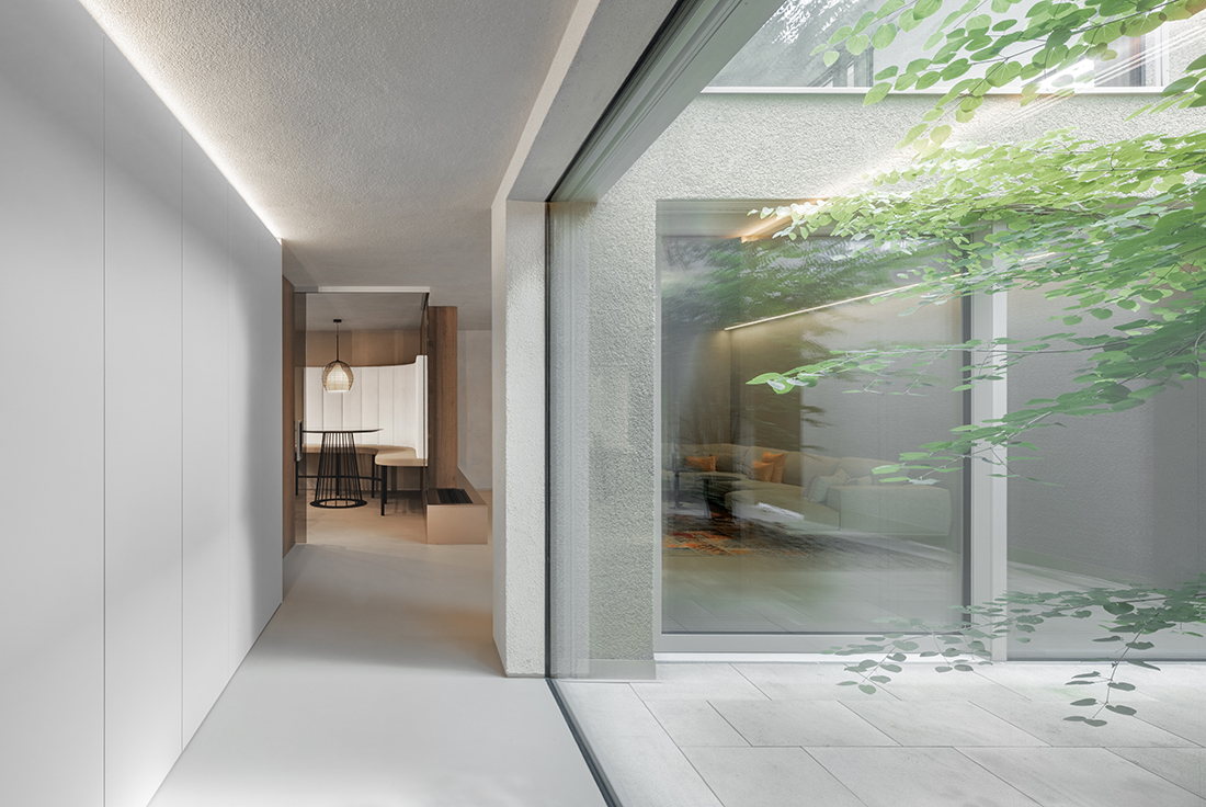 The new building will be integrated into the landscape, so that no artificial earthworks are required. The structure will remain low, making it barely visible from the road or from the rear. The basement is built entirely below ground. The staircase to the ground floor and living area is located on the south side. This position was chosen deliberately, to orient the living spaces toward the east, south, and west. Access is via the courtyard, creating a bright entrance without the need to pass through a long, dark corridor.