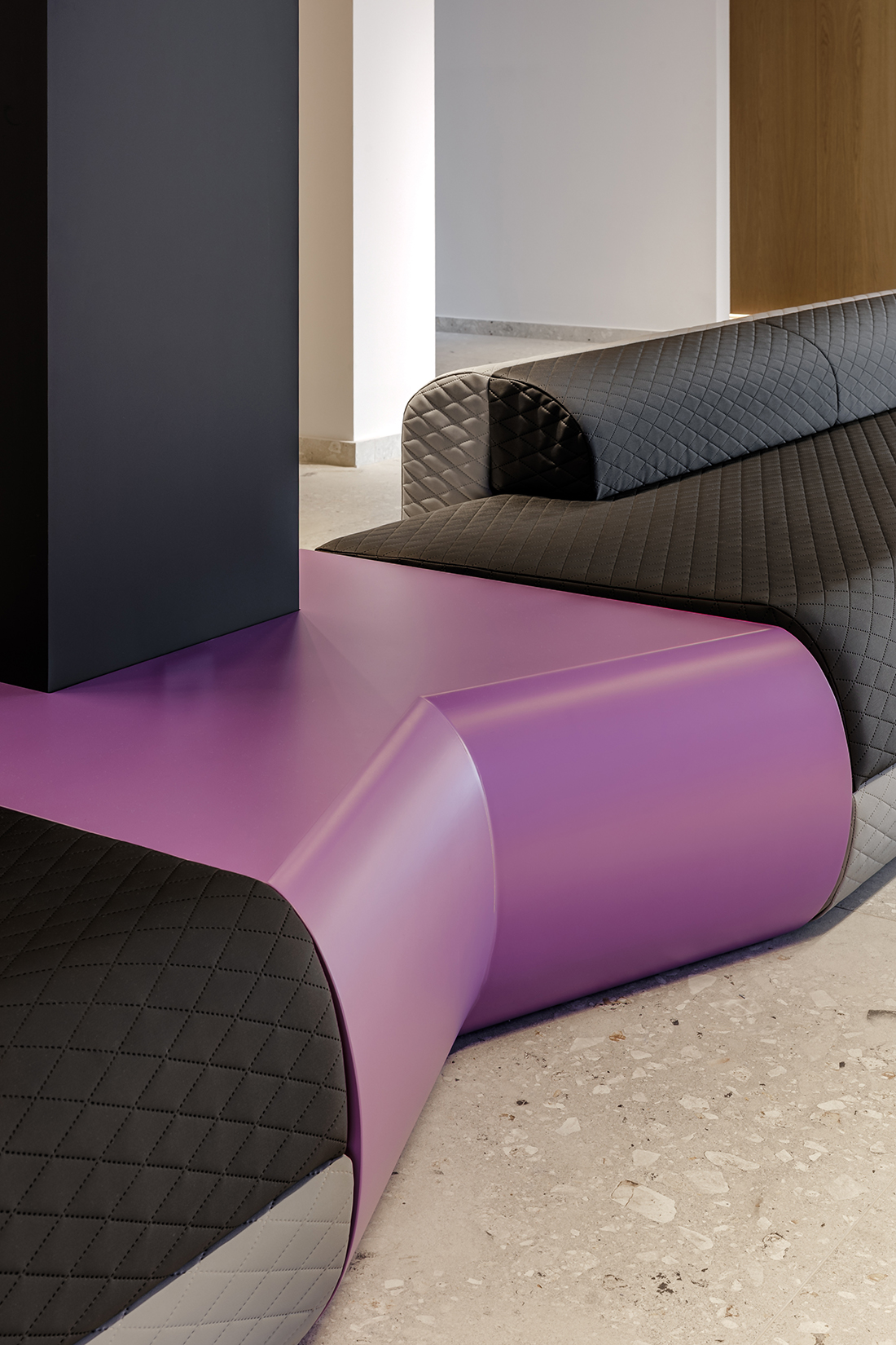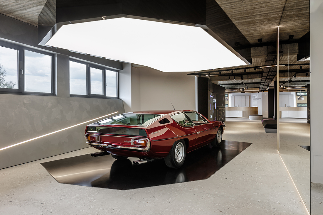 Luminous ceiling installations serve as focal points for the exhibits, particularly in the 200 sq.m. car exhibition and training area, where the spatial experience reaches its peak. The industrial character is expressed through the exposed concrete ceiling, while the rigor of diagonal forms is balanced by the fluid curves of the custom-made furnishings. With this project, Kaput Design shapes the identity of HB BODY ACADEMY into a living, contemporary architectural experience.