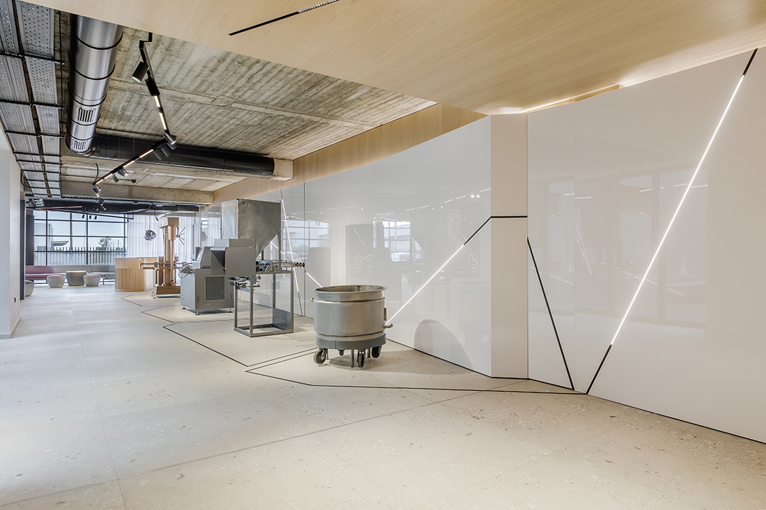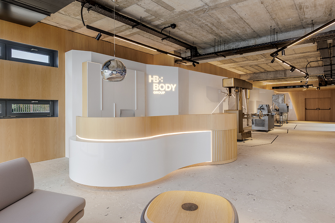 Kaput Design has transformed the ground floor of HB BODY ACADEMY into a complete spatial experience that blends company memory, expertise, and contemporary aesthetics. The lobby layout was approached as a unified narrative: a museum-like space that hosts the founder’s original machines, presented in an artistic manner, while a bold wall structure frames the large video screen, acting as a spatial backdrop that highlights the storytelling.