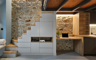 The design approach was tailored to the particular identity of the store that existed in Porto Lagos, at the same place, for many years. The basic spatial requirements, the sales and the customer service, are placed in direct contact with the entrance and the glassware. The aim was to integrate interior with exterior spaces during the summer period. This direct connection between interior and exterior spaces through the opening glassware allows multiple views and easier display of the merchandise. The kitchen and grill areas are located on the back of the store, but are visible from the retail area through a fixed glass partition. Mild color tones were chosen on ceilings, walls and floors, with off-white, turquoise and gray shades, creating the visual background to highlight, through intense color contrast, the black metallic elements and dark furnishings, which add a tone of modernization to the store and highlight the importance of the production process. The custom-made fishnet lamps and the nautical decorative frames at the front of the store, contradict the rigorous layout of the furniture elements and the linear spotlights on the ceiling, aiming to create a dynamic yet profound environment with references to the sea and fisheries.