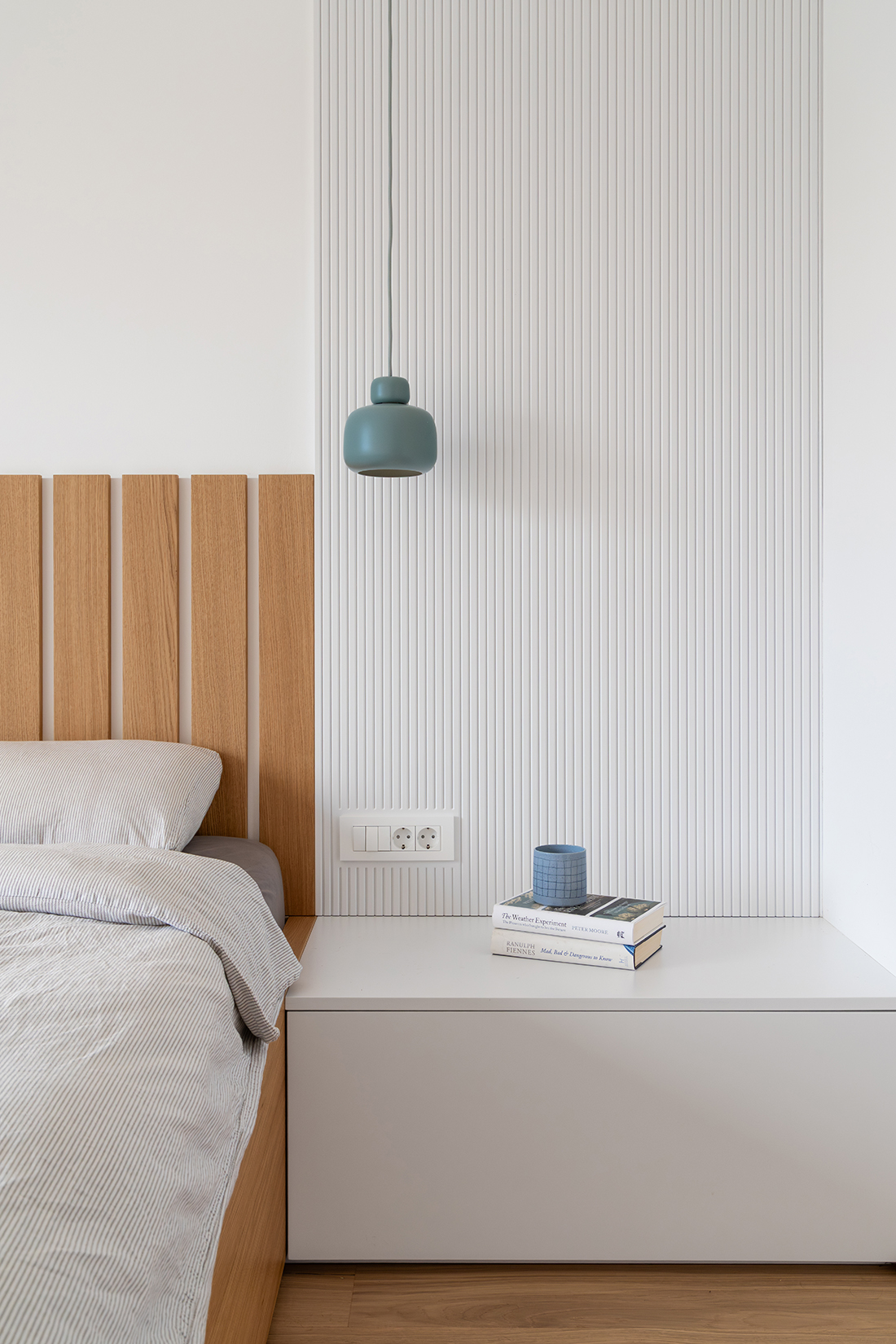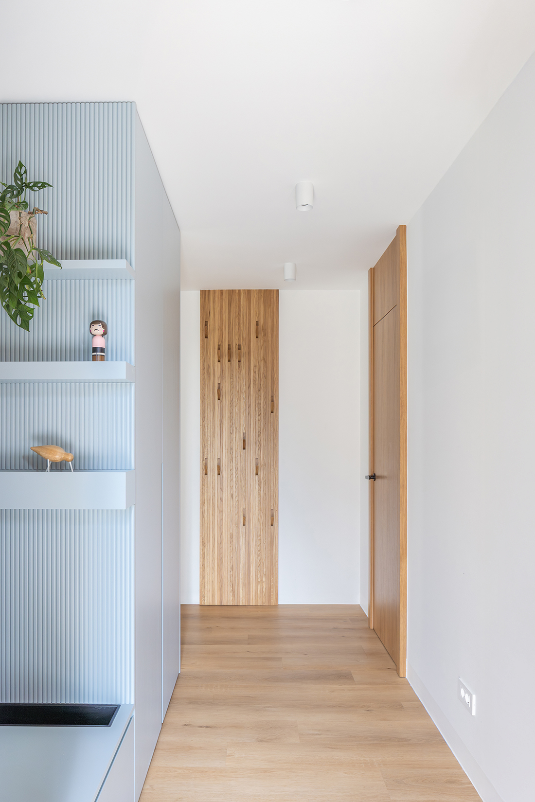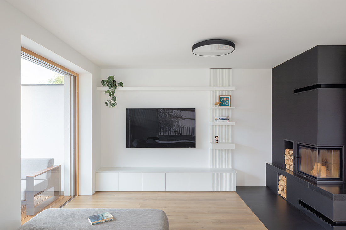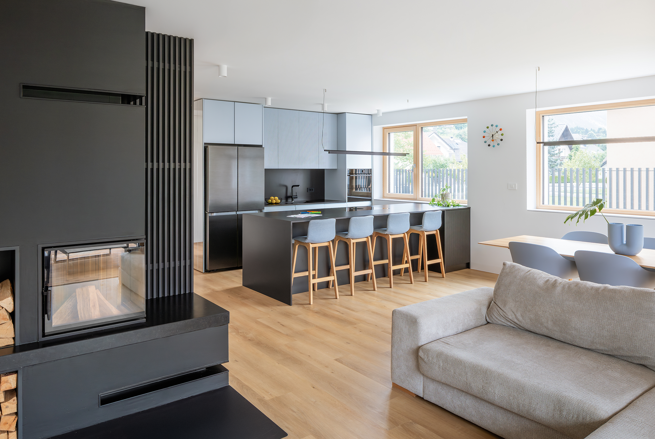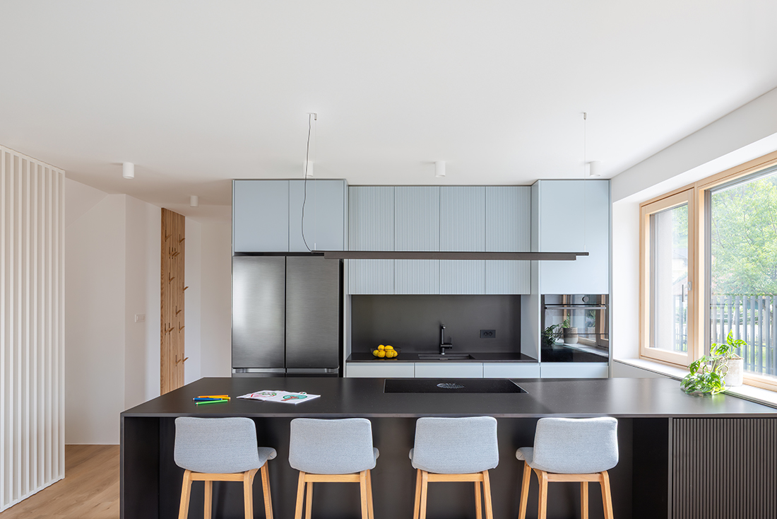 The floor plan allows the living area and kitchen to be arranged on the ground floor, connected to a private garden, while the bedrooms on the upper floor open toward views of the surrounding mountains. The kitchen and living area are connected by a dark volume with a fireplace, forming the central heart of the house, where the family spends most of their time. Throughout the interior, a cooler, blue-grey palette is combined with white and black, carefully selected for clients who enjoy spending their free time high in the mountains. Warm wooden accents and the texture of vertical slats evoke the feeling of a soft walk through the forest before returning home.
