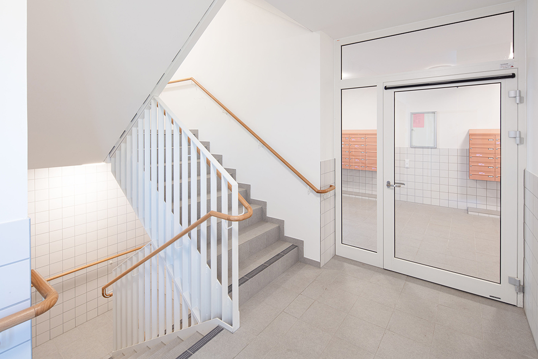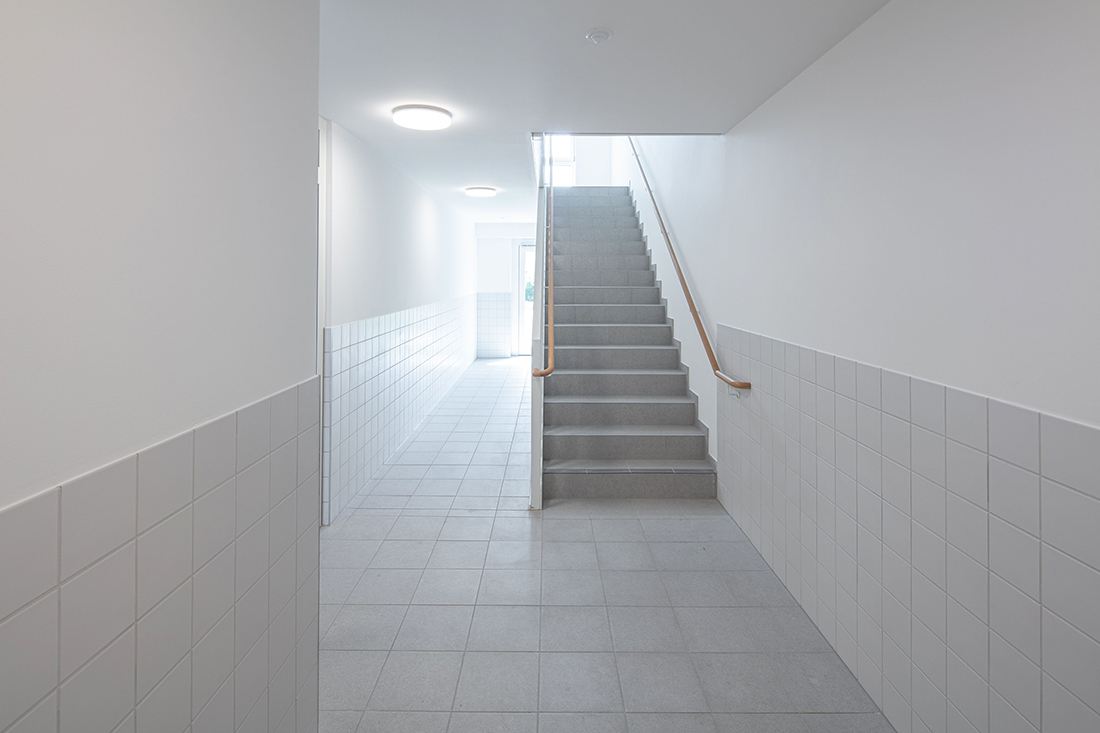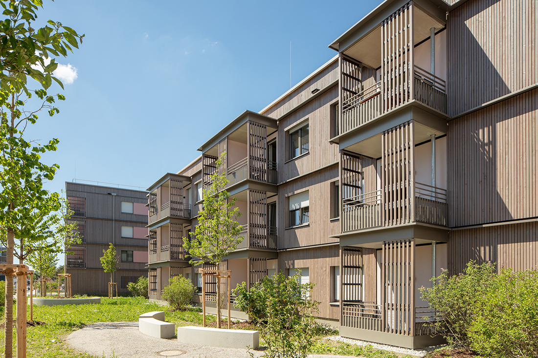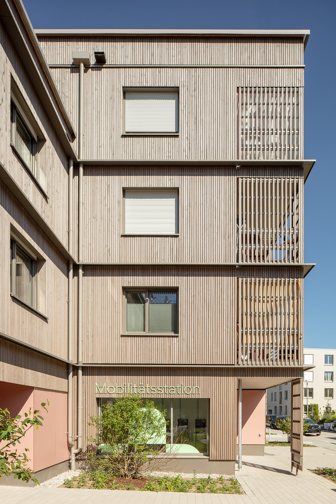 The houses act as a family and lend the ensemble a nest-like feel. The City of Munich required compliance with the KfW 40 criteria (40% primary energy consumption compared to a reference building with minimum thermal insulation requirements), as well as the use of 50 kg of renewable raw materials per m² of living space. A reinforced concrete skeleton forms the supporting structure of the buildings and is infilled with wooden prefab elements. The façade elements are insulated with wood fiber insulation and anchored to the load-bearing components with built-in windows. Integrated into the wall elements are all air intake openings, concealed from the outside, as well as 100 nesting boxes for bats, swifts, and sparrows. Underfloor heating completes the high-quality features for a subsidized housing project.