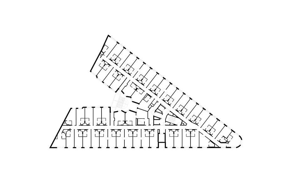 Its striking triangular form, with three differentiated heights, creates a dynamic interplay with the urban fabric, making a bold yet harmonious addition to the city’s skyline. The minimalist façade, composed of sleek aluminum panels, emphasizes clean lines and contemporary design while reflecting a strong commitment to sustainability.