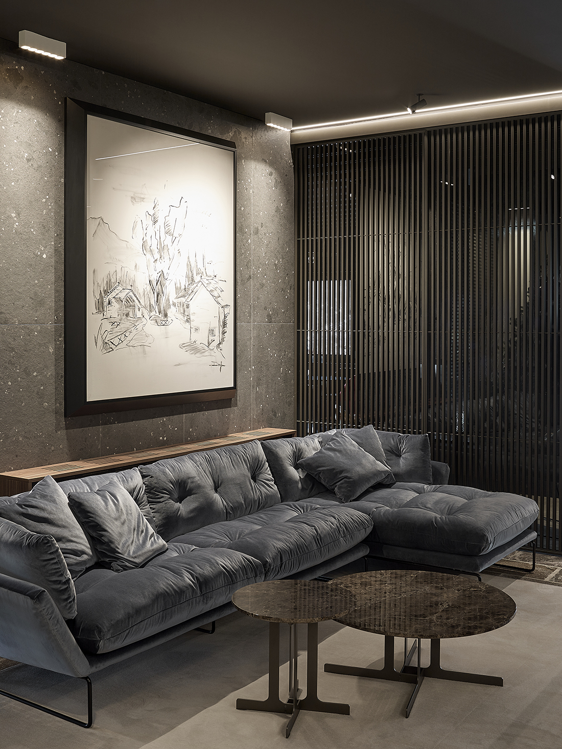 The fireplace remains central and leads to a more secluded living area within the reception zone, where sofas become the focal point, followed by a library area designed for socializing, wine tastings, and the enjoyment of fine contemplative spirits, as well as for light lunches.