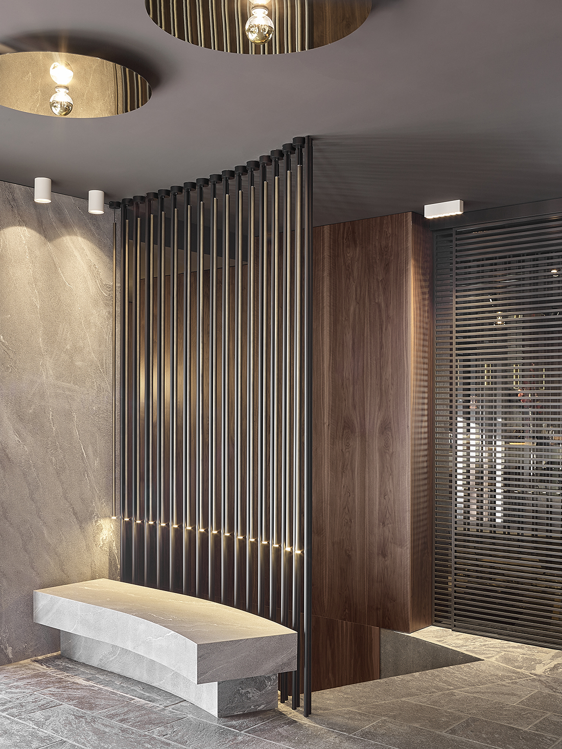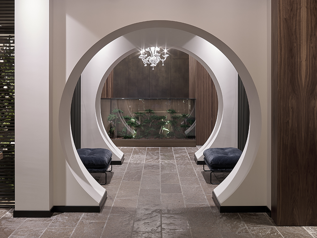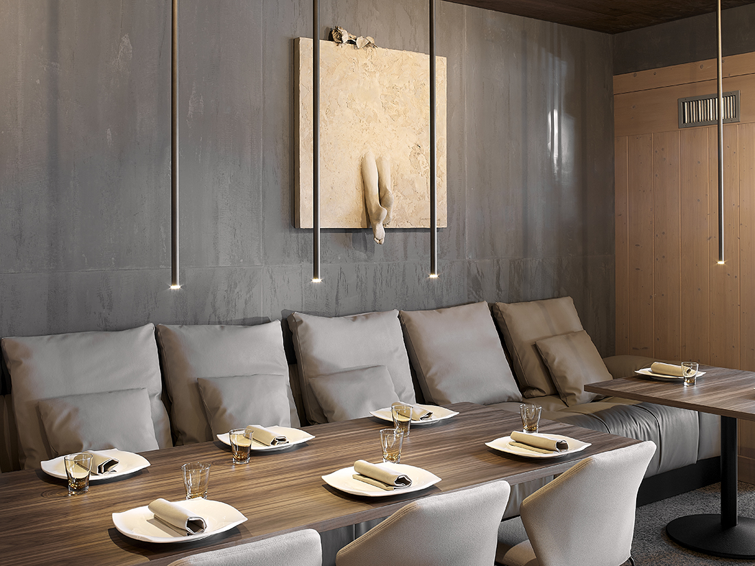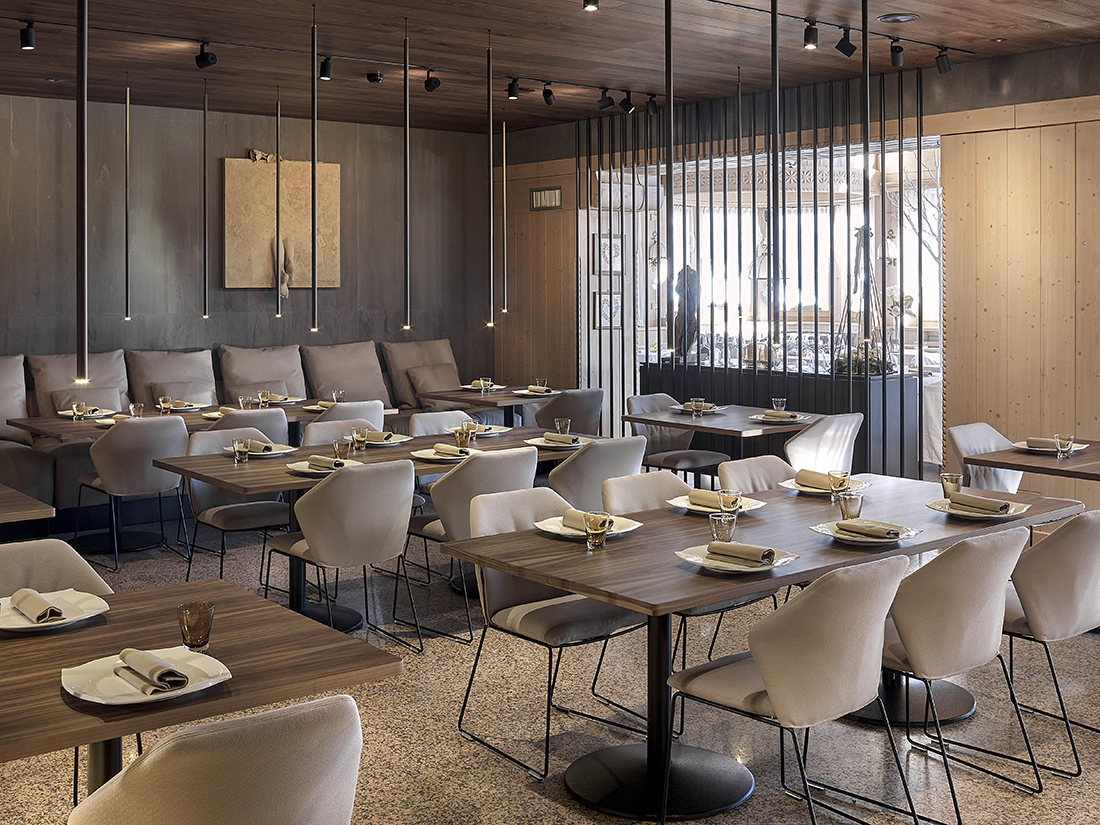 The theme of the counter, which represents the first true physical point of contact with the hotel, is emphasized through a visual “telescope” that leads directly from the entrance to the reception desk. Along this route, on the right, one encounters the very contemporary extension of the gourmet lounge – a permeable display-like volume – followed by the illuminated path to the main dining room, while on the left there is an extraordinary bar area.