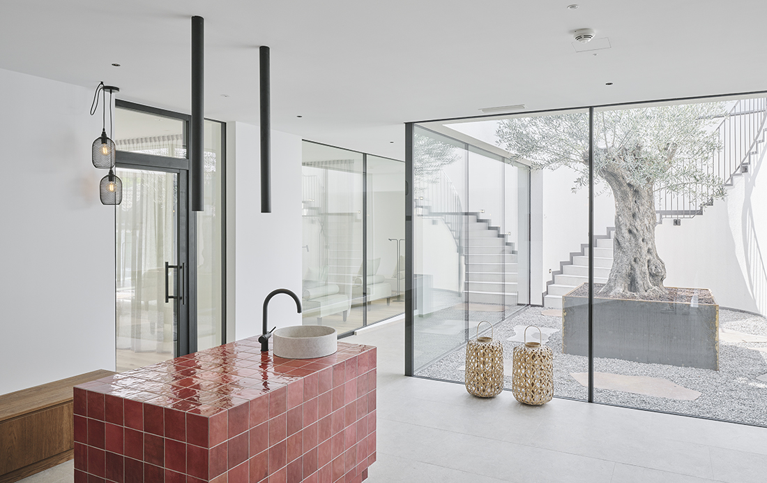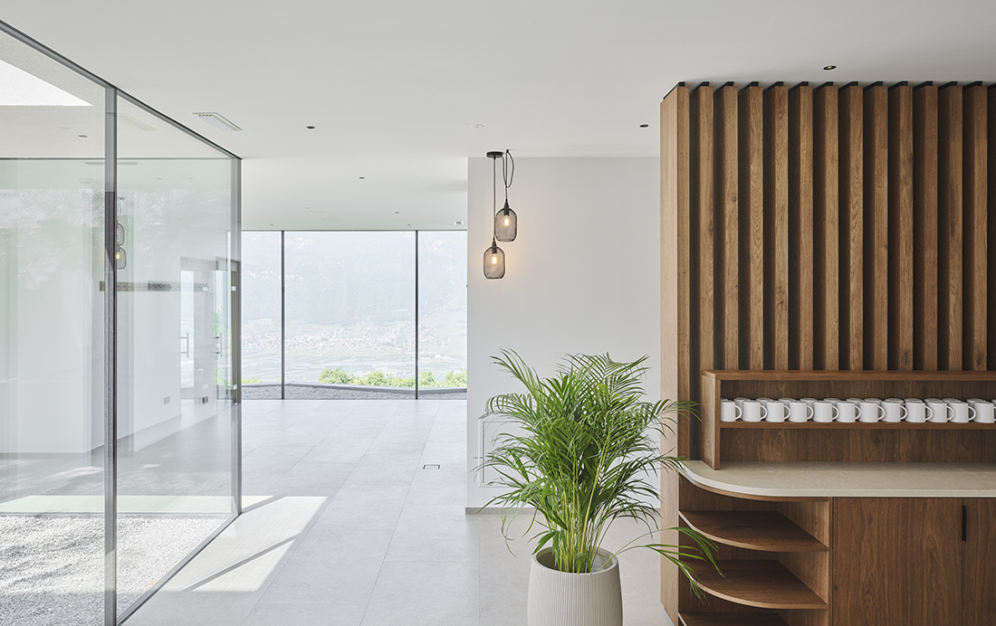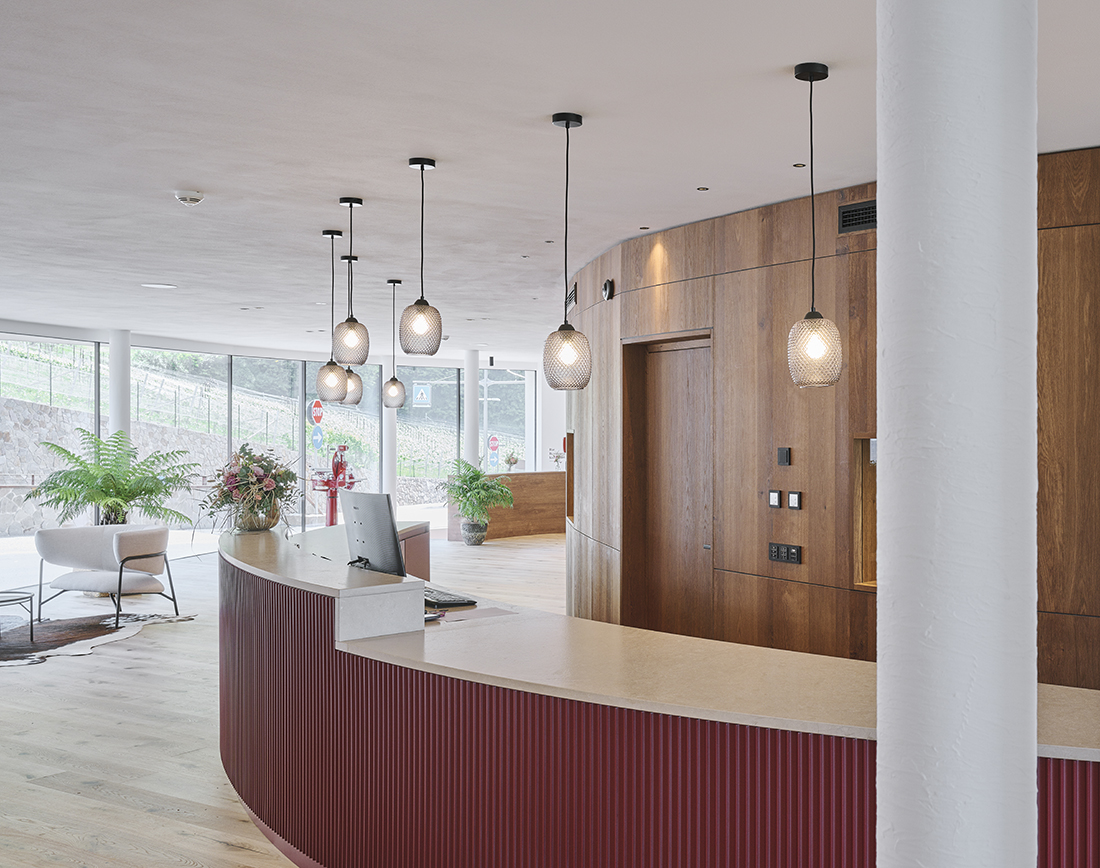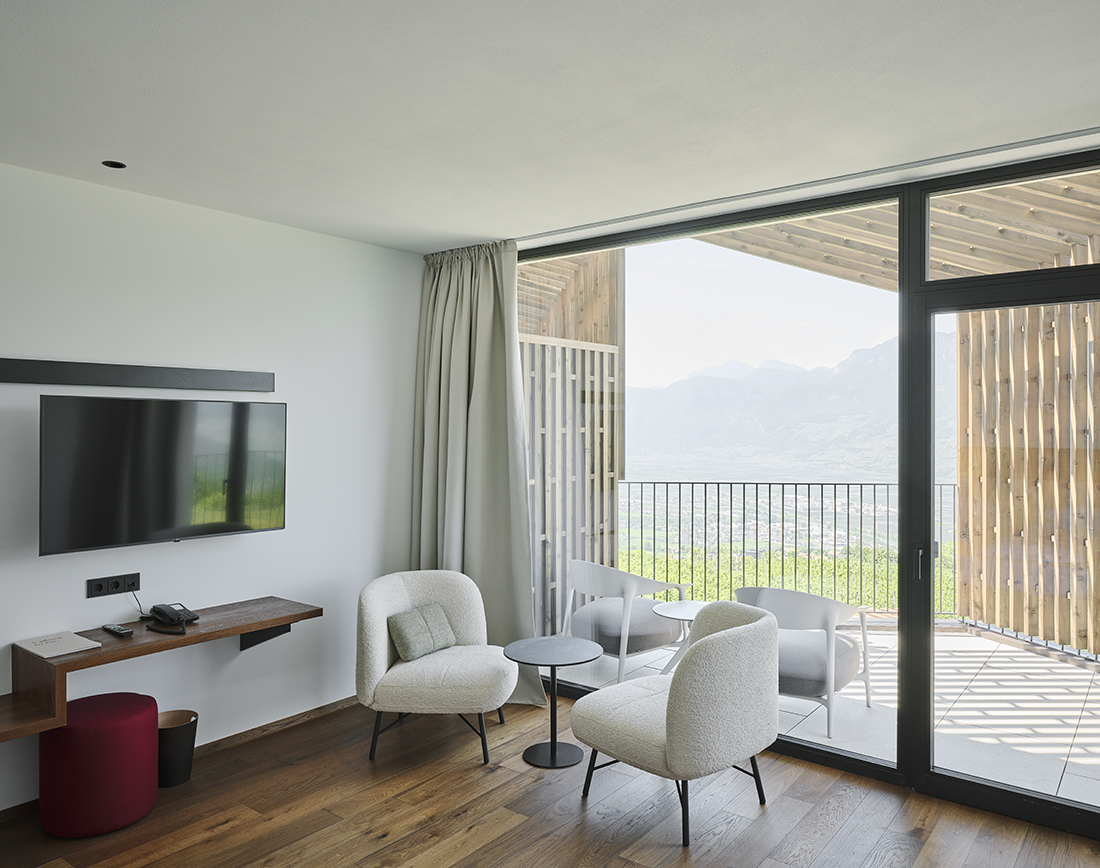 A new entrance with a large glass front creates a brighter and more expansive arrival space, with views toward the vineyards and the valley. The spa is enlarged with new saunas and quiet rest spaces, while many rooms are upgraded to reach a four-star level. Wood, natural stone, and glass shape the design, giving the hotel a warm and contemporary character.