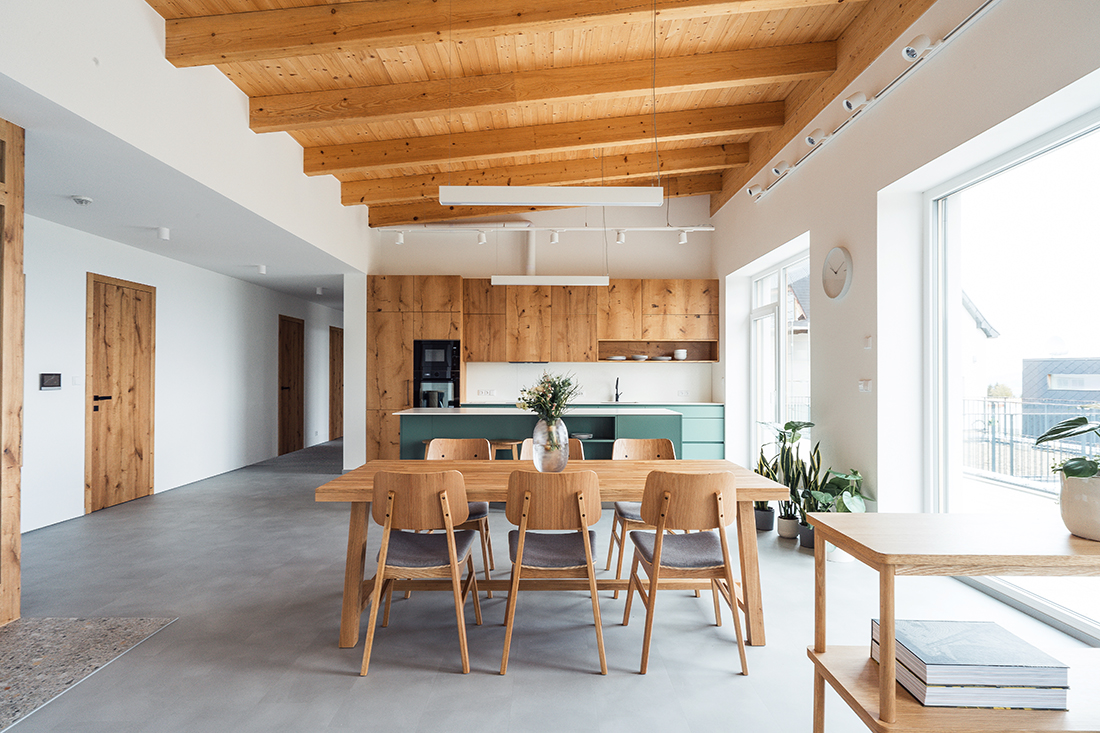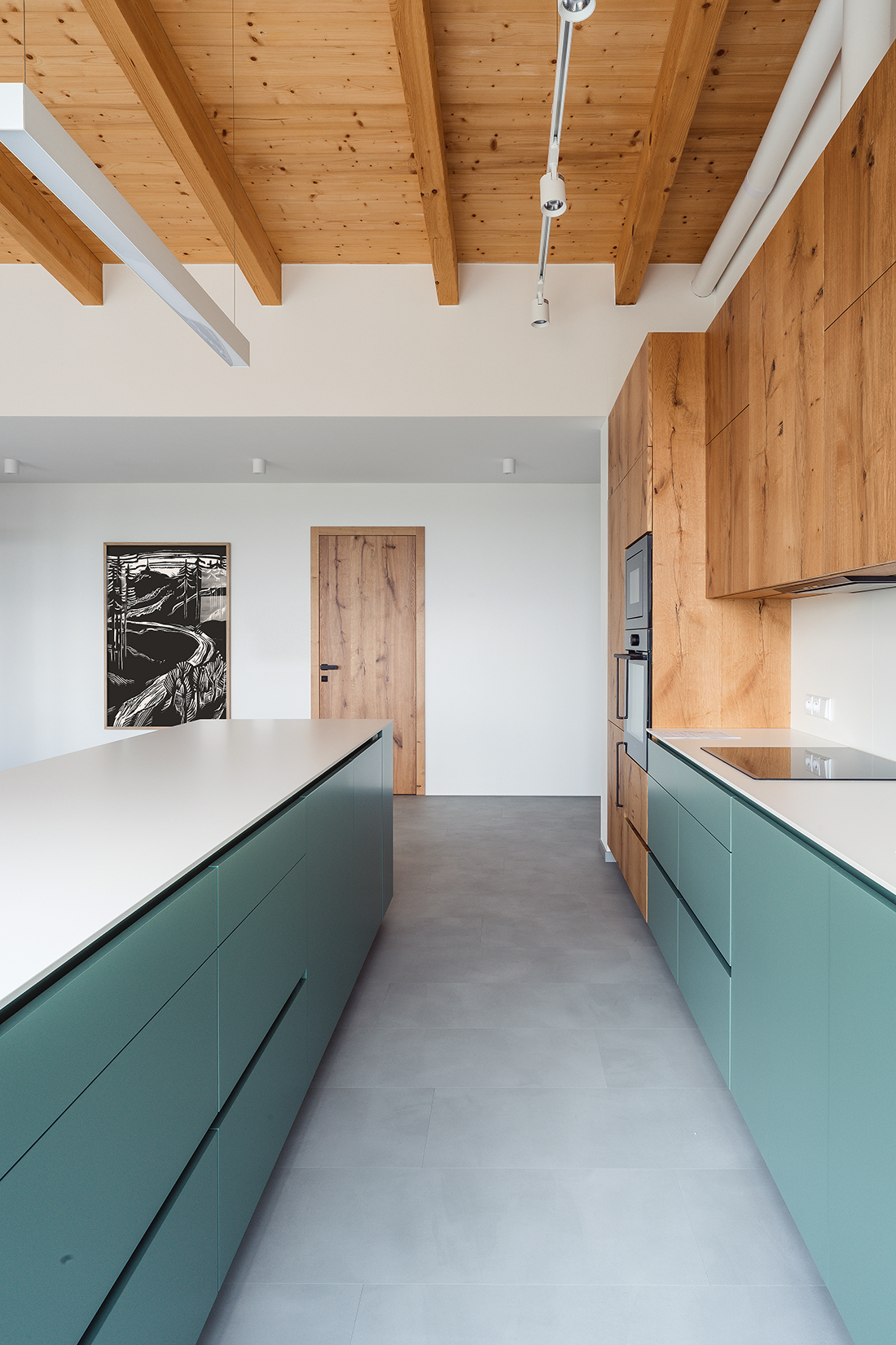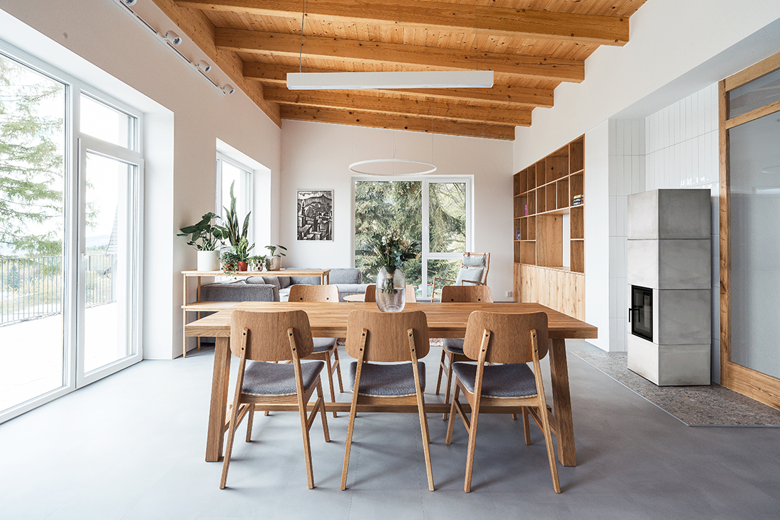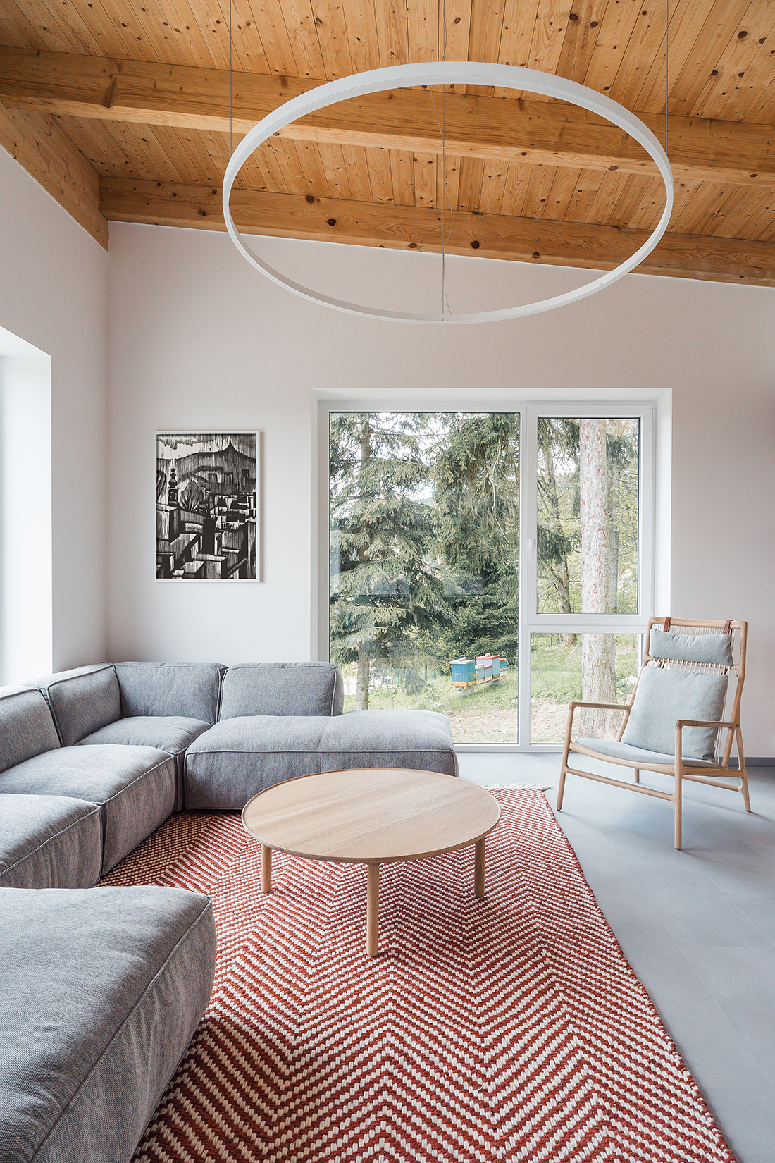 The setting in the terrain is articulated by distinctive terrain walls made of gabion. The house is very simple and creates a harmonizing element in the surroundings. Artistically, the house emerges from the place – the expressive means are stone or the texture of stone and wood – both in the exposed roof structure and in the joinery and furniture. A detail contrasting with the simple form of the house on the outside is the unconventional division of windows, inspired by the architecture of the 1960s. The interior design contrasts with calm, petroleum colors and large-format linocuts from the 1960s on the theme of Liberec and Ještěd.