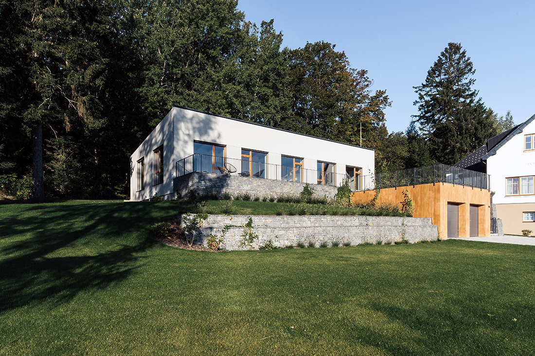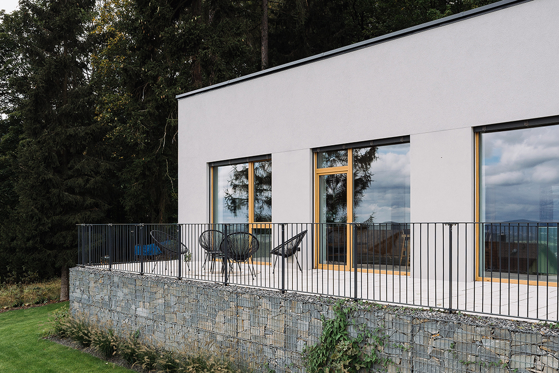 A new construction of a generous family house at the foot of Ještěd, in the Hanychov district of the Liberec city. The aim of the project was to create contemporary, affordable, and artistically valuable family housing on the foundations of a ruined gymnasium from the 1950s. The layout and design of the project were developed with the awareness that the building is located in a place that provides an exceptional view of the entire Liberec, and is also located at the foot of a mountain with an icon of Czech architecture, Ještěd, from the 1960s.