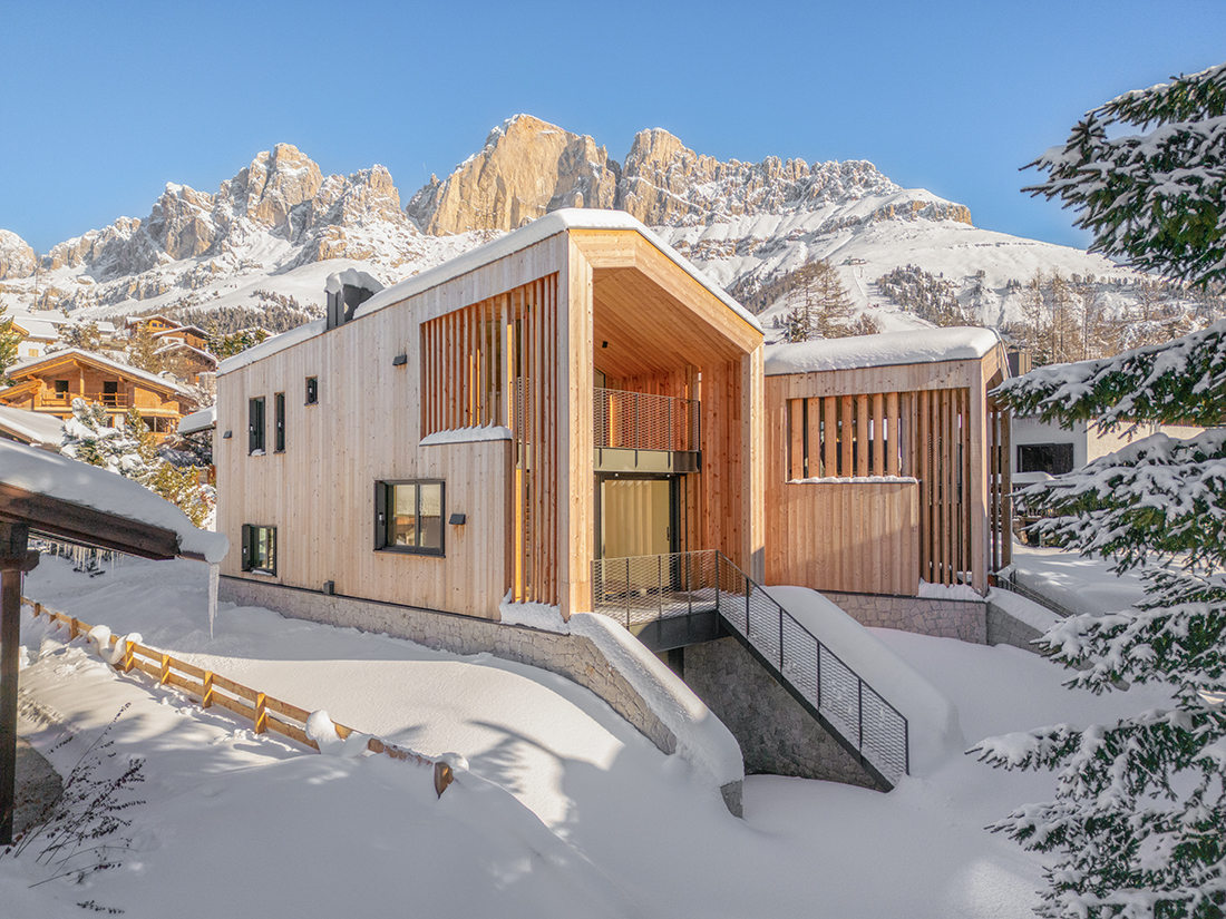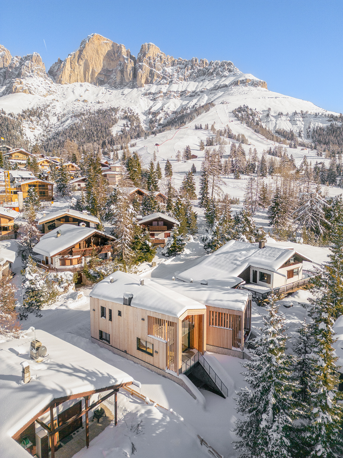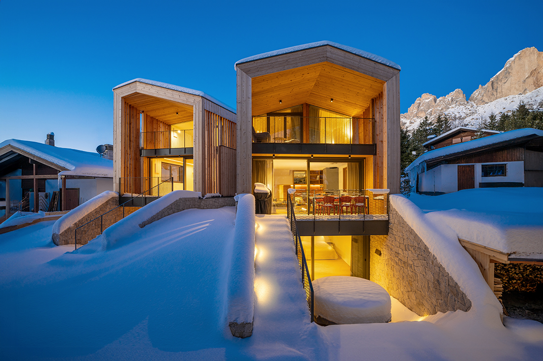 To preserve the residents’ privacy in this densely built area, the north side is enclosed by terraces and wooden slats, while the south side opens up to panoramic views of the Latemar through a glass façade. A distinct dividing line separates the fir wood upper section from the dolomite stone base.