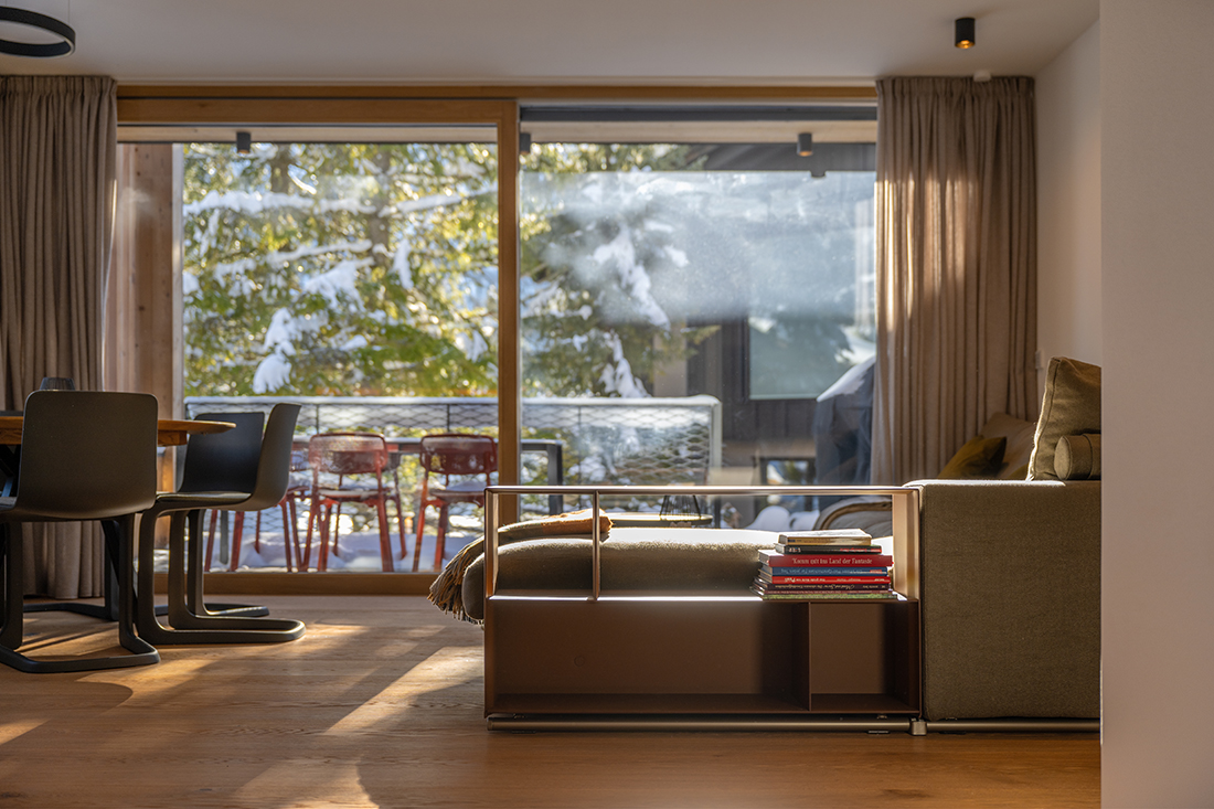 Inside, the staggered three floors ensure uninterrupted views. The rooms, filled with natural light and wooden finishes, exude timeless alpine charm, balancing intimacy and warmth, allowing guests to experience tradition within a vast landscape.