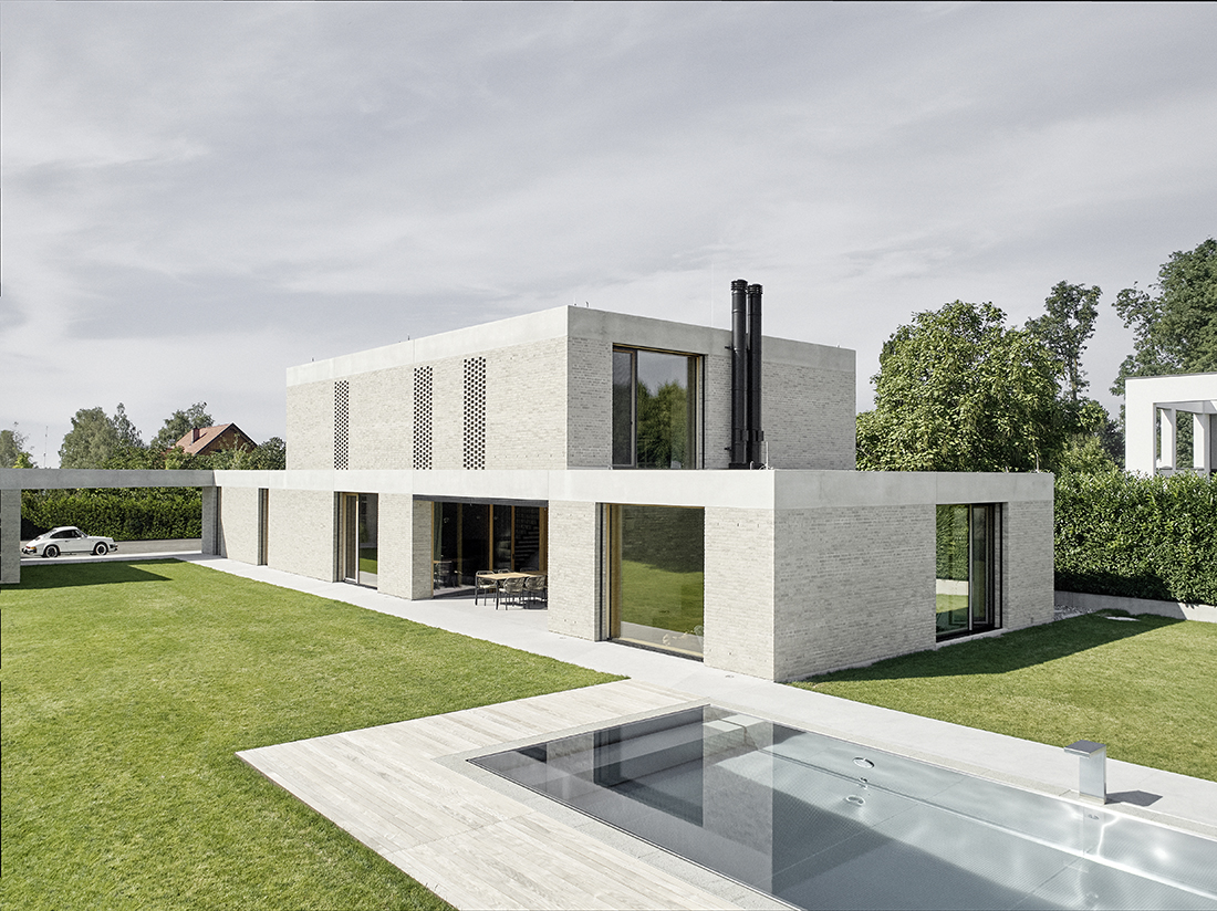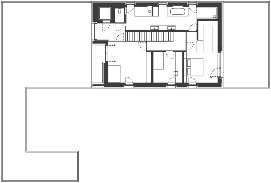 In the vicinity of Lake Constance, the longitudinal plot extends in an east-west direction. The property is accessed either via a spacious forecourt with parking for visitors or through the underground garage. Upon entering the house, two guest bedrooms with a shared bathroom are situated near the entrance. From there, the layout flows into the kitchen and adjoining pantry, followed by the dining area, which leads to the living room, set three steps lower.