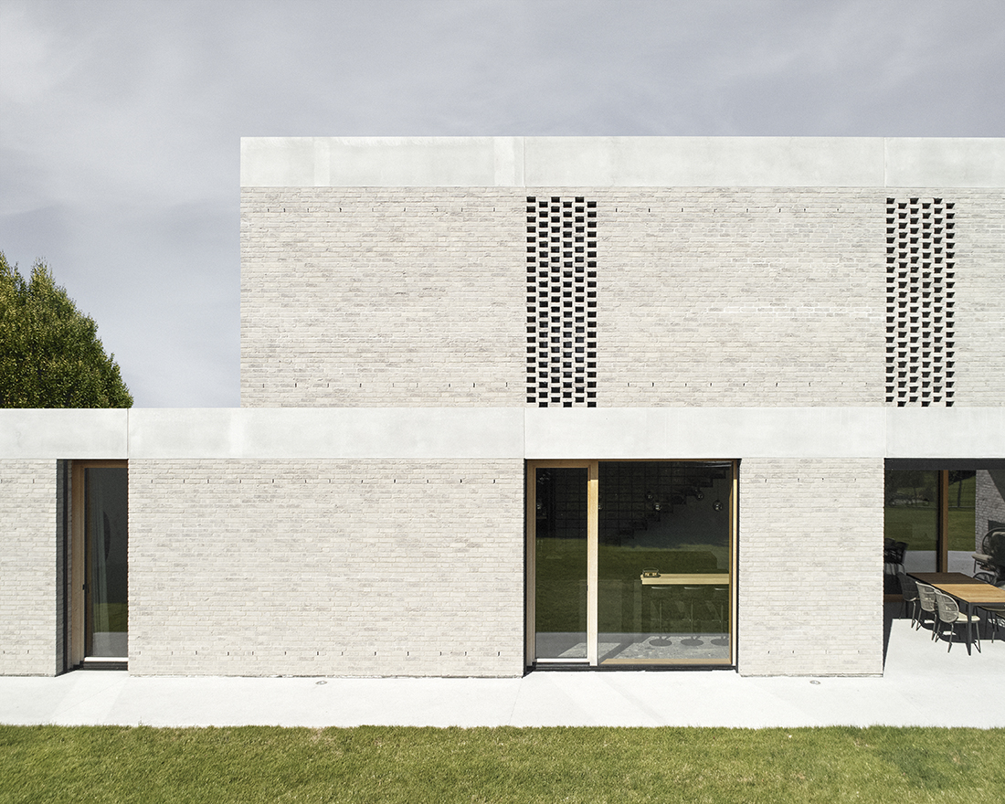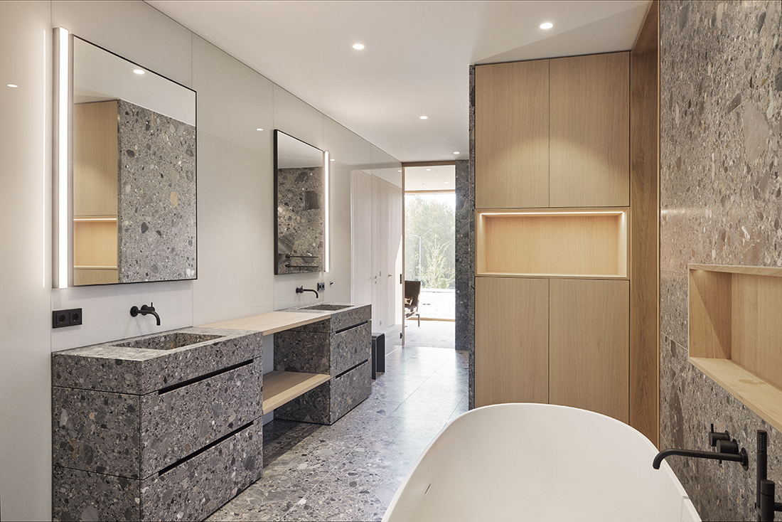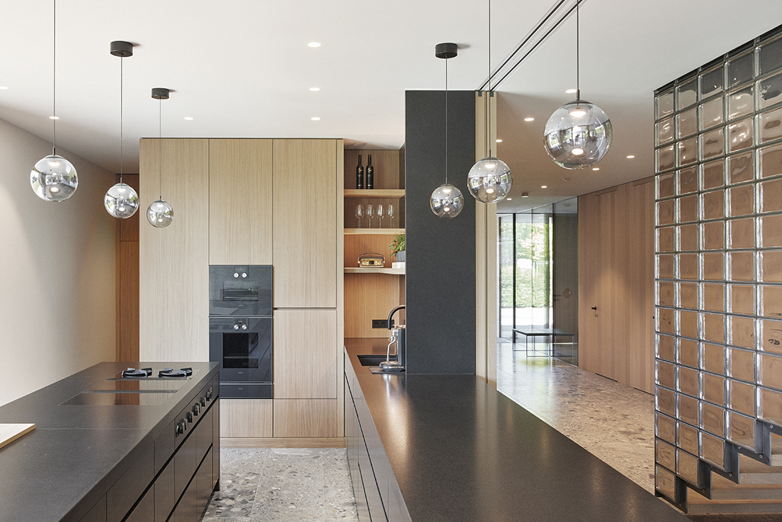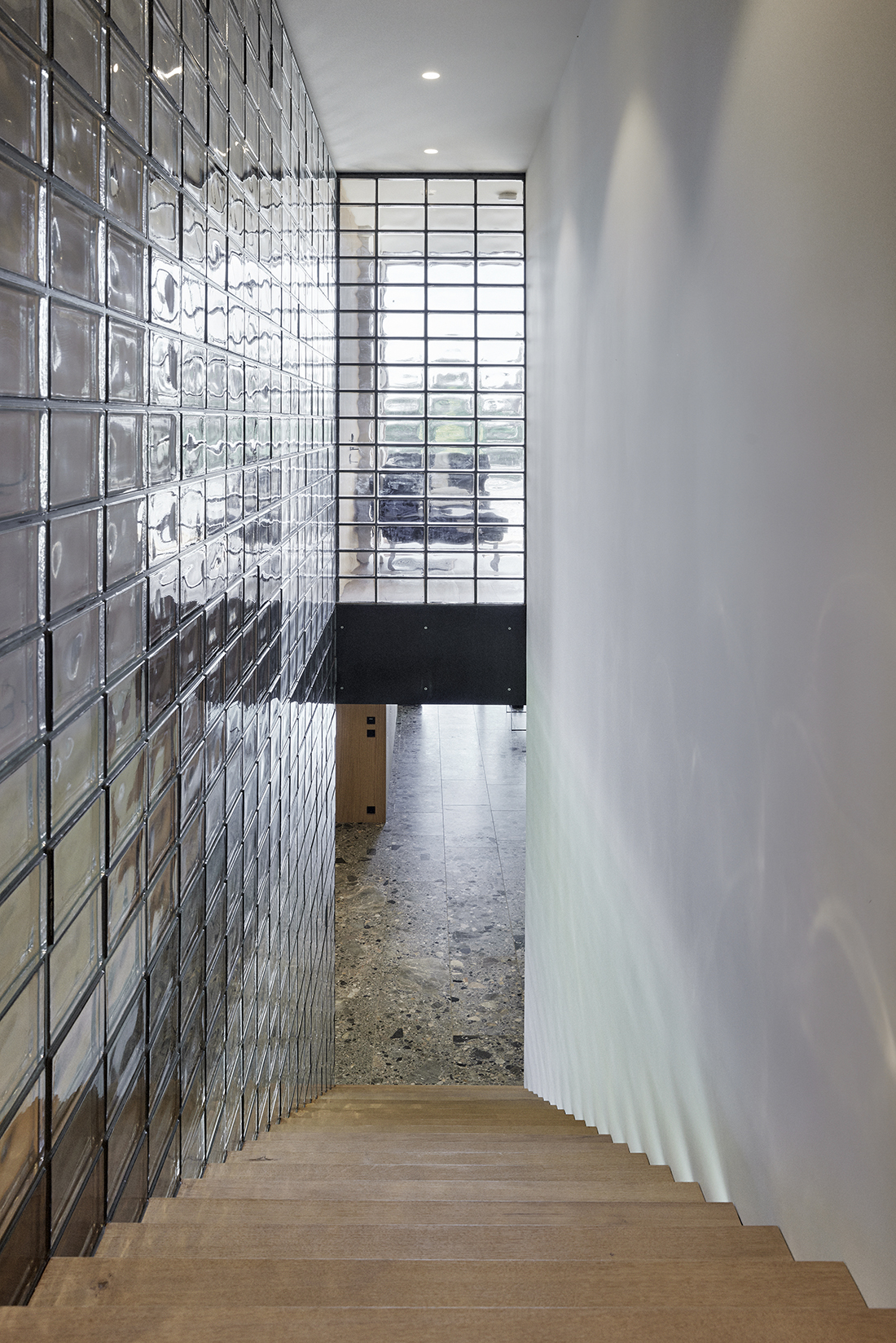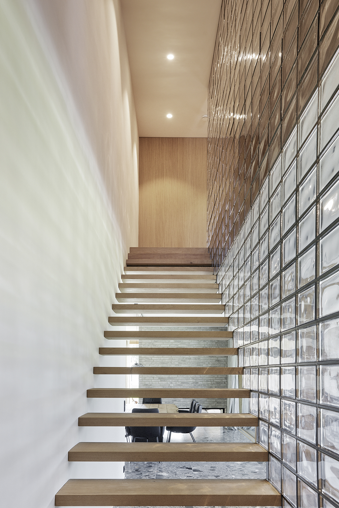 A floating steel staircase with wooden treads, enclosed by a wall of glass bricks, leads to the upper floor, where the main bedrooms and a bathroom are located. Oak was the primary material chosen for the furnishings, surfaces, and flooring, lending warmth and natural elegance. In contrast, natural stone was selected for the kitchen, bathrooms, and entrance area to provide a sense of refinement and durability.