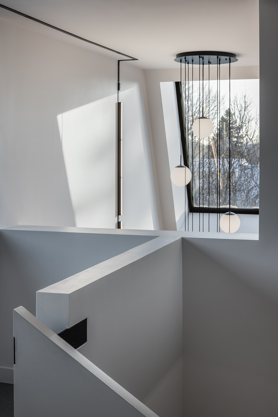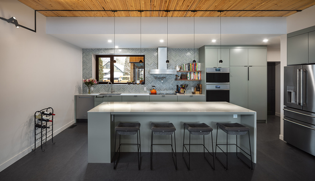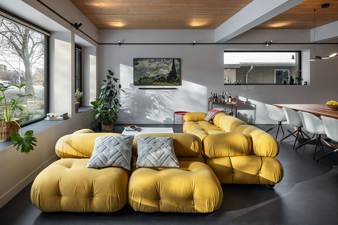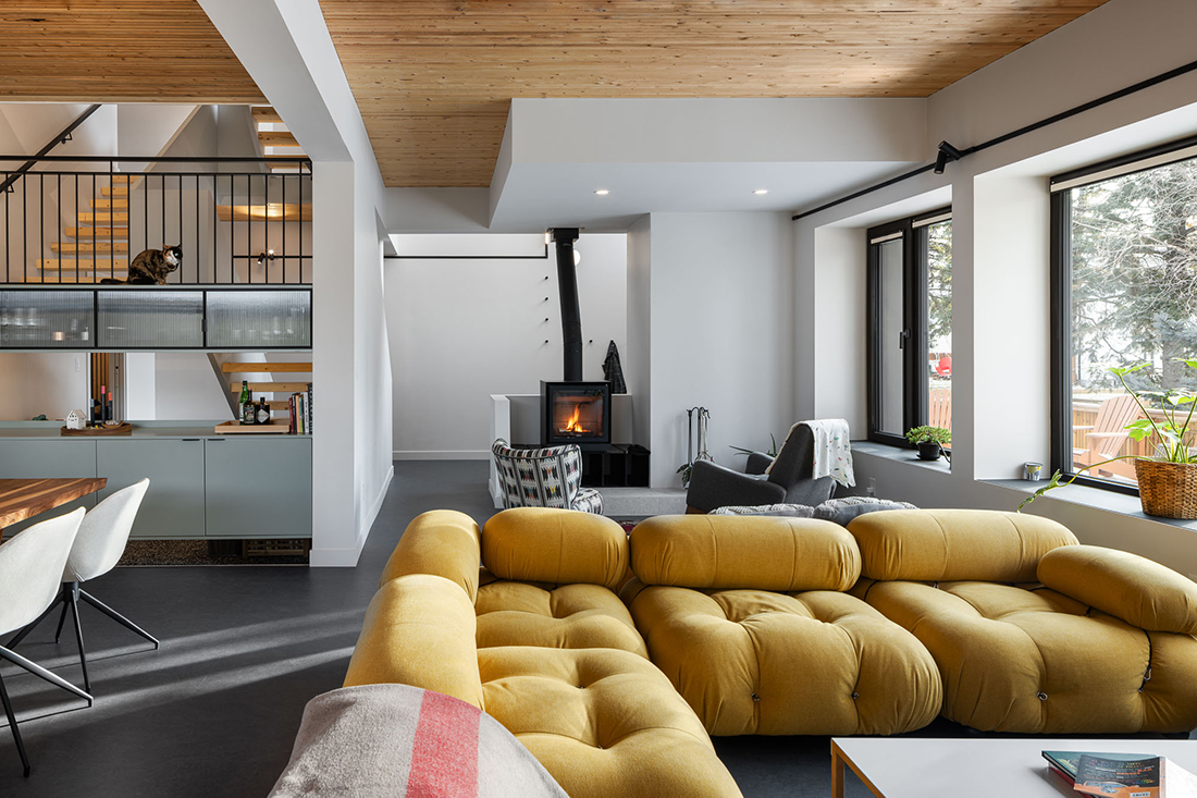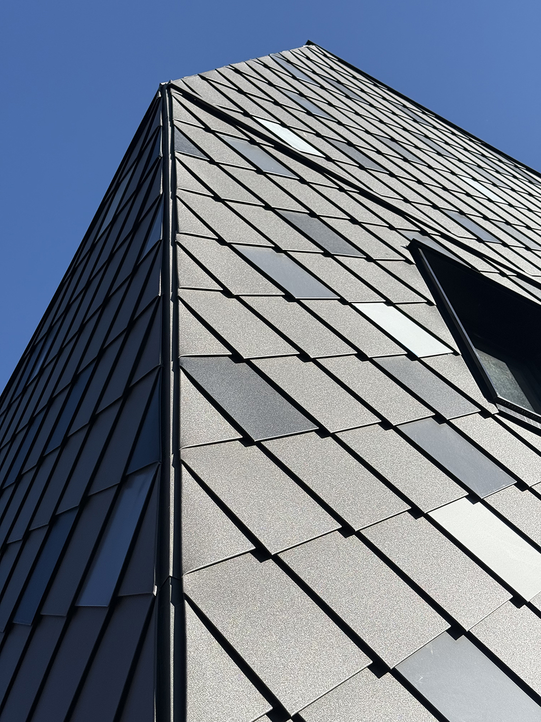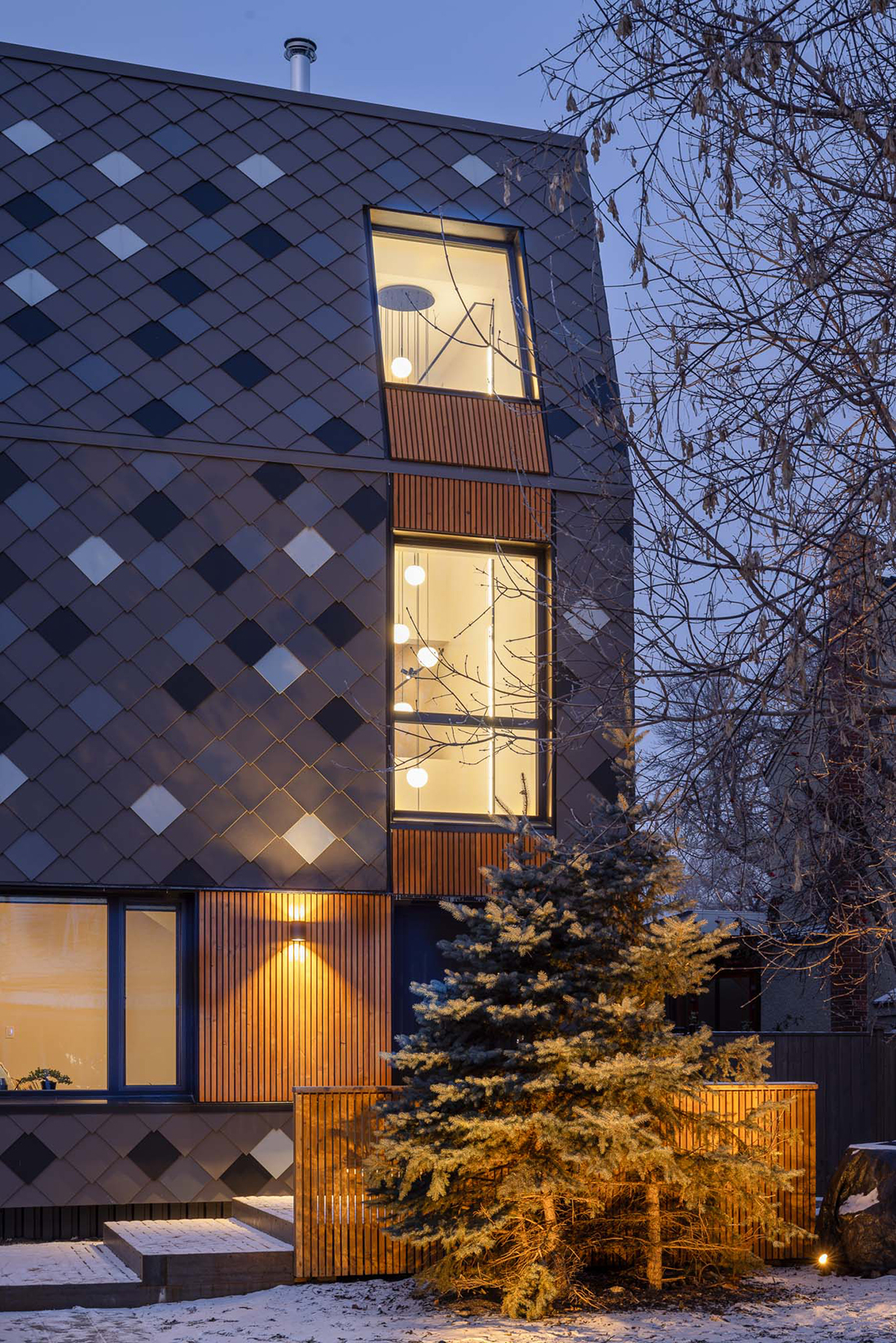 The truncated shape evokes a subtle “Mansard” reference, providing a faint echo of the French heritage of this part of the city, while also creating an appropriate space for future solar panels. The primacy of the truncated cube is further enhanced by a taut skin of metal shingles and wood siding.