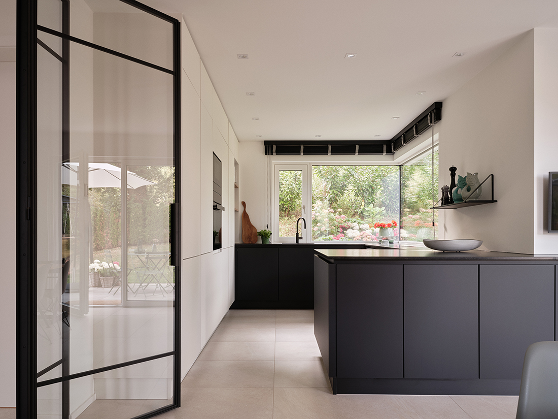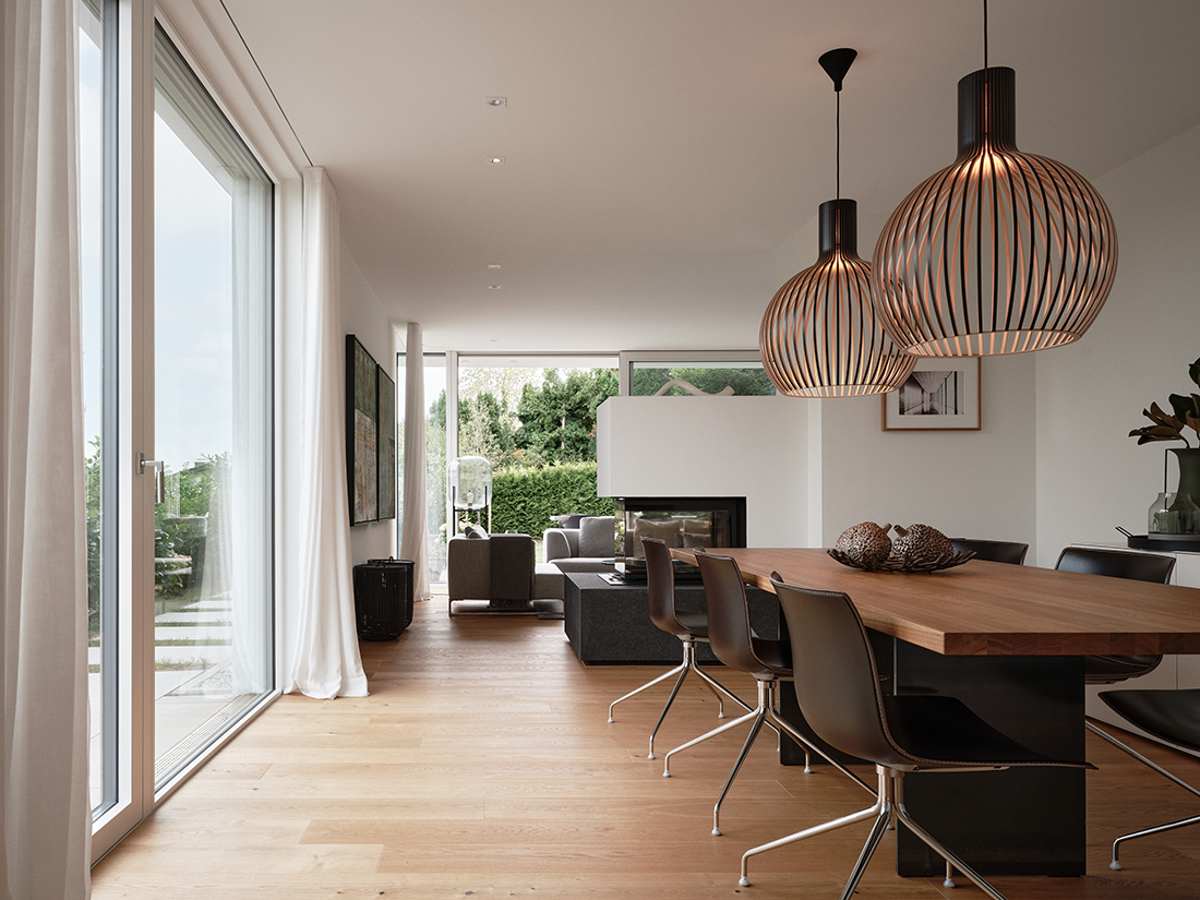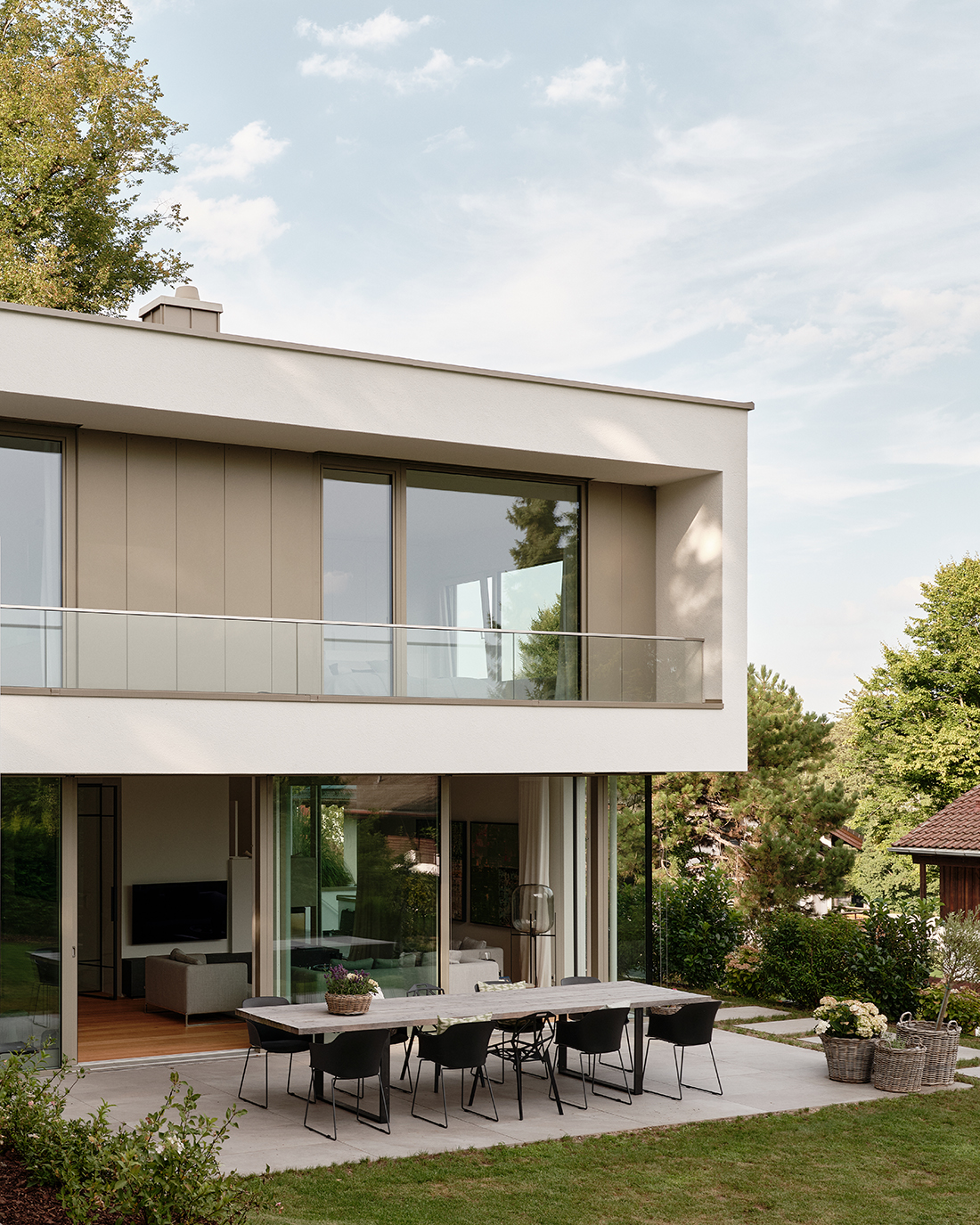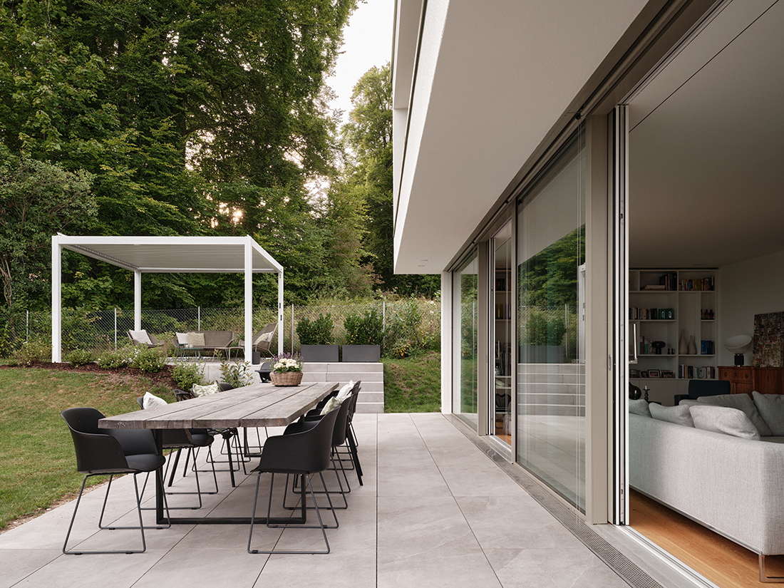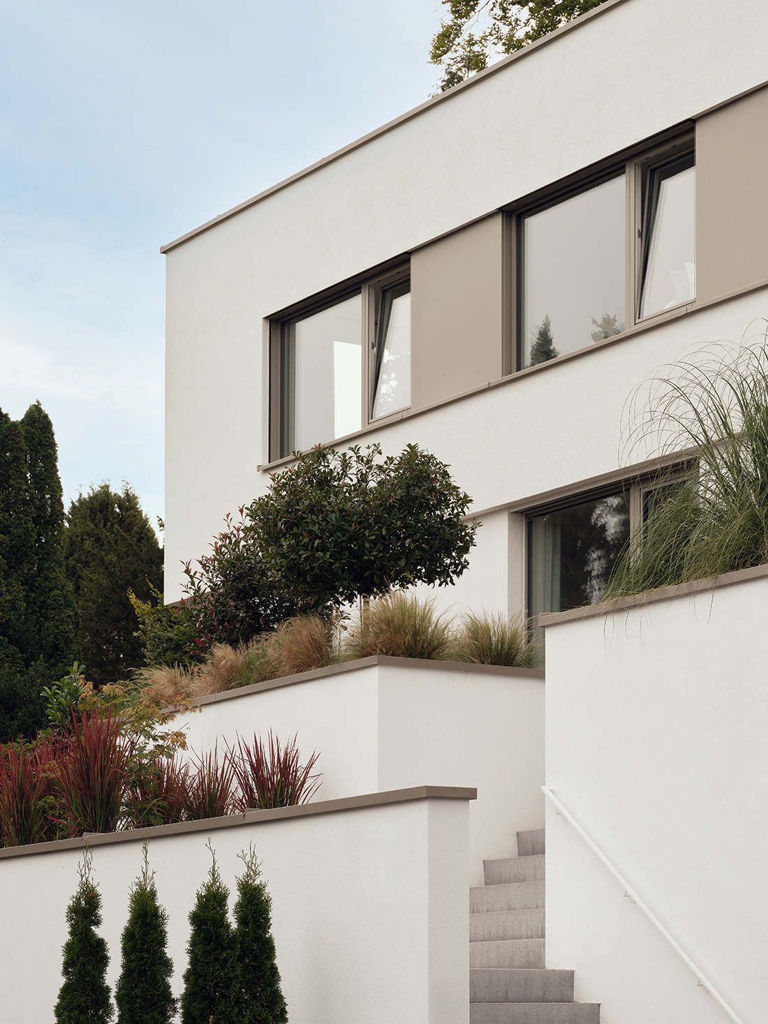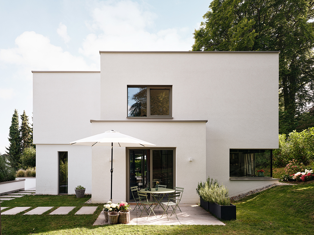 A latticework of white-stained wood acts as a filter layer like a garment, creating a staggered effect among the structures and allowing the upper floor to float elegantly above the slope. These slats still need to be sampled in detail and are scheduled for final installation in 2026. In addition to white-stained wood, the material palette is defined by plaster surfaces in various textures and anodized aluminum in an elegant, light gray-bronze tone. This makes it difficult to discern the timber structure hidden behind it, which, together with a heat pump, meets the KfW 55 standard.