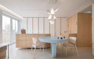All the rooms are situated in the tower while the technical background occupies the semi recessed base. This makes the tower look thinner and not blocking the view from forest. The peak of the tower is occupied by office that serves as an observation point. We used the same language of wood material in both exterior and interior of the house. The spruce wood was used as a main construction material. It serves as a load bearing structure as well as facade cladding and interior paneling.