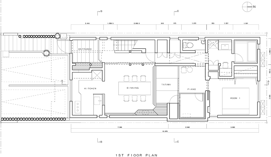 This is a complete renovation of a detached house located in Kyoto City. Situated at the focal point of a narrow alley’s axis, the façade is designed to convey a sense of frontality. While retaining the existing structure as much as possible, each space is connected both in plan and in cross-section, creating new experiences in everyday life.