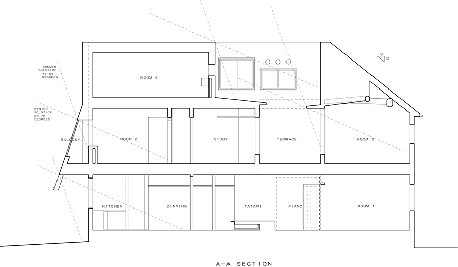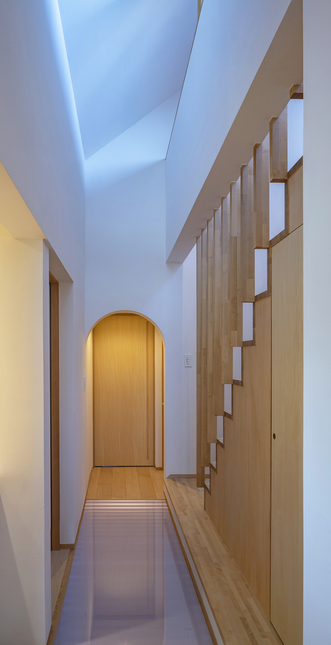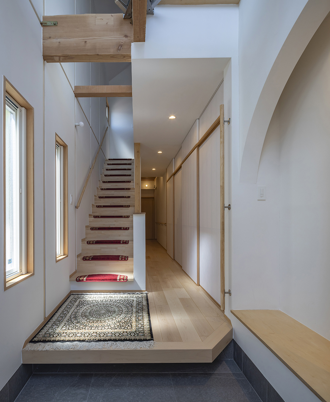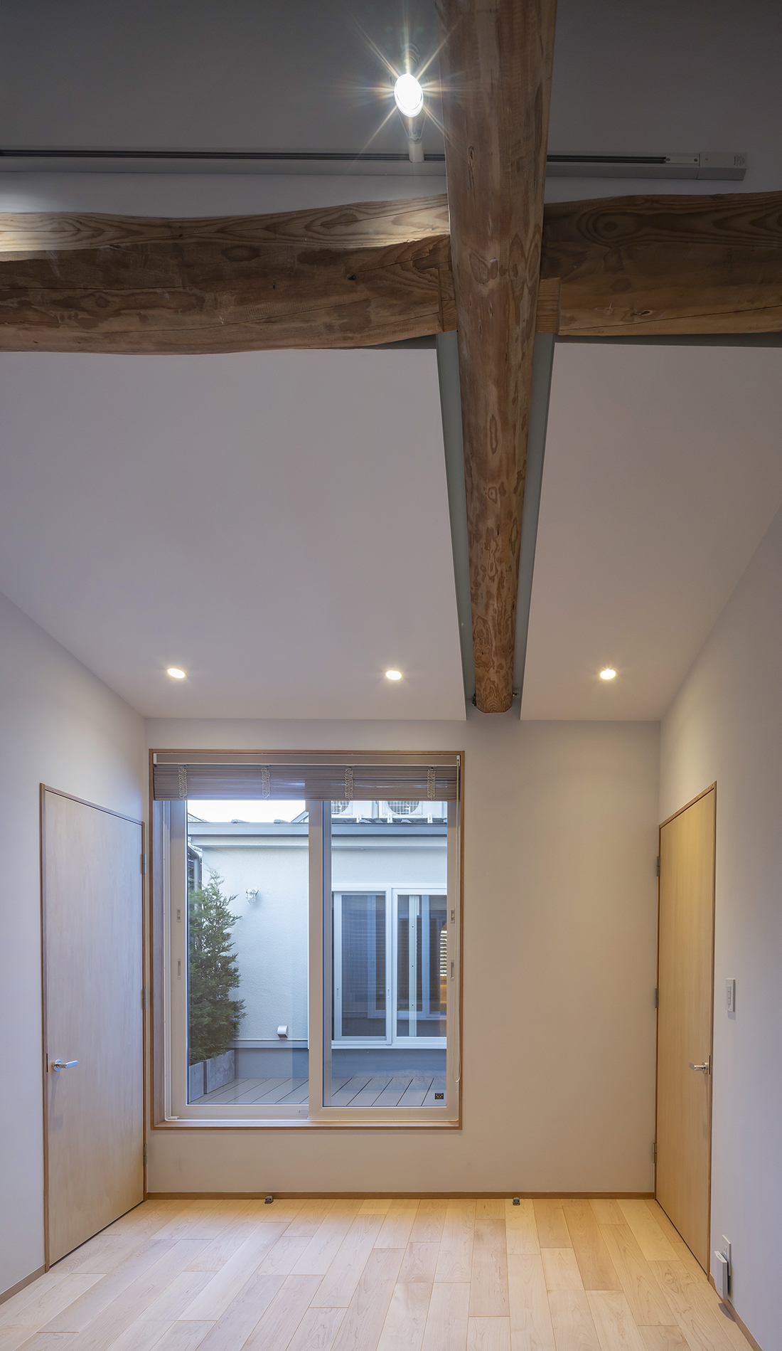 The space leading from the entrance to the corridor and staircase has been remodeled into an atrium that extends through three floors to the loft. A large opening window on the south side allows natural light to penetrate deep into the building while promoting gravity ventilation. Sliding doors, shoji screens, and transoms are used extensively in the openings of the fixtures in each room to control sightlines and ventilation. These elements are adapted to the local way of life, while referencing the structure of traditional Kyoto townhouses.