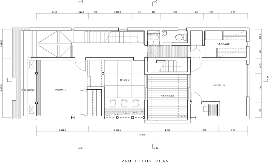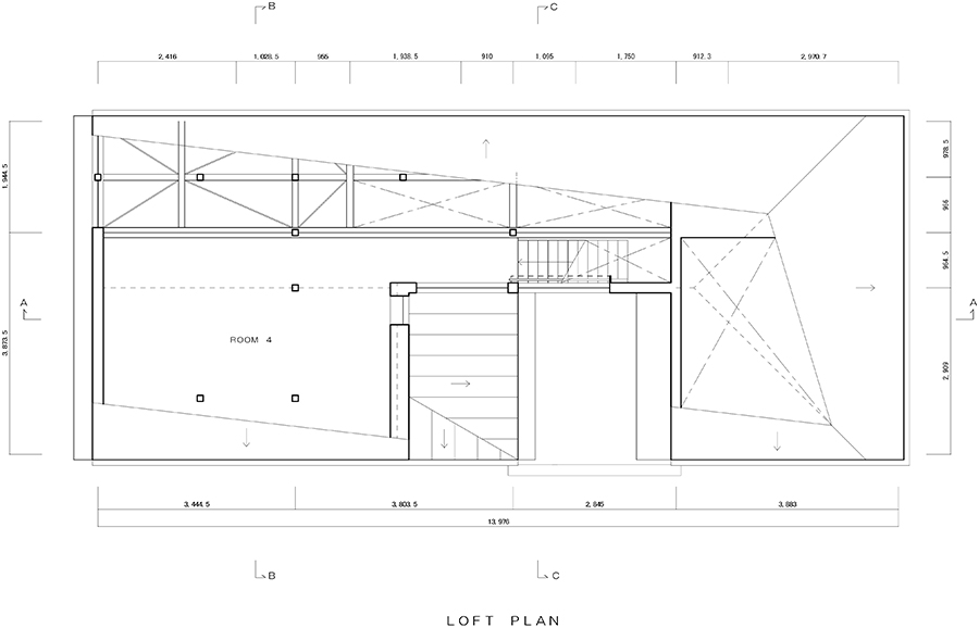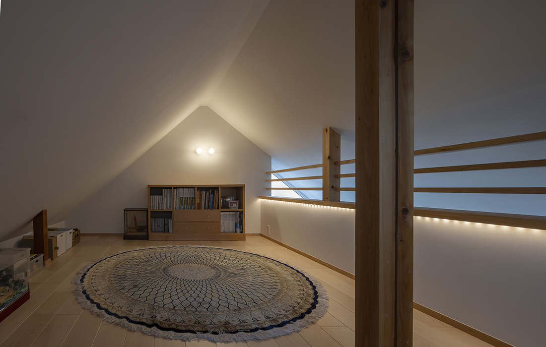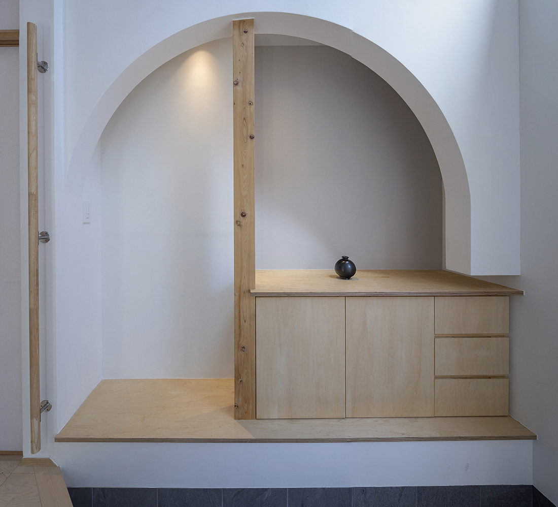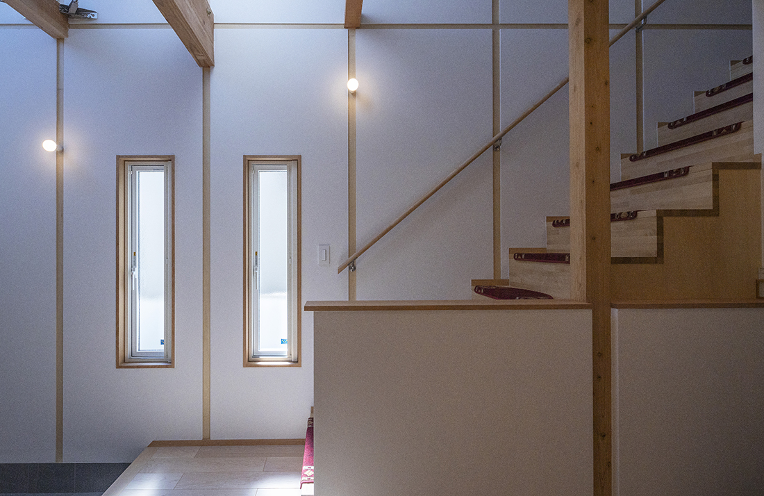The space leading from the entrance to the corridor and staircase has been remodeled into an atrium that extends through three floors to the loft. A large opening window on the south side allows natural light to penetrate deep into the building while promoting gravity ventilation. Sliding doors, shoji screens, and transoms are used extensively in the openings of the fixtures in each room to control sightlines and ventilation. These elements are adapted to the local way of life, while referencing the structure of traditional Kyoto townhouses.