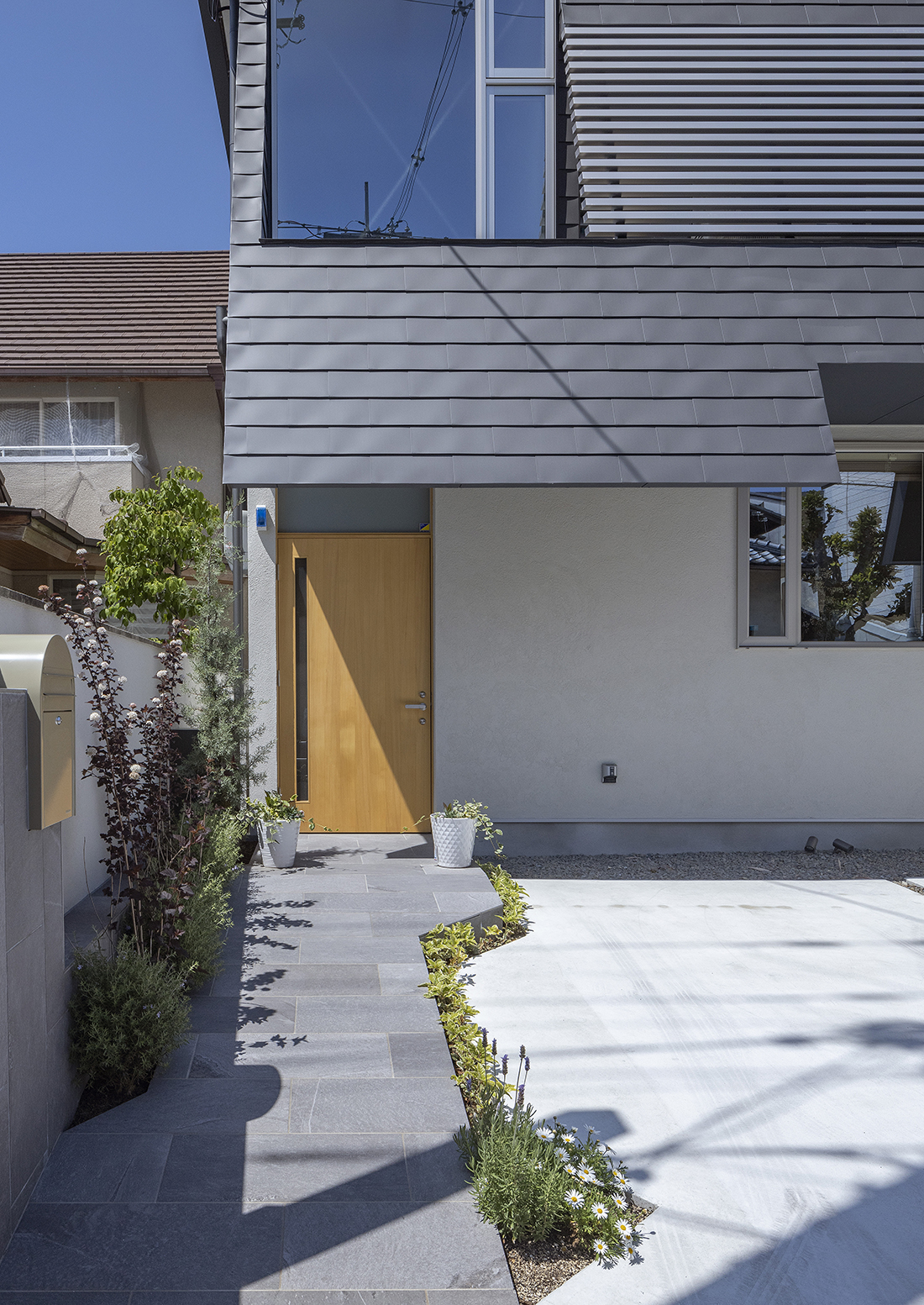 The south façade, covered with galvalume steel sheets and aluminum louvers, features a 250mm air gap behind it to manage the harsh summer sunlight. The wall surface, balcony railing, entrance eaves, and louvers are seamlessly integrated, creating a strong façade with a sense of frontality.