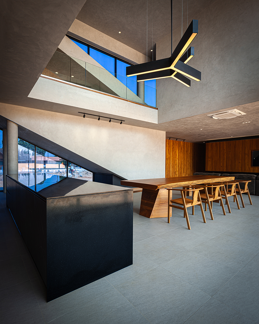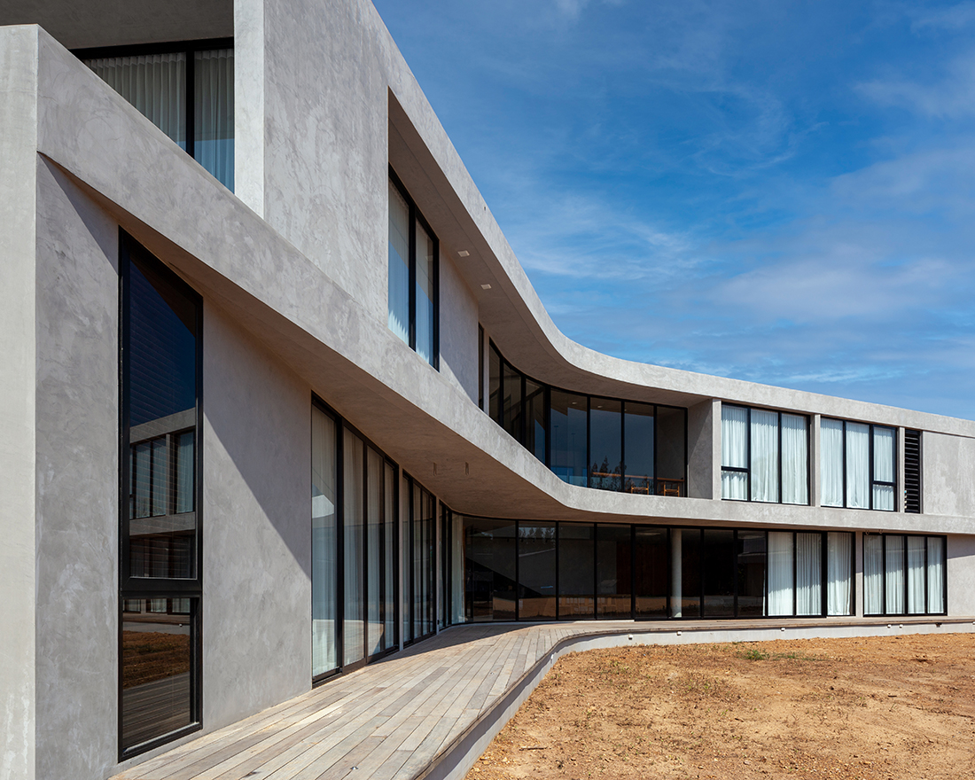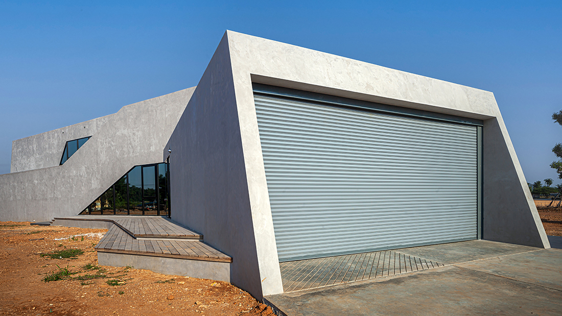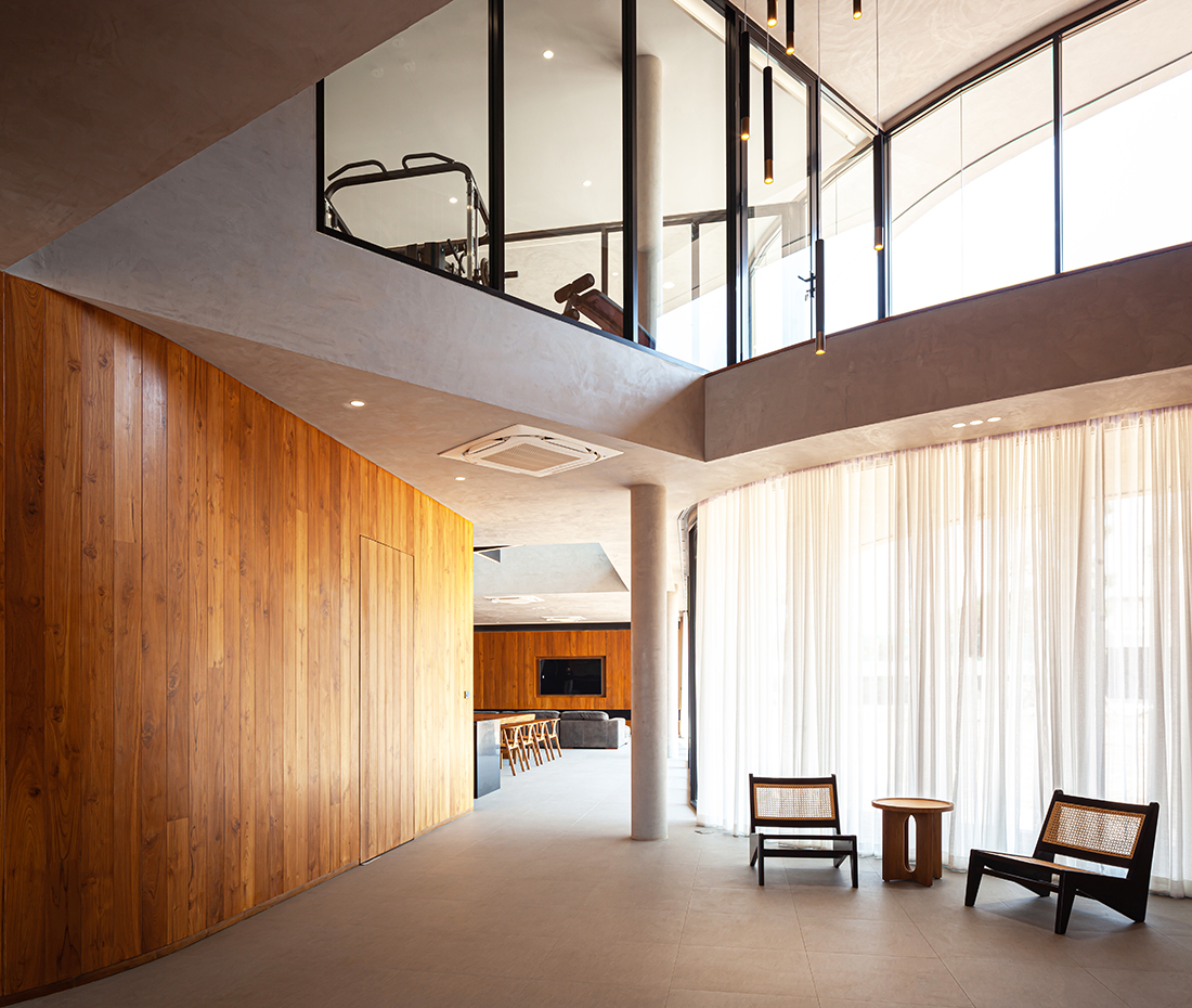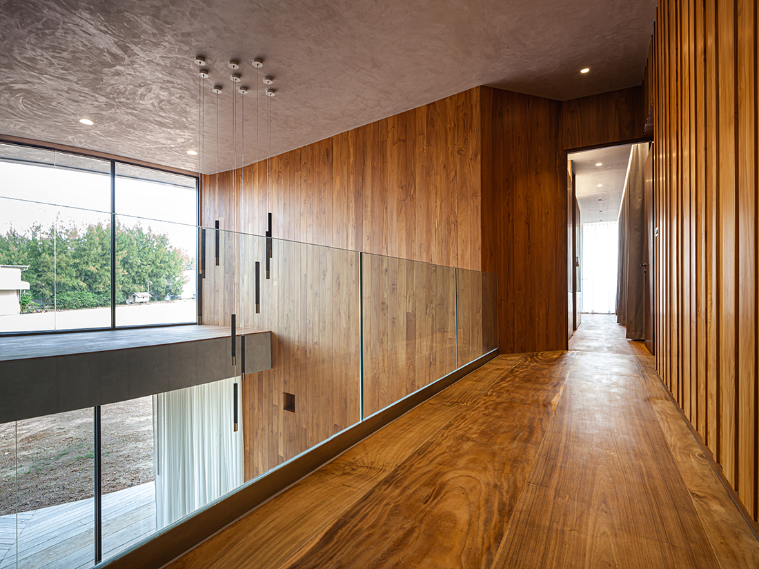 Aside from the continuity of lines and spatial program, the exterior of the house is created as a cohesive concrete mass, merging the residence with its immediate environment in a monochromatic concrete color. Wood is used as a primary component of the interior space, making the overall mood and tone ideal for a living space. The name “House in the Dust” conveys the characteristics of the project and extends beyond the physical appearance of the architecture to the owner’s way of life.