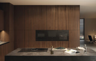 The material palette is reduced: a covering of vertical sawn extends as a continuum over the façade and the inclined roof. Elements such as the canopy and the balcony are made of blackened steel. The grey plastered north and south façades are set back in relation to the wood paneling, and perceived as a framing. The interior is dominated by larch and pine wood.