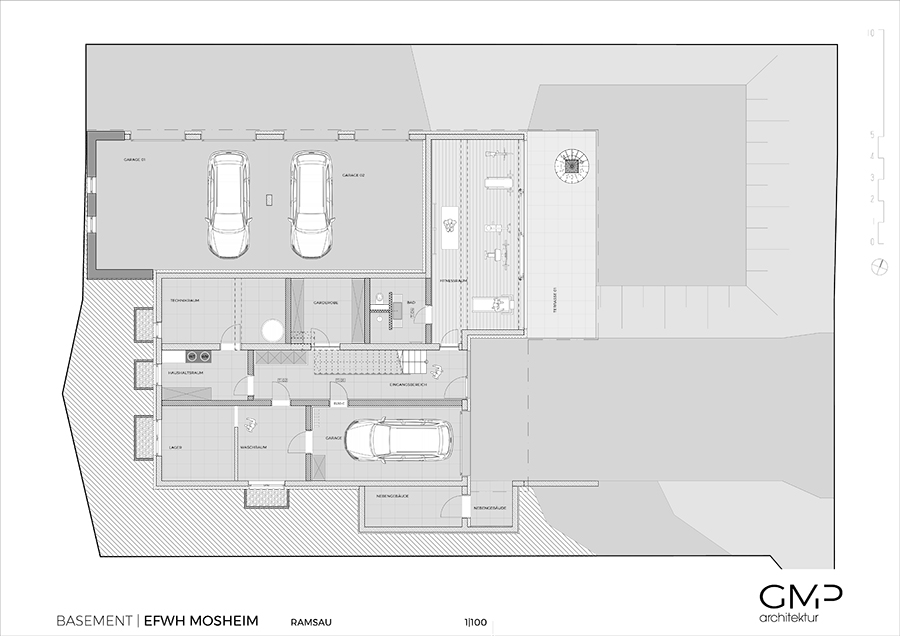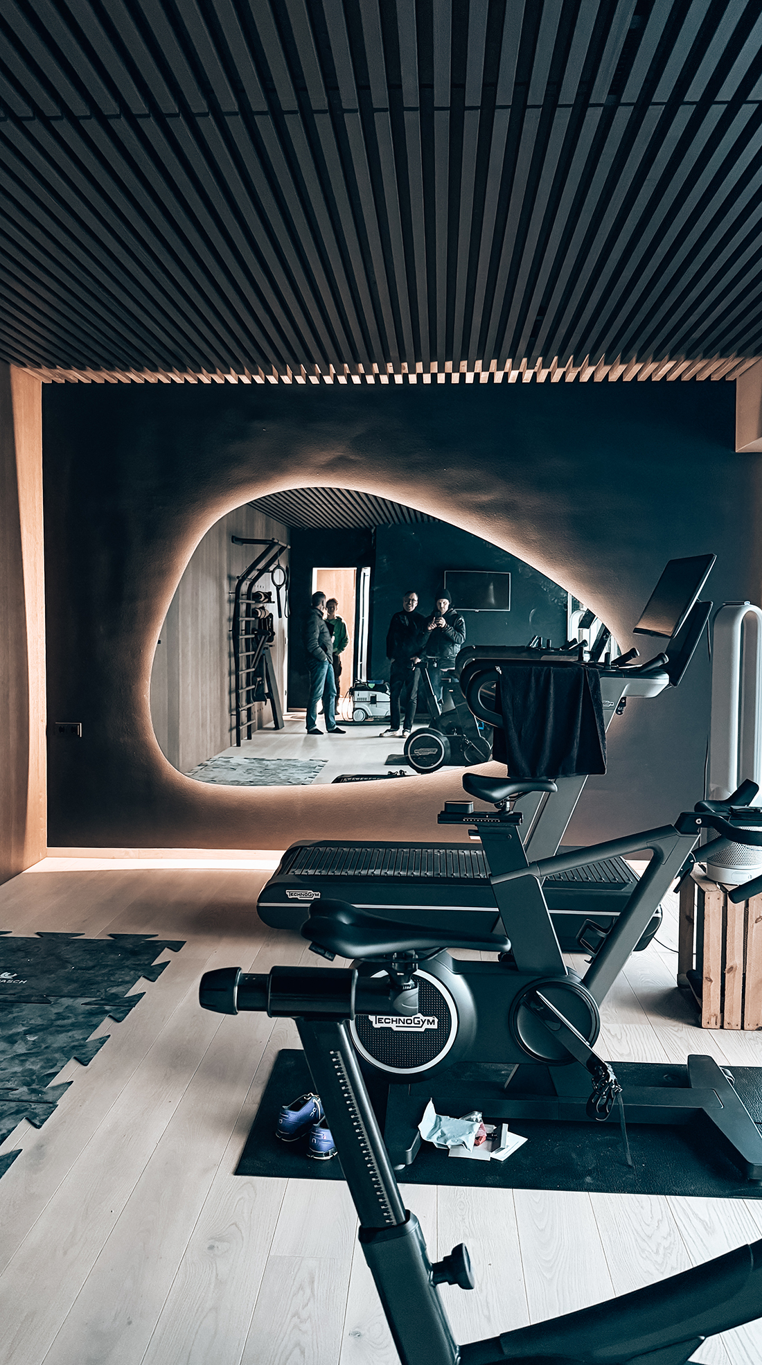Basement: The basement floor, constructed entirely from reinforced concrete, houses the technical rooms, adjoining spaces, and a large gym. A cantilever staircase serves as the central focal point, connecting the basement to the open living area above. The use of reinforced concrete ensures high stability, supports slope loads, and maintains an optimal indoor climate in the underground spaces.