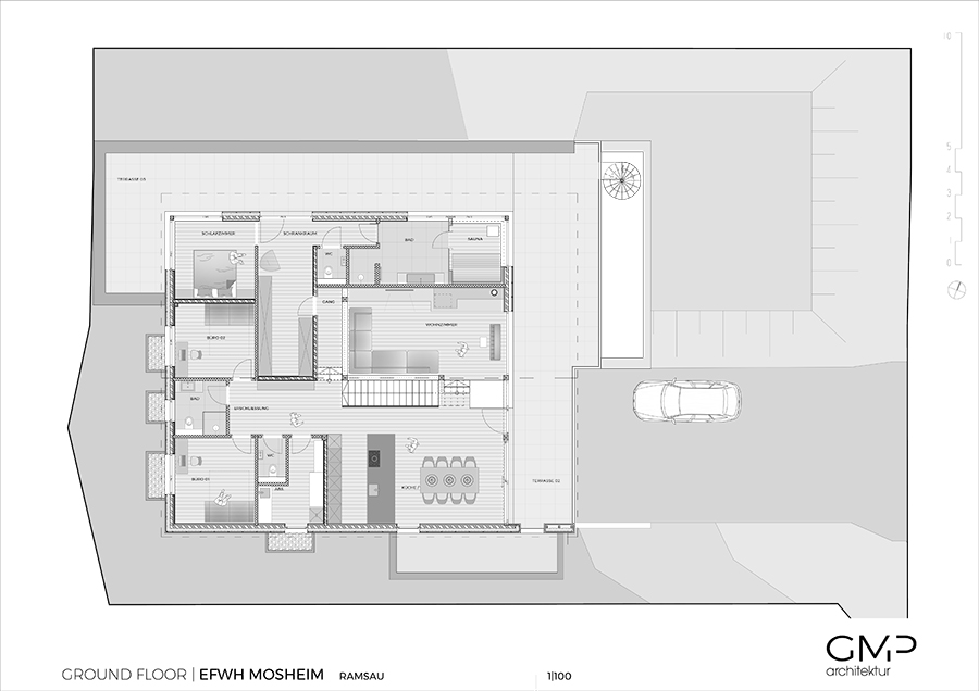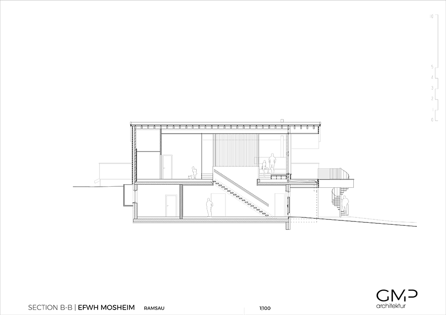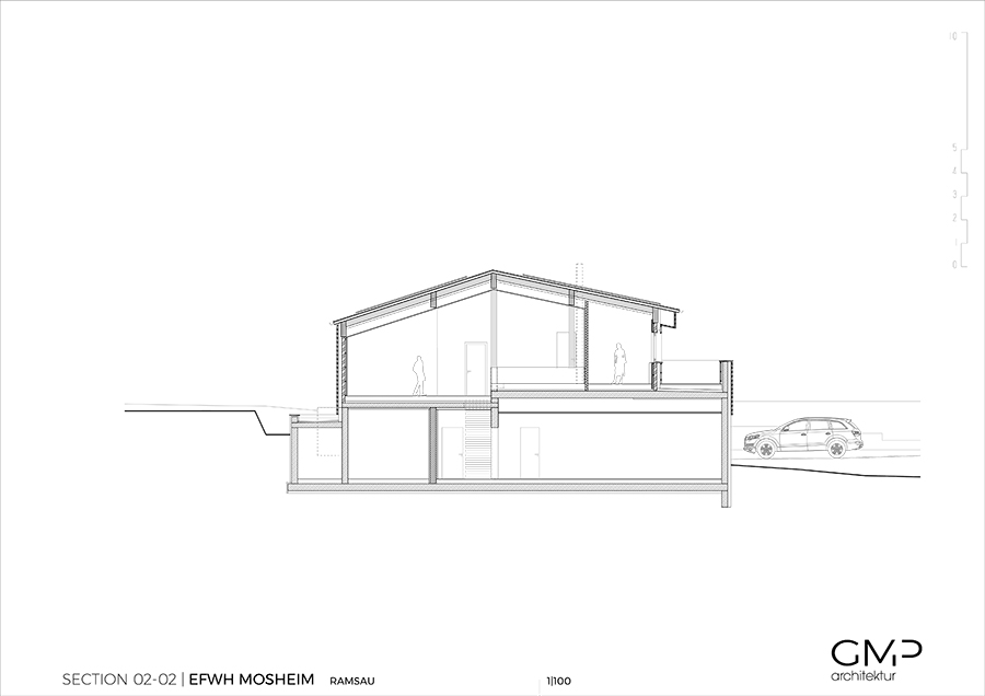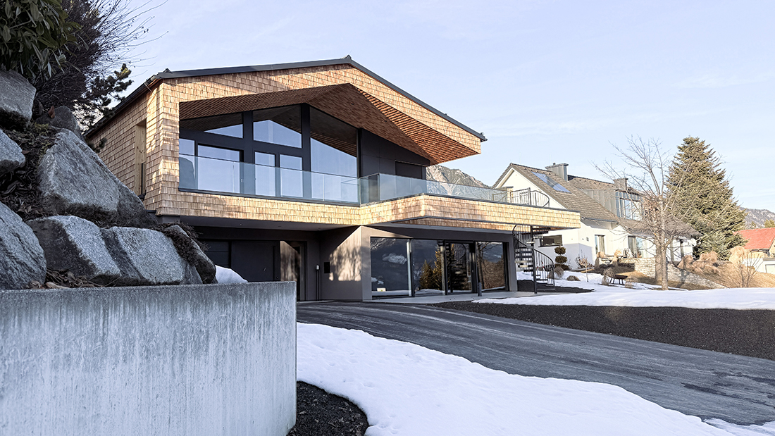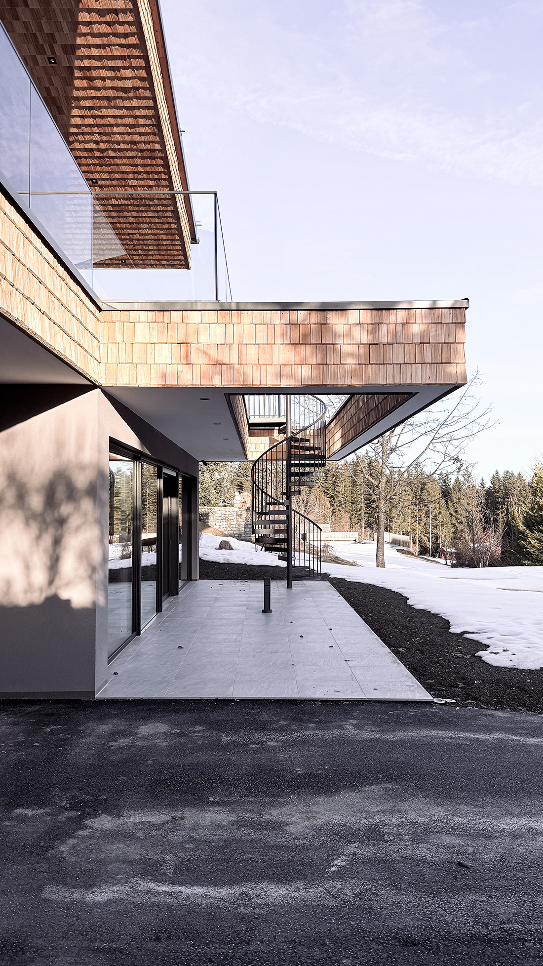 The planned single-family house combines the robustness of reinforced concrete with the natural warmth and elegance of wood, blending harmoniously into the appealing hillside setting. The building is situated atop an existing four-story garage.