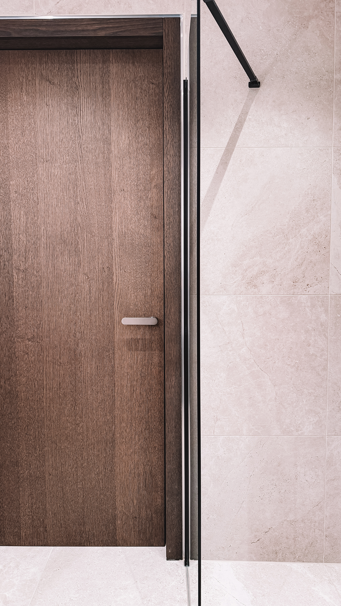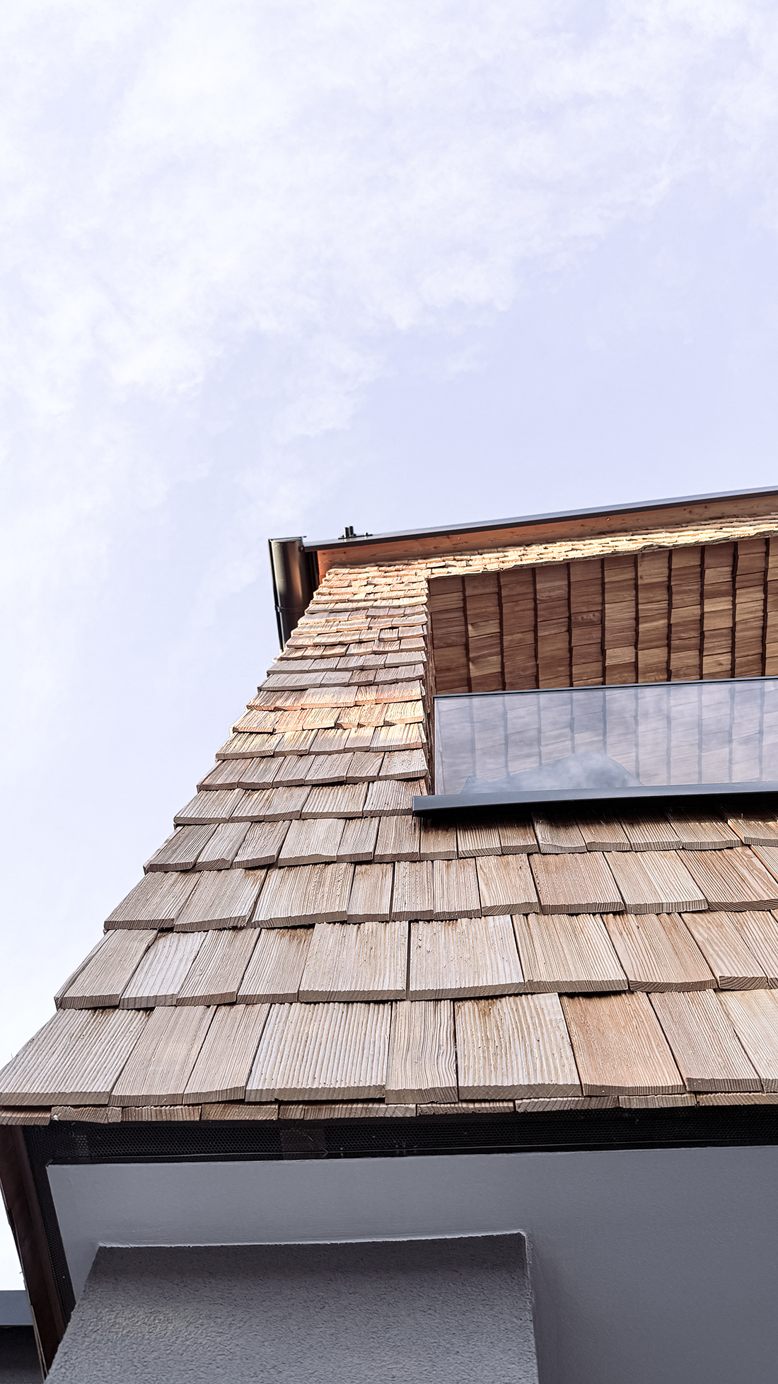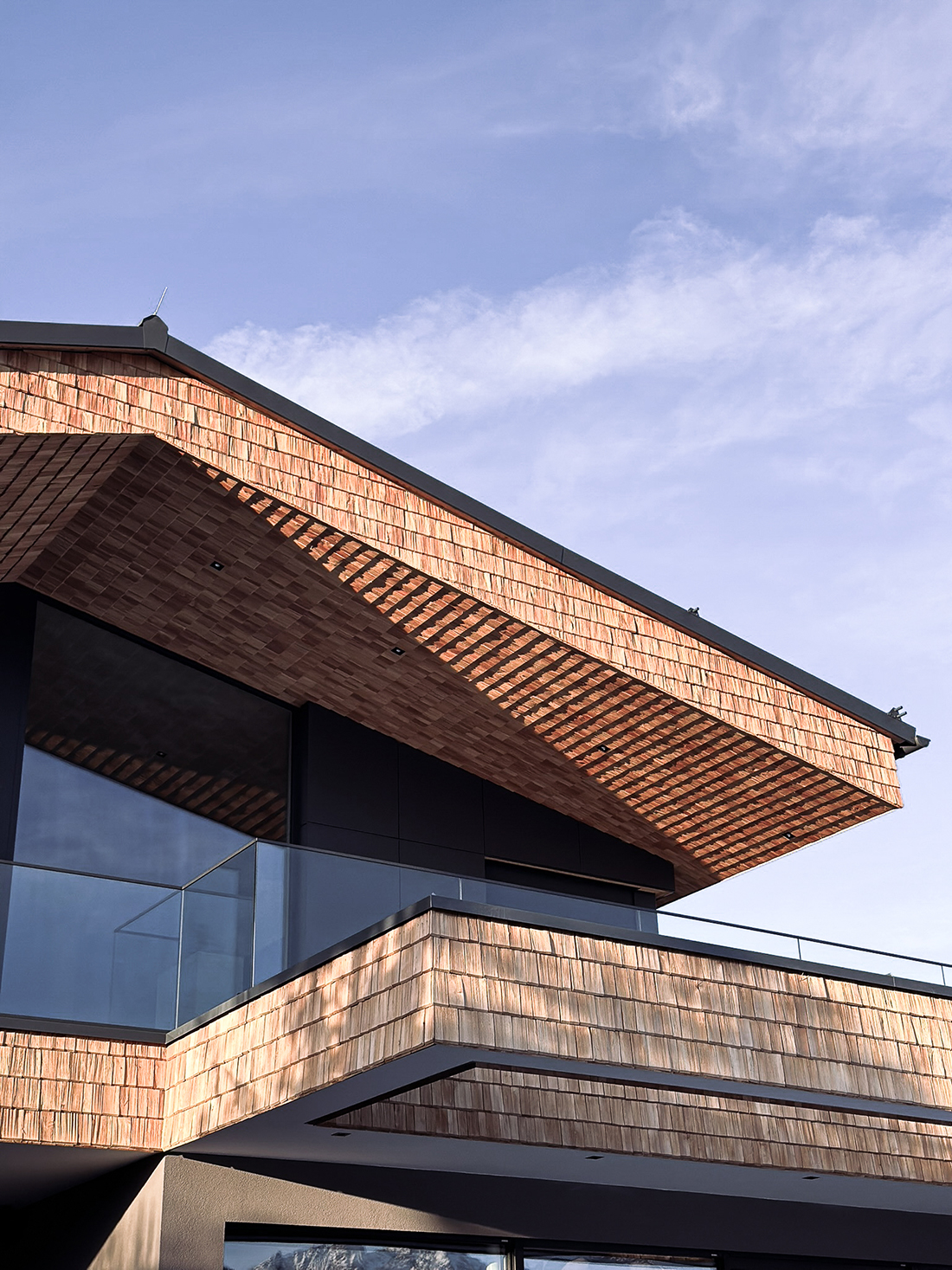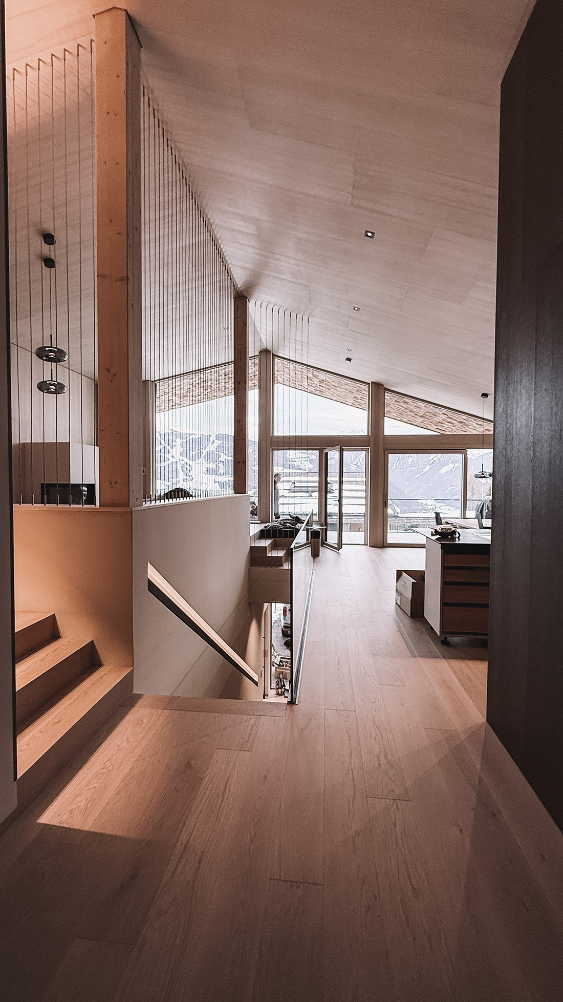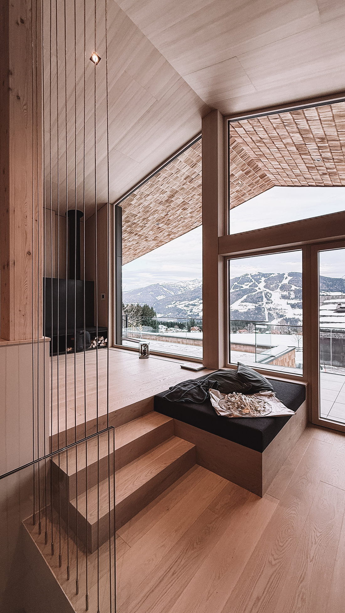 Materiality and accents: To highlight the clean, modern architecture, dark oak wall paneling was incorporated as an architectural accent. These panels provide an elegant contrast to the lighter fir wood paneling, adding timeless sophistication to the living space. Large windows fill the interior with light and provide expansive views of the surrounding landscape.