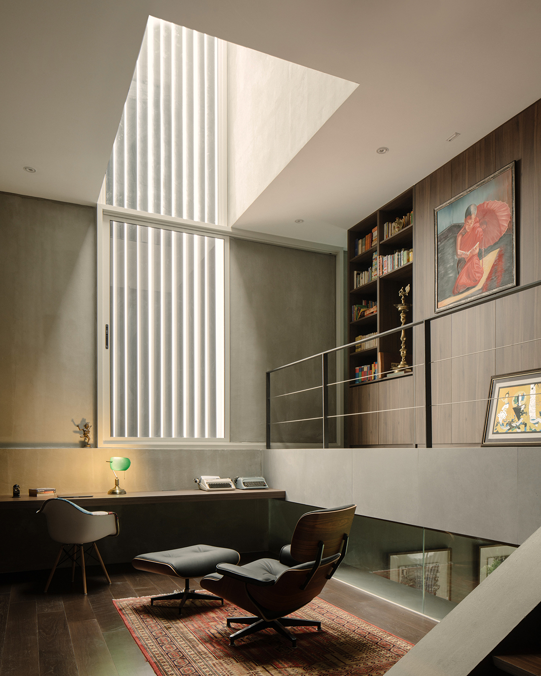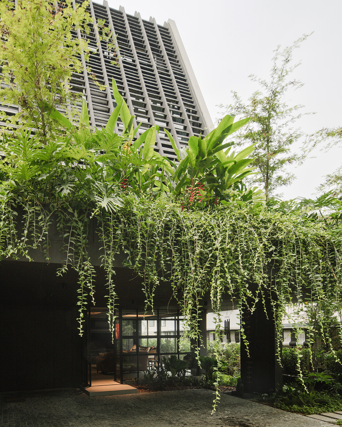 The design explores the interplay of spatial compression and expansion, guiding residents from intimate, enclosed areas to generous, open volumes. In the living room, subtly lifted side walls frame views of the surrounding trees, reinforcing an immersive connection to nature. A slanted screen, which also serves as the roof, softens the street presence while asserting a confident architectural identity. It also functions structurally, lifting the house above the ground to create an airy, open living environment.