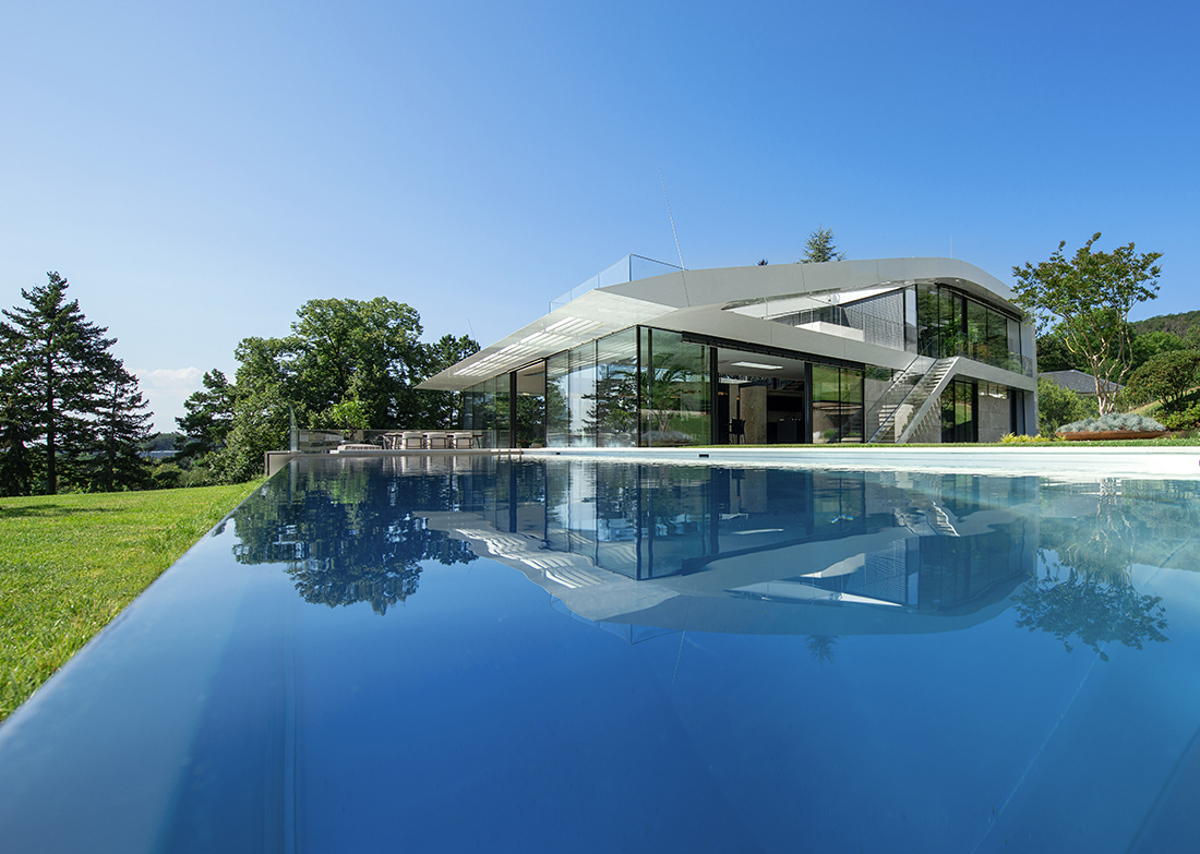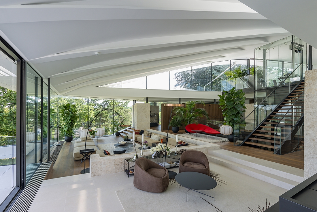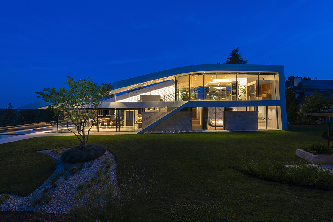 Outdoor areas reflect the interior zoning, with a spacious terrace and pool that extend the living space, enabling a seamless indoor-outdoor transition. A curved, cantilevered roof shelters both levels, optimizing views and passive solar gains with integrated panels. The building is powered by a geothermal system with a heat pump, passive cooling, and earth ducts for sustainable climate control.