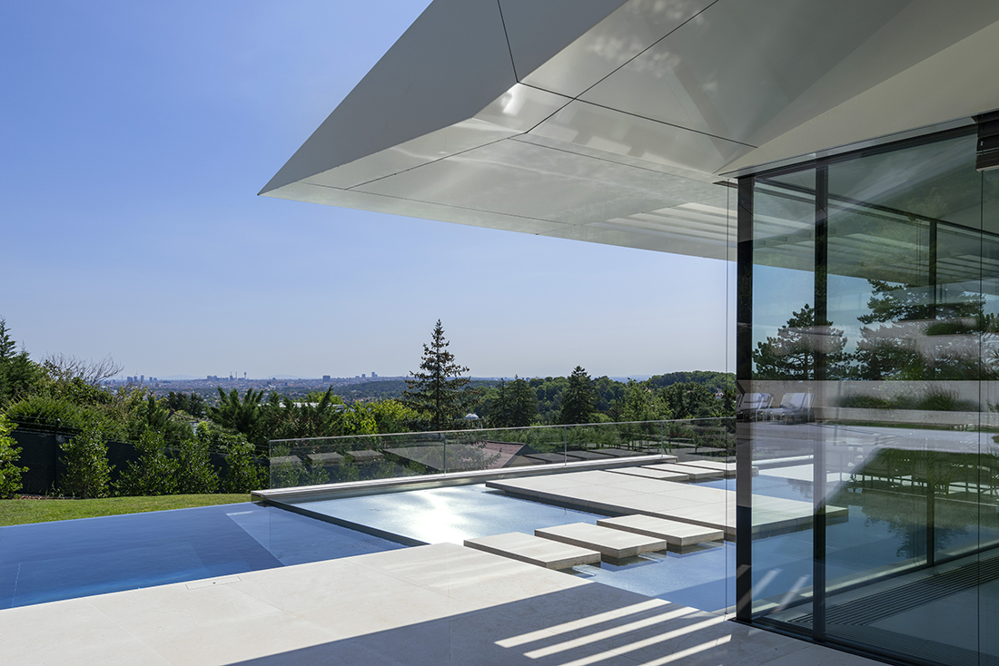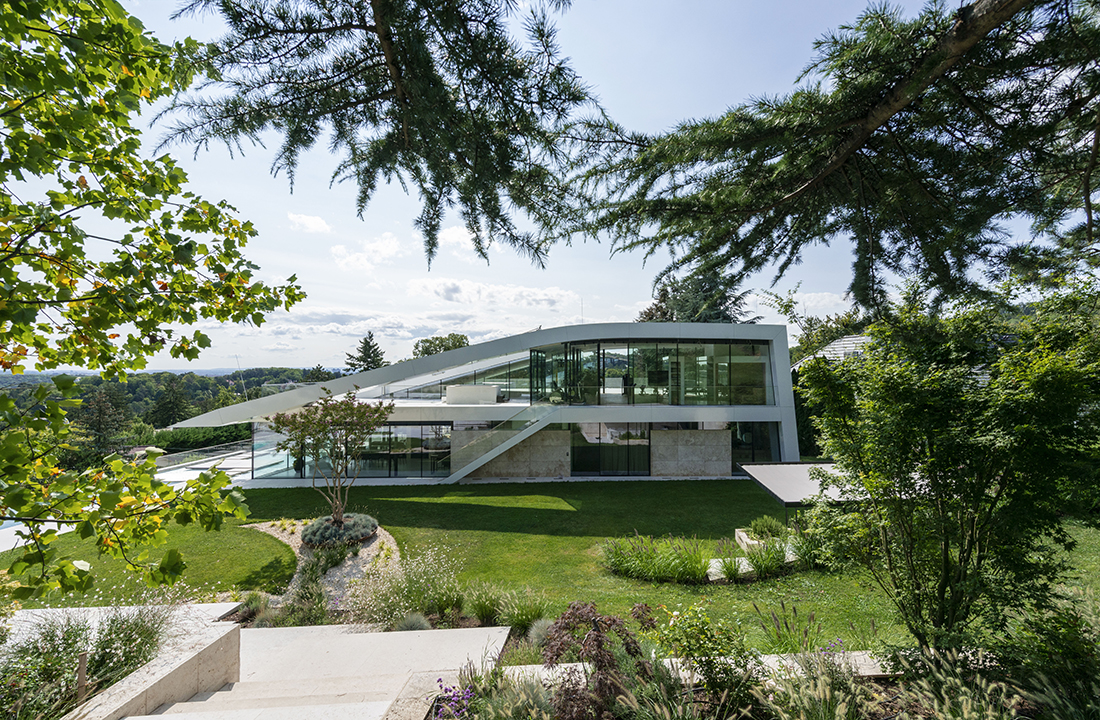 House P is located on the green outskirts of Vienna, nestled in the foothills of the Wienerwald. The design integrates the building harmoniously into the landscape, emphasizing a strong connection with nature and idyllic views. Expansive, interconnected living spaces create a panoramic experience with unobstructed sightlines.