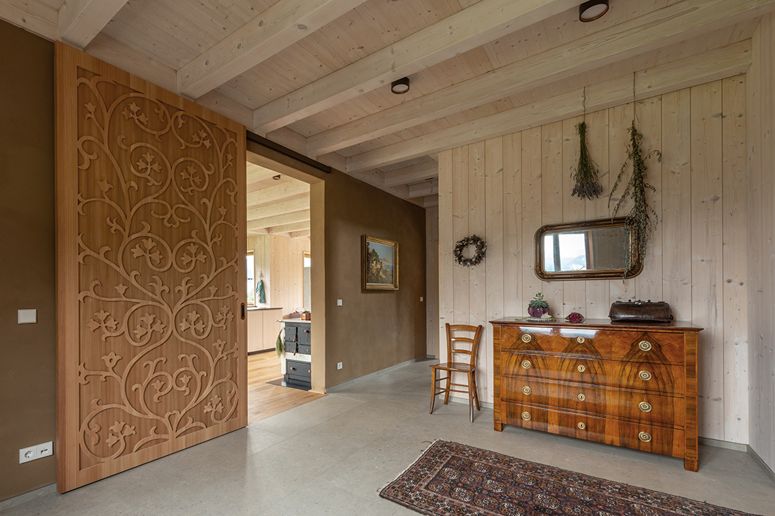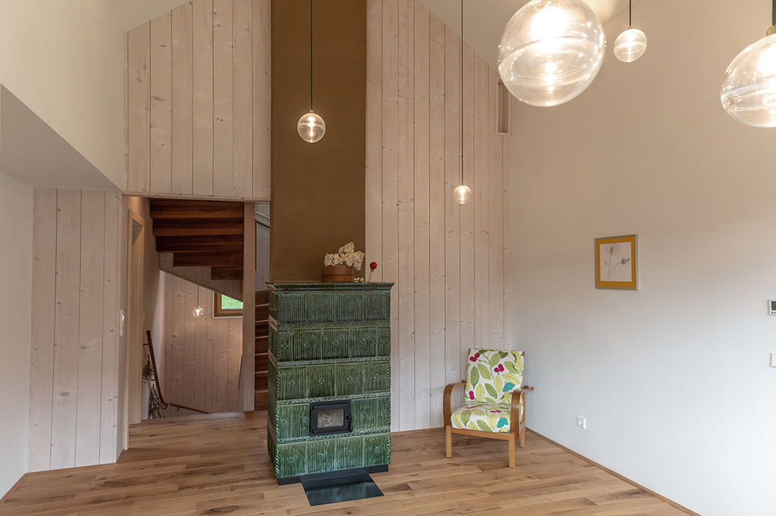 The walls of the house are constructed from massive wood boards joined mechanically, without the use of glue. The central wall is made of clay, and the ceilings are tram ceilings. The façade features a traditional local wooden design with cover strips, honoring the region’s architectural heritage.
