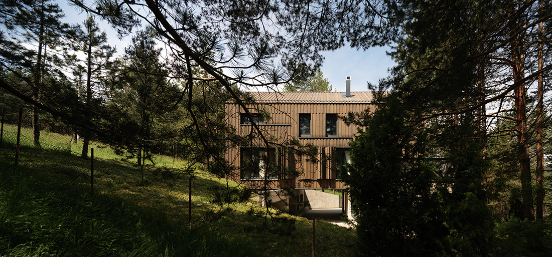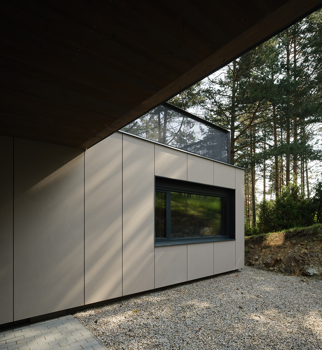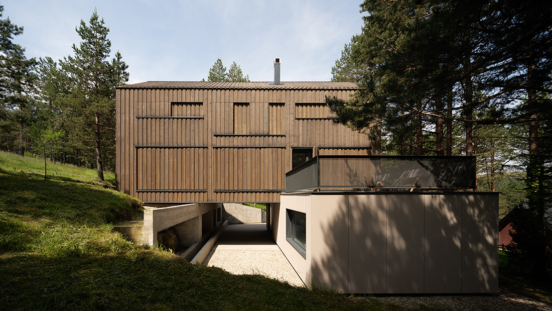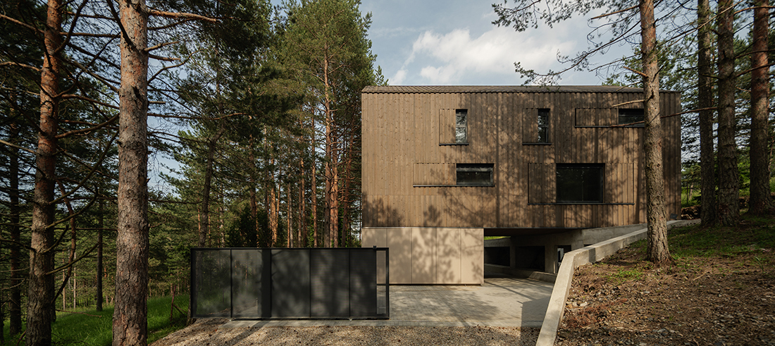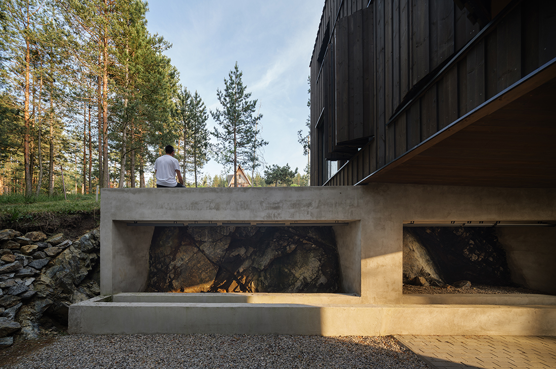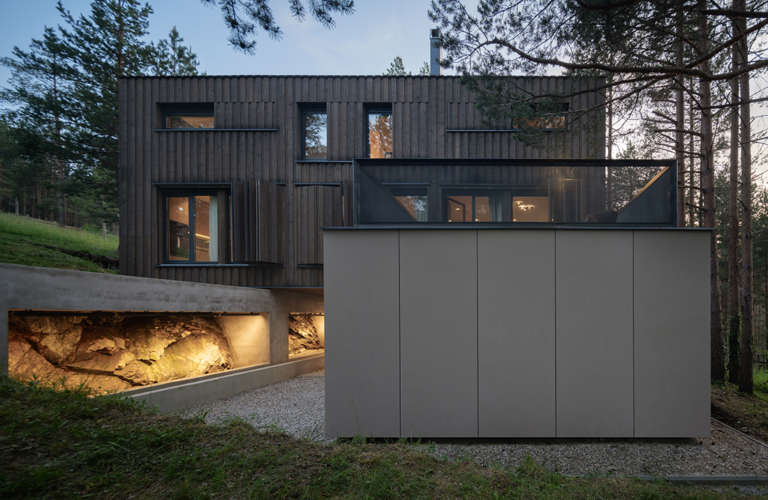 Positioned directly along the natural south – north slope of the terrain, the house is accessed from the lower side, with a covered entrance and integrated parking beneath the structure. This thoughtful placement not only responds to the topography but also optimizes the orientation of the living and sleeping areas, allowing for expansive views toward the surrounding pine forest. The southern façade is anchored on the existing natural rock formation, reinforcing the connection between architecture and landscape while ensuring minimal intervention in the natural environment.