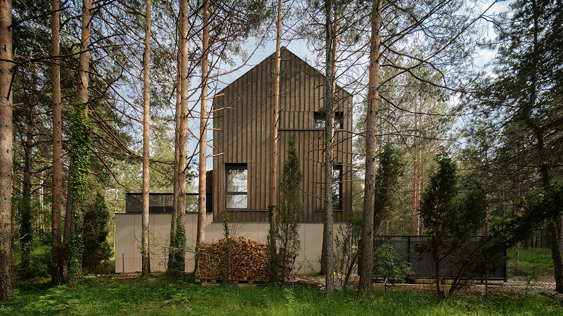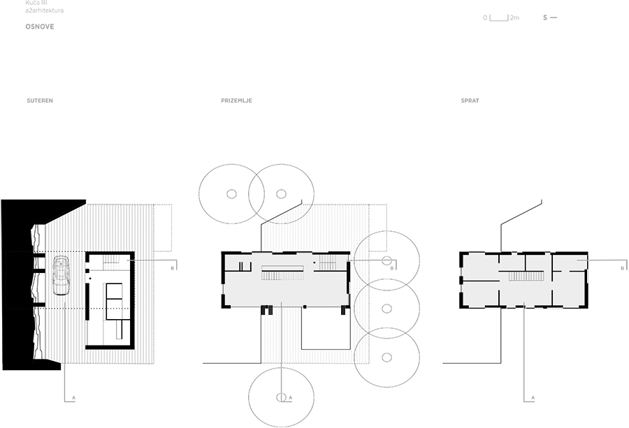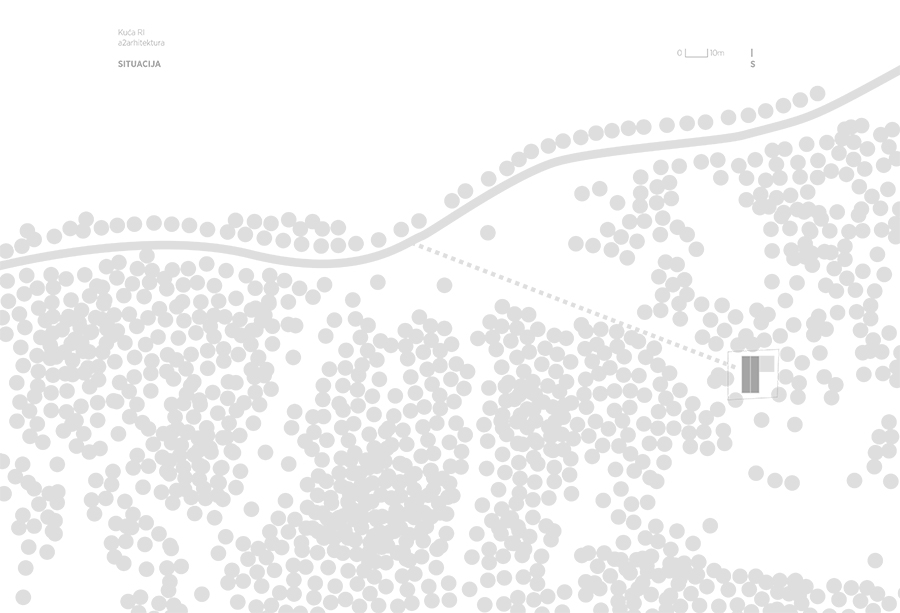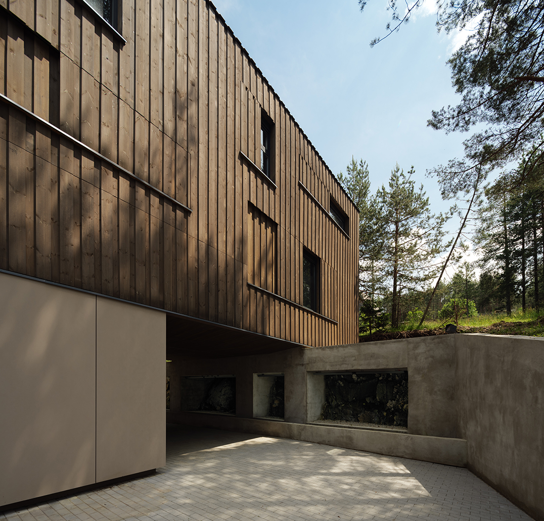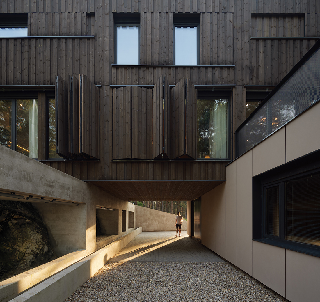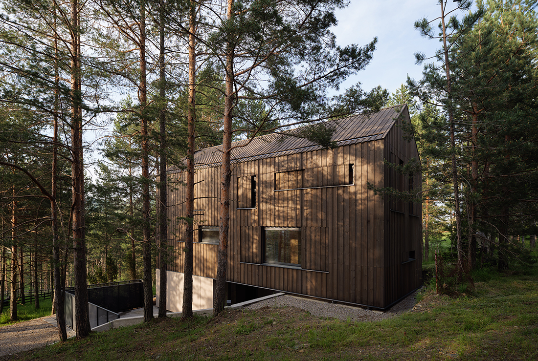 Positioned directly along the natural south – north slope of the terrain, the house is accessed from the lower side, with a covered entrance and integrated parking beneath the structure. This thoughtful placement not only responds to the topography but also optimizes the orientation of the living and sleeping areas, allowing for expansive views toward the surrounding pine forest. The southern façade is anchored on the existing natural rock formation, reinforcing the connection between architecture and landscape while ensuring minimal intervention in the natural environment.
