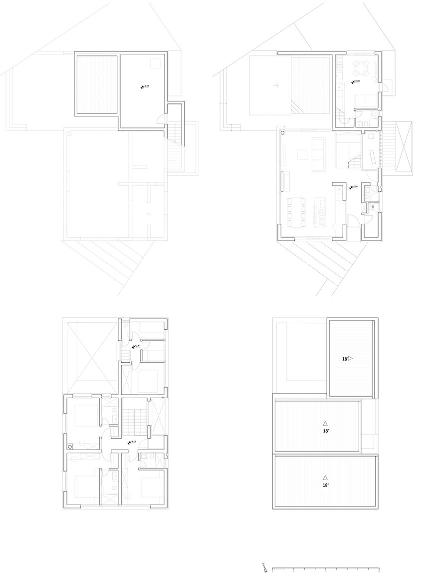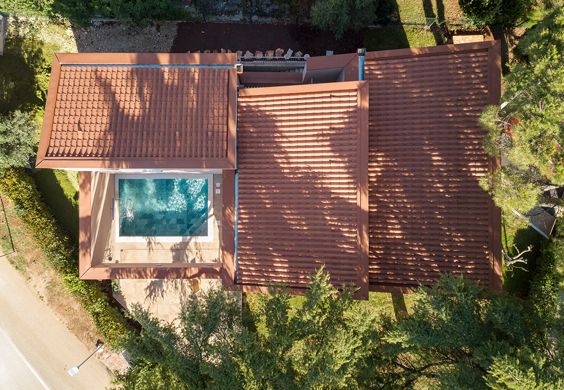 Key features include single-pitched roofs, modern horizontal glazing, and proportions inspired by traditional Istrian houses. The two interconnected units, totaling 286 square meters, are arranged around two atriums: a pool atrium for communal gatherings and a sculpture atrium for contemplation. Outdoor spaces are carefully integrated with the interiors through large openings, creating dynamic transitions between zones.