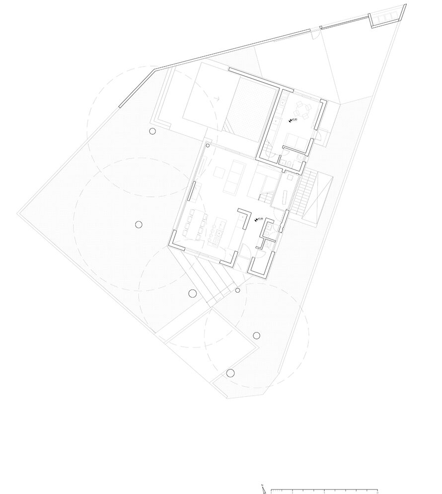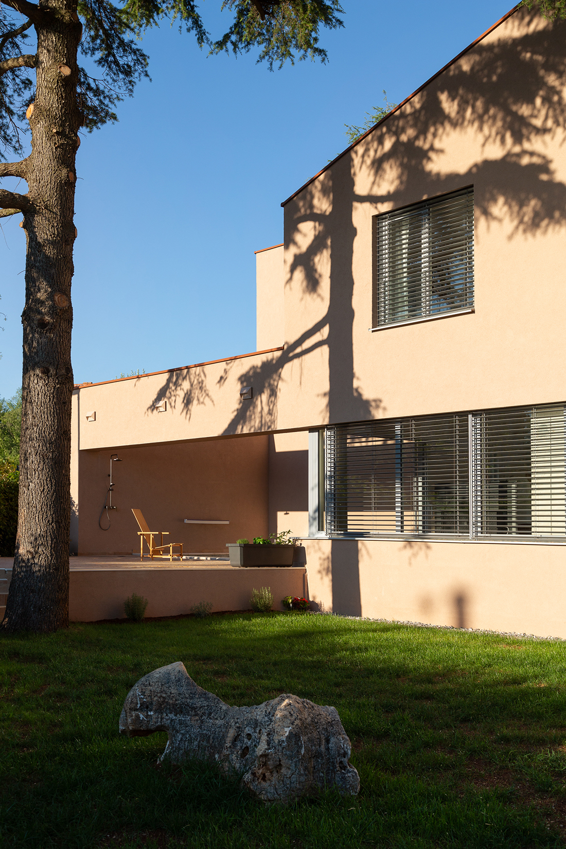 The House Under the Pines is an architectural complex of two buildings located in Karpinjan near Novigrad, Istria. Completed in 2024, it includes an owner’s vacation home and a rental house, designed to integrate into the local context of family homes with tourist rentals. The project replaced an existing house and incorporates spaces for the owner’s sculptures, blending traditional Istrian architecture with modern design elements.