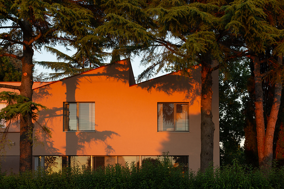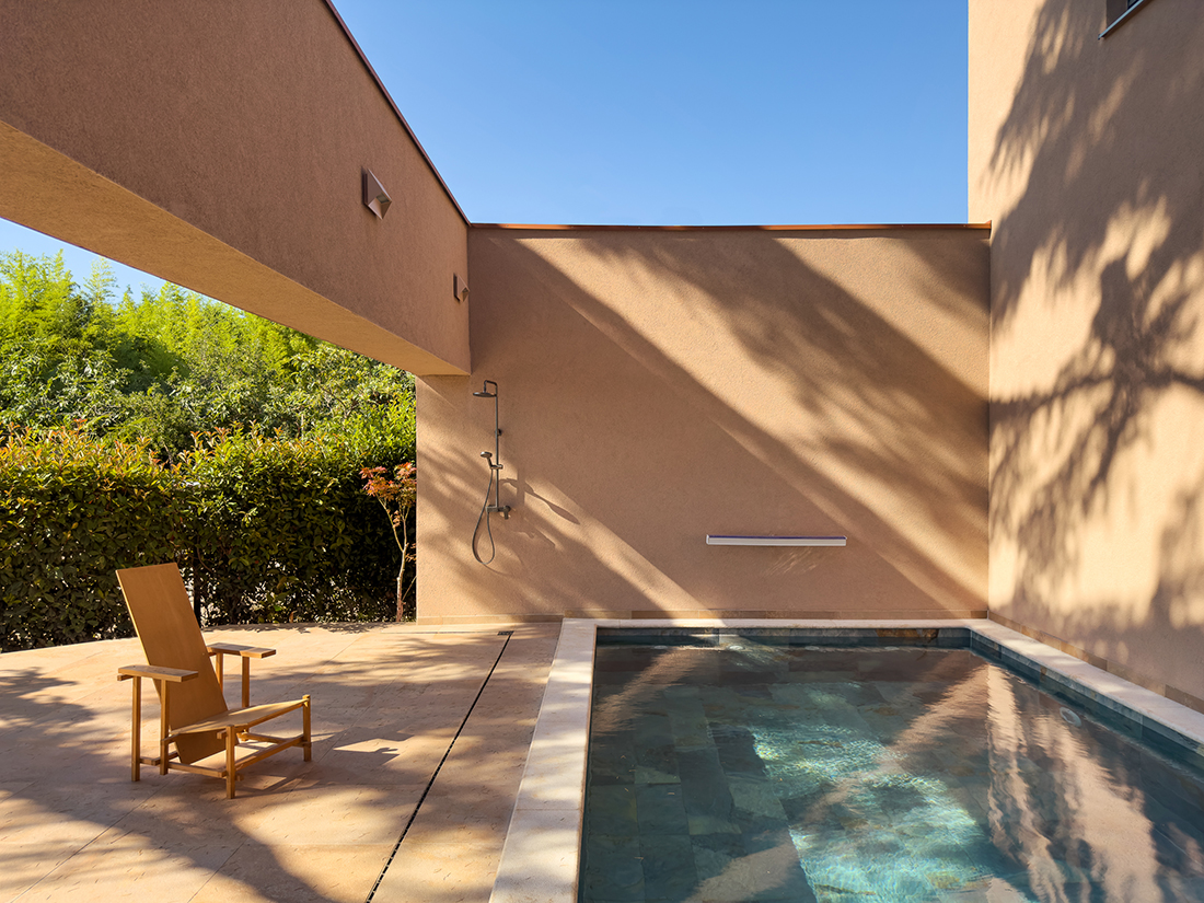 Sustainability and context define the project, with preserved Aleppo pines and cedar trees influencing the layout. The reddish façade complements the greenery, while clean, modern lines emphasize contrasts between traditional and contemporary elements. Inside, achromatic tones, tactile materials, and dynamic views highlight the sculptures, greenery, and water features.