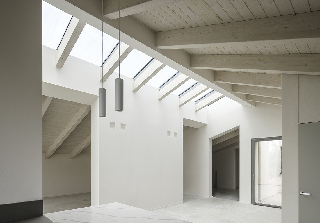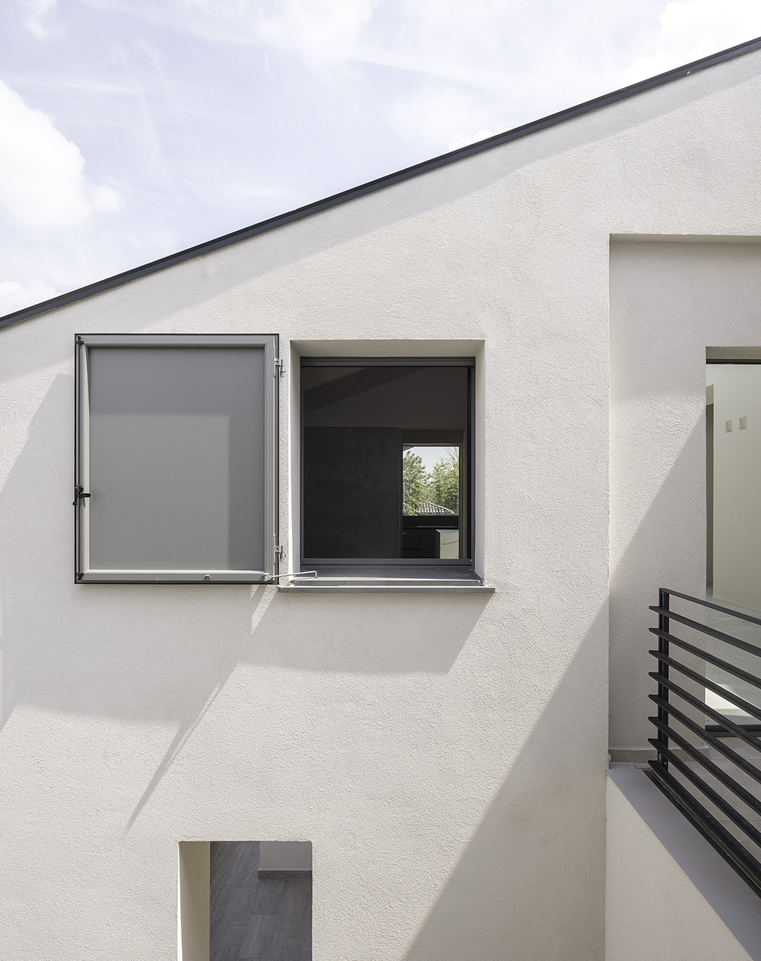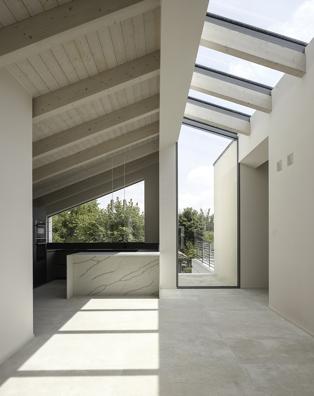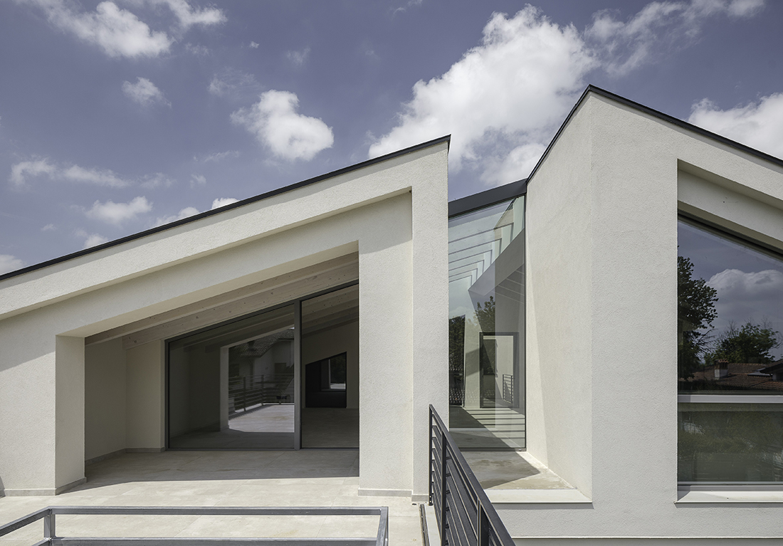 The blocks delineate the new, transformed unit of the first floor. The roofing between the two emerging blocks of the sleeping area (taller, vertical body, with north-south oriented pitches: emerging tower of the complex) and the living area (horizontal body, with east-west oriented pitches: suspended platform in the garden) extends in depth, delineating the extrusion of the portico in height as the staircase. The eastward terrace configures a panoramic bridge to the trees, in compositional dialogue with the westward tower.