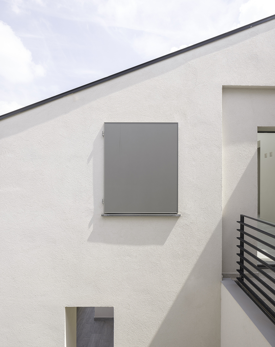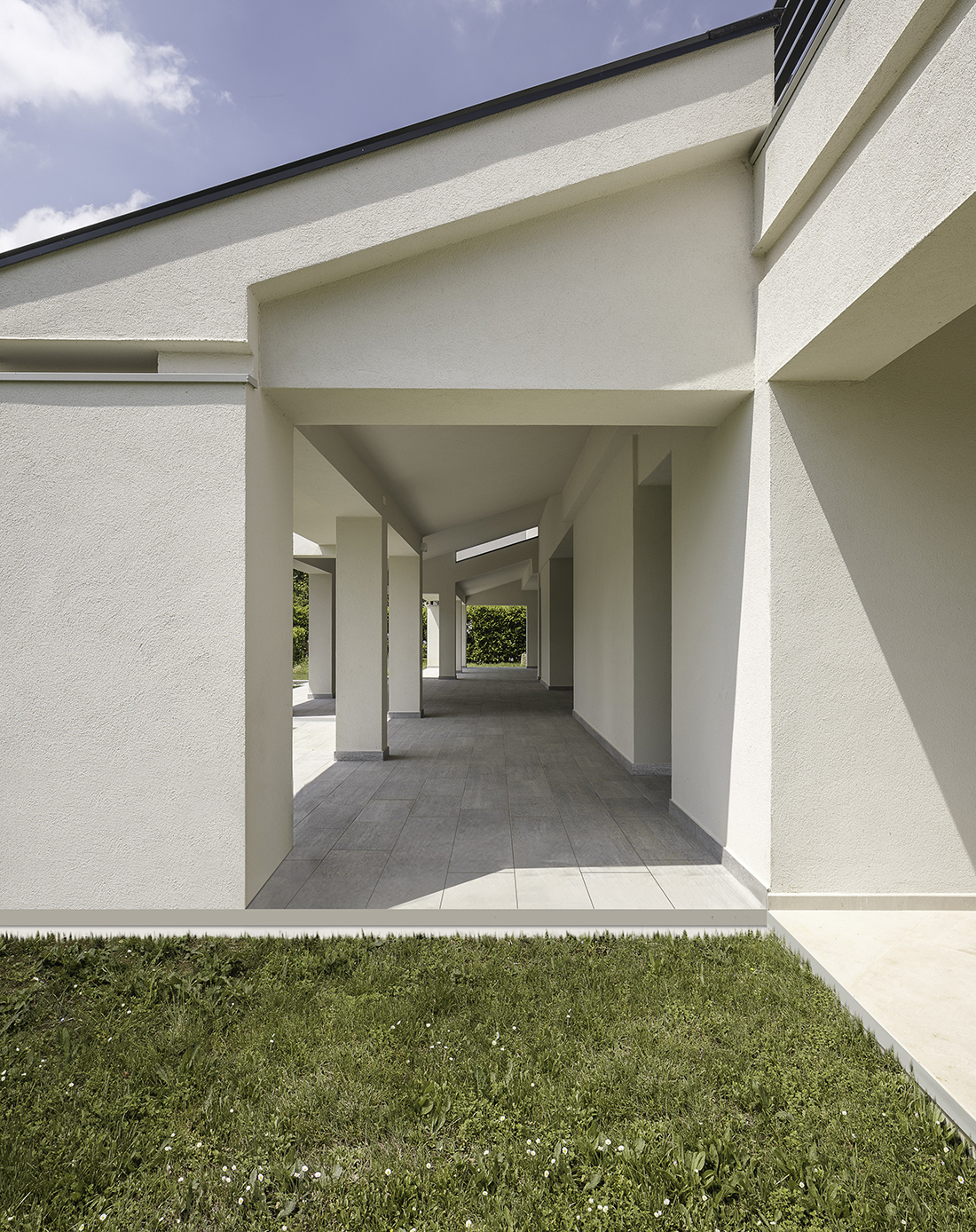 A residential building complex with three apartments extends within a foothill plot. The project reads the porch, a large, southward covered space of mediation between garden and housing units, as an architectural-urban diaphragm and a heritage settlement principle to be reinterpreted, configuring the building, beyond the porch, by juxtaposed blocks side by side, connected by a junction element: the staircase.