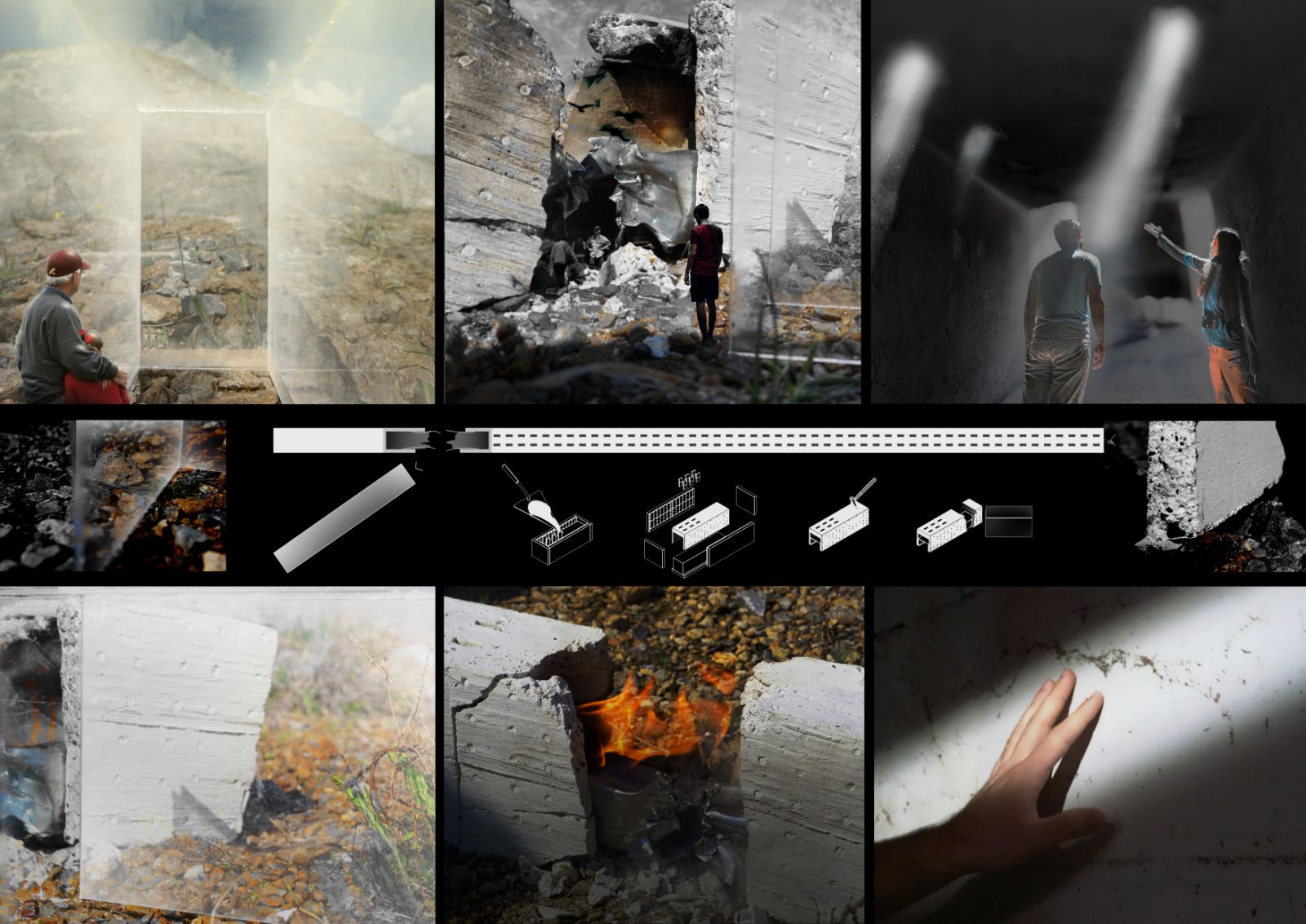 This project seeks to transform trauma into space, offering a journey through contrast: grief and hope, death and life, darkness and light. The proposal unfolds through two distinct linear volumes. The first is a long, narrow corridor of exposed concrete, heavy and enclosed. Above, small skylights allow only limited natural light to pierce through, creating a space of reflection, gravity, and remembrance. As visitors move forward, they are gradually led toward a second, opposing space, a transparent, light-filled volume made of glass. Open to the landscape, it invites contemplation, breath, and the quiet emergence of hope. The transition between the two spaces is symbolic: from the weight of sorrow to the possibility of healing. The contrast of materials, solid concrete and delicate glass, intensifies the emotional progression and supports the architectural narrative. Rather than merely commemorating, Collision offers an immersive experience that honors memory while opening a path toward resilience.