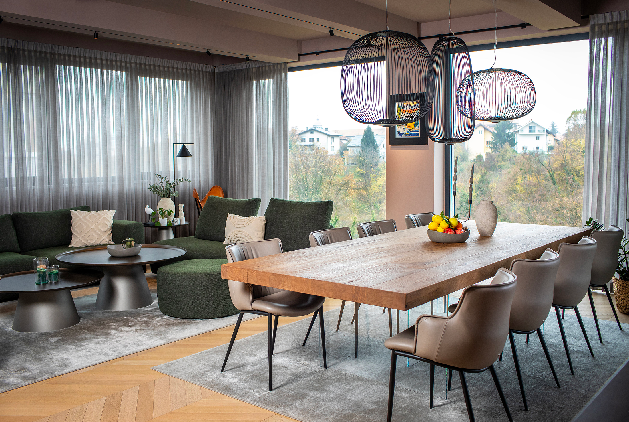 The apartment is located on a set-back, courtyard-facing site on Srebrnjak Street, a new building on a slope with a view of a green valley. The entrance to the apartment is centrally located, which clearly divides the apartment into a living and sleeping zone. It is oriented in all four cardinal directions, but the orientation and placement of the living area toward the west dominate, due to its unique