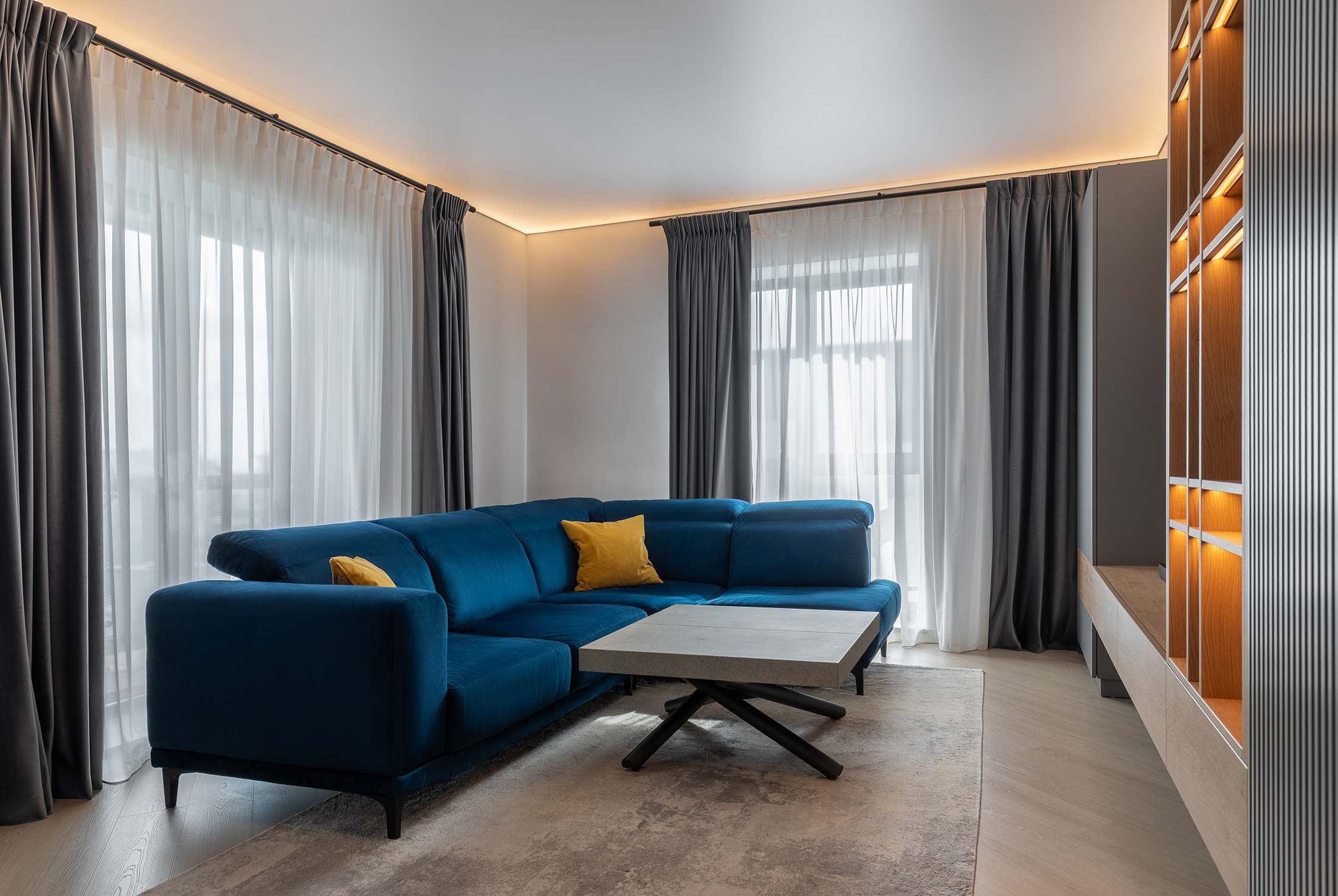 "Escala - popas intre destinatii" is a project designed for a young couple passionate about travel and aviation. The apartment reflects their dynamic lifestyle: organized, contemporary, yet warm and welcoming. The interior design blends neutral shades of grey with carefully placed bold accents that add energy and personality to every space. Soft textures, layered lighting, and curated furniture pieces create a balanced and relaxing atmosphere. More than just a
