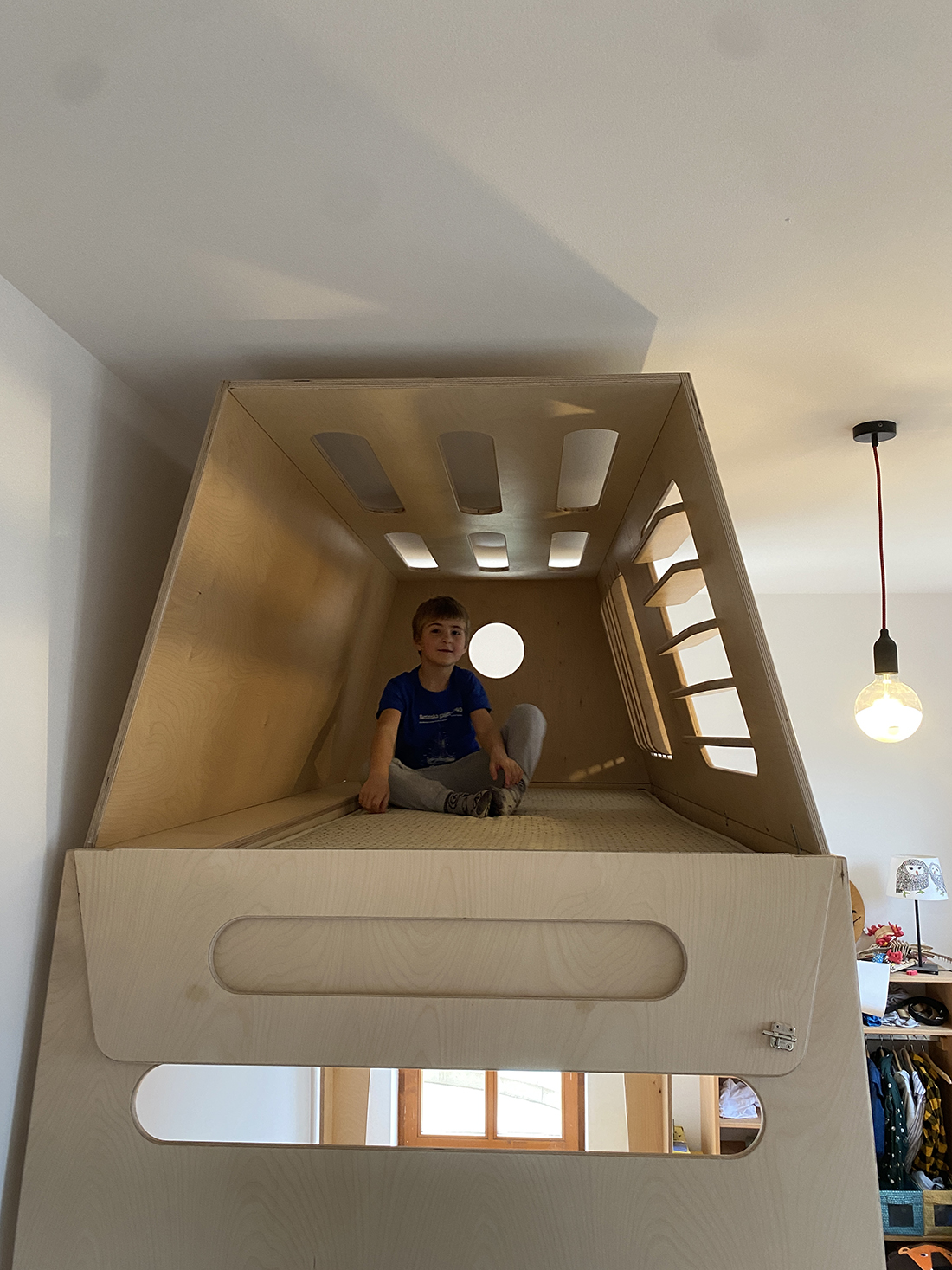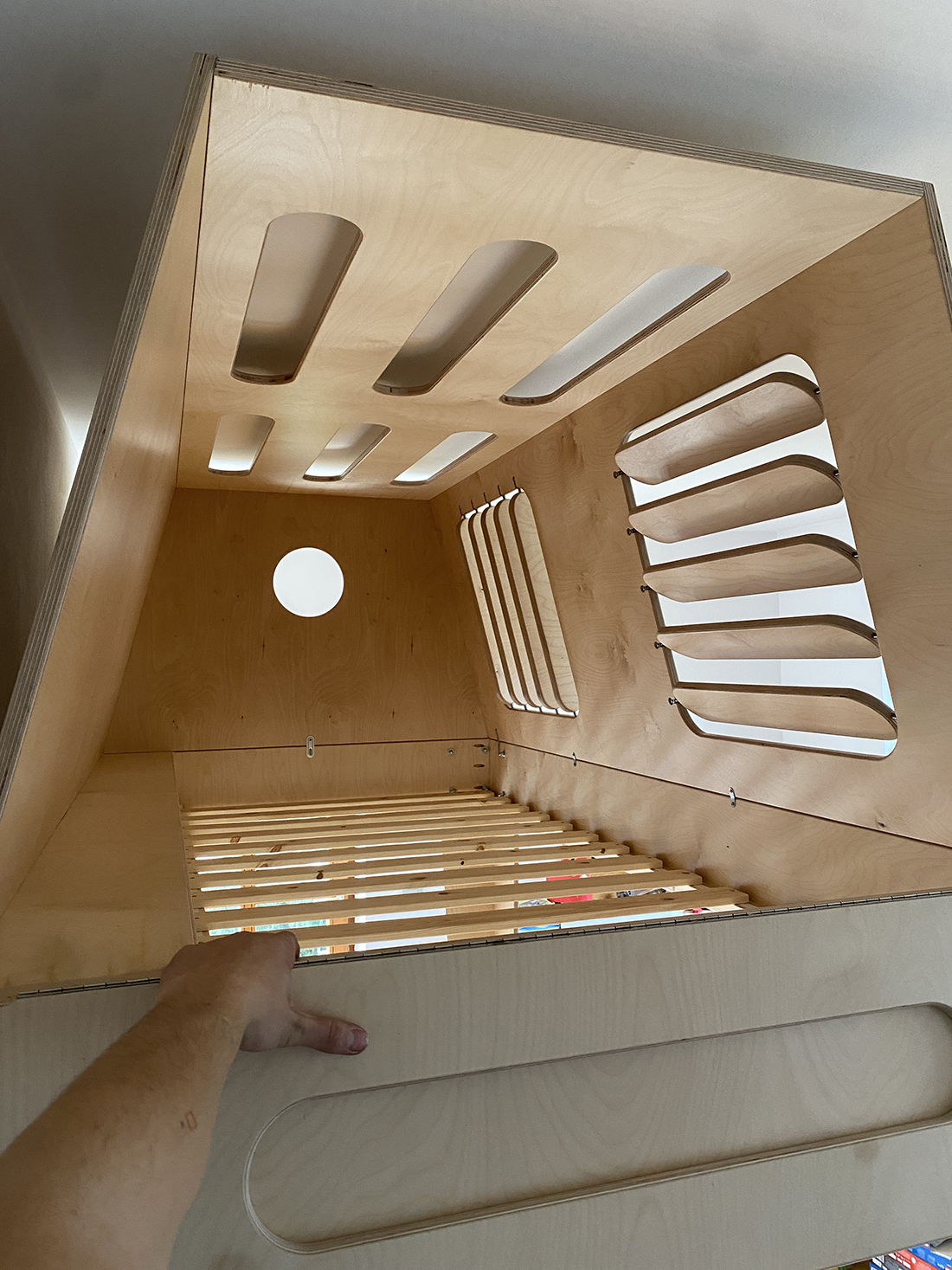 The material choice is birch plywood, for the feeling of warmth, and tactility of a soft natural material. The "window" blinds are rotatning shingles that can open or close, and the whole roof is easily removeable for the moment in which he outgrows the structure.